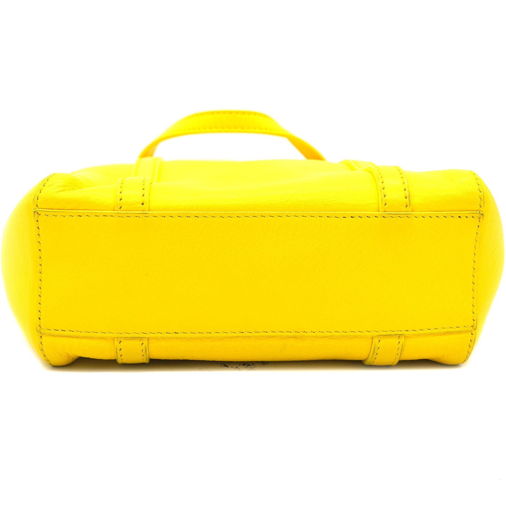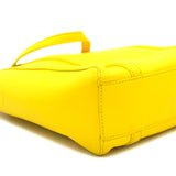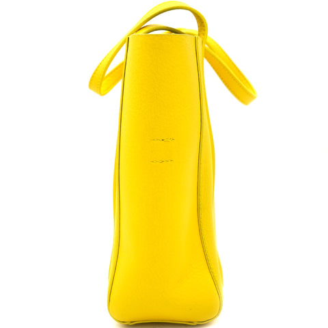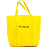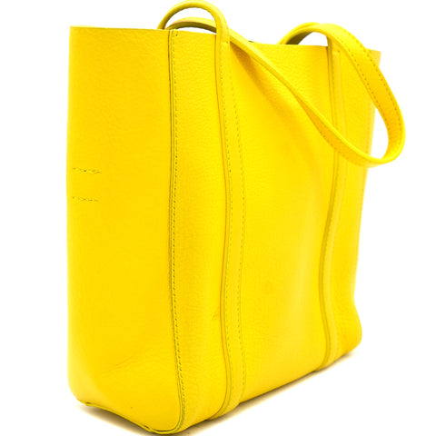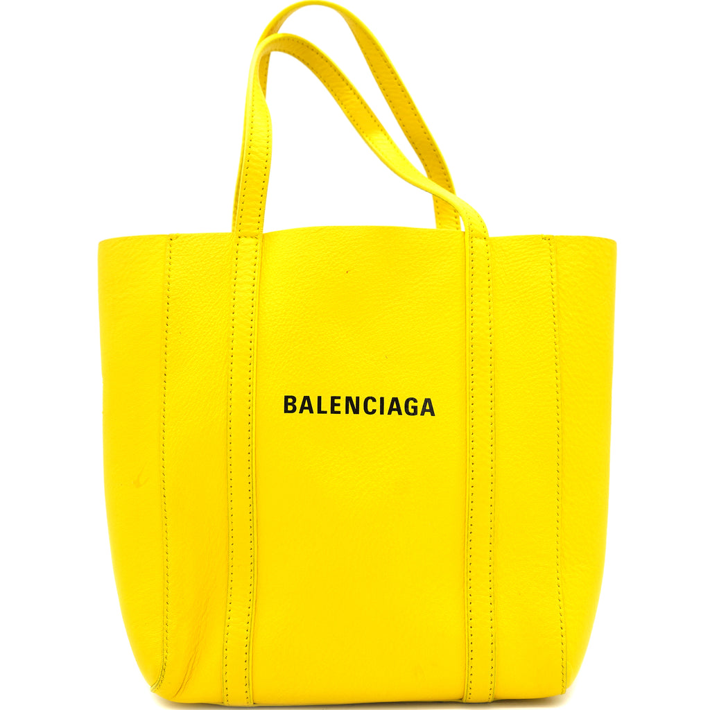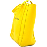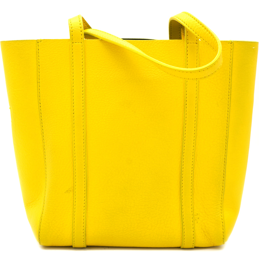 This stylish tote is crafted of luxuriously calfskin leather in yellow with the Balenciaga logo printed in white letters. The handbag features matching top handles, an optional shoulder strap, and polished silver hardware. The top opens to a grey leather interior with a hanging zipper pocket.