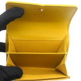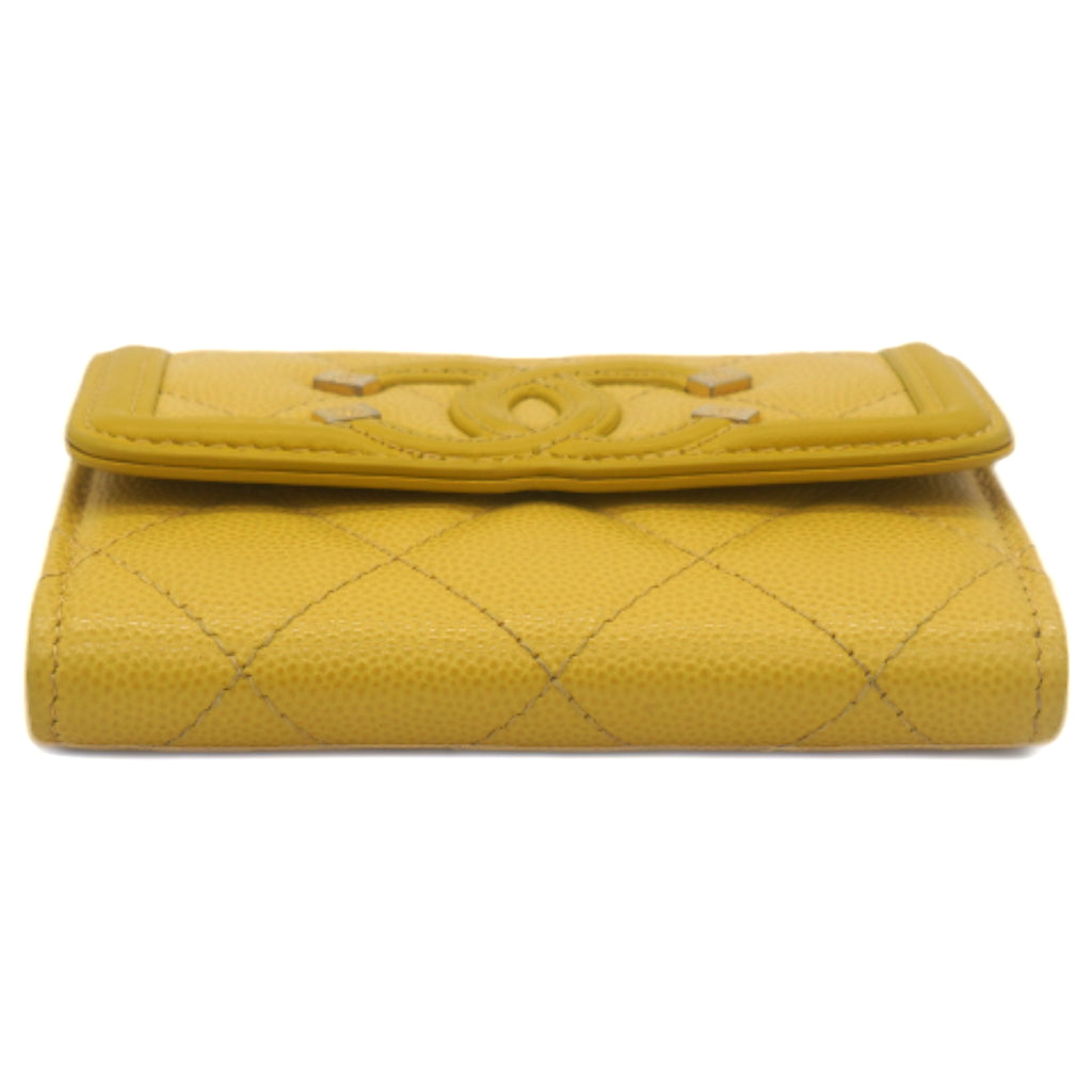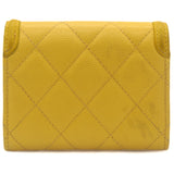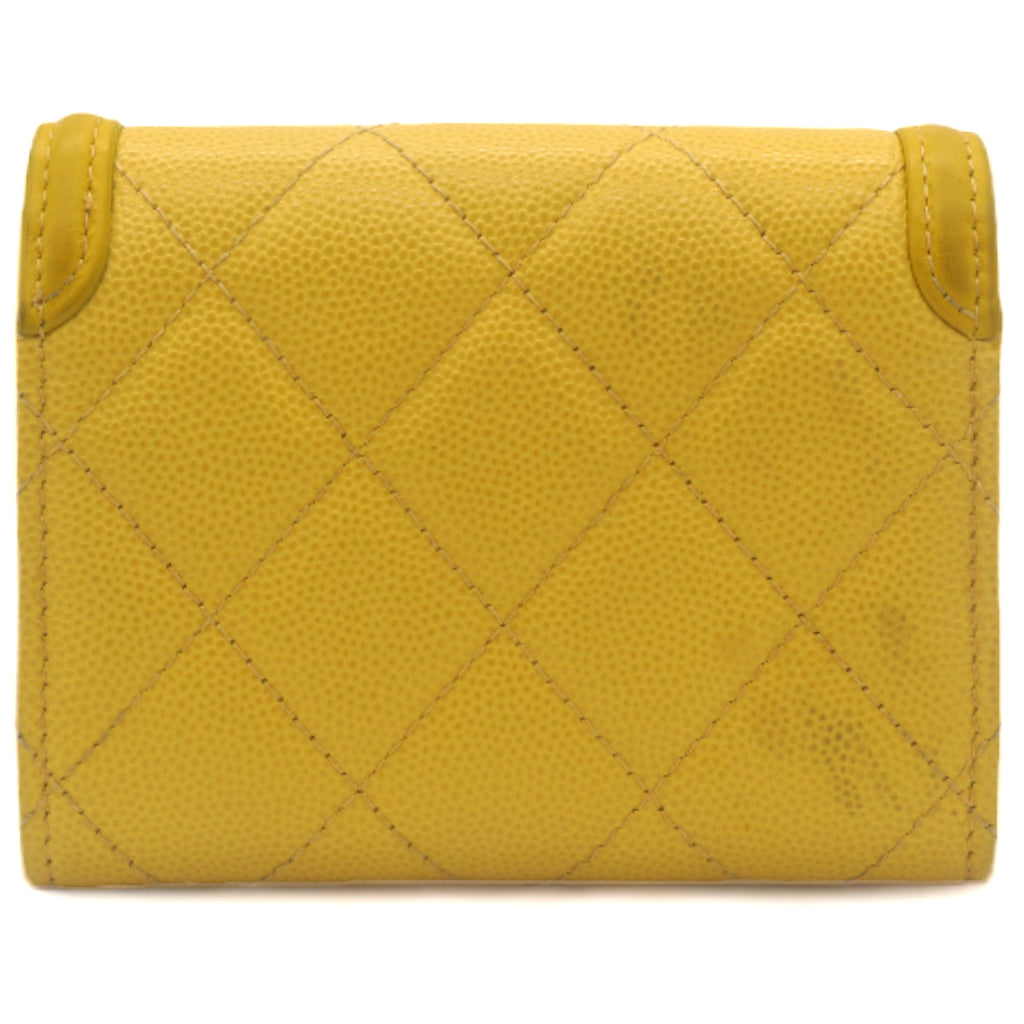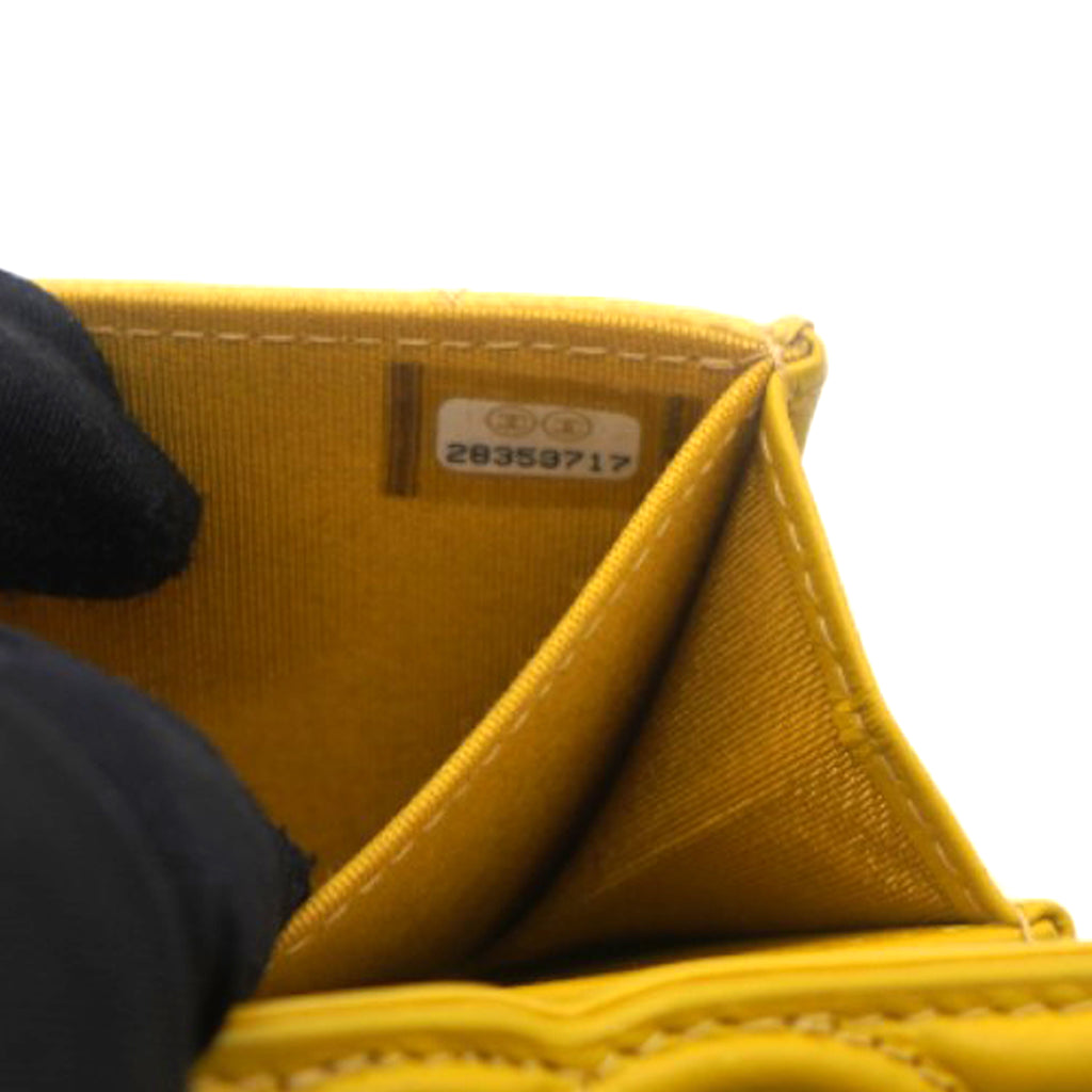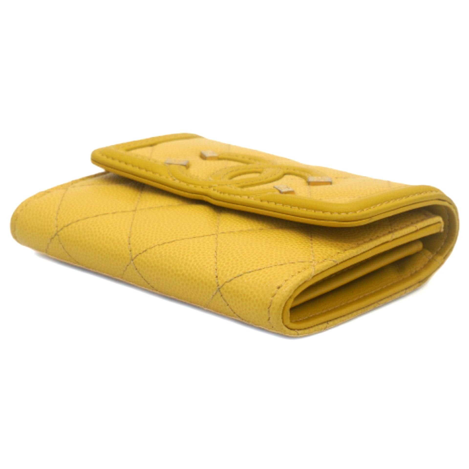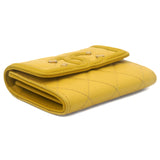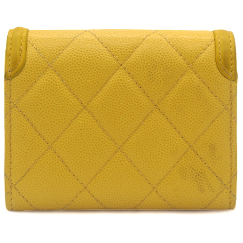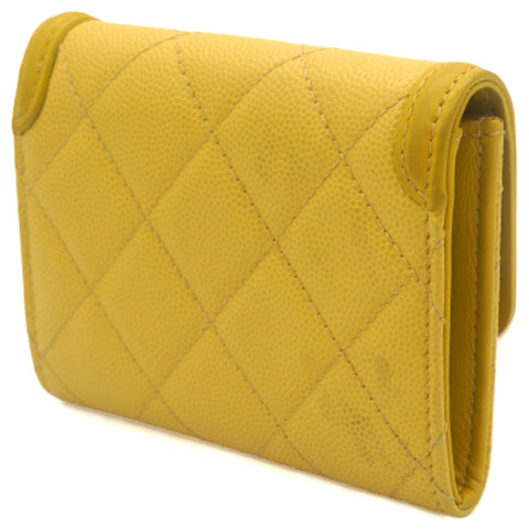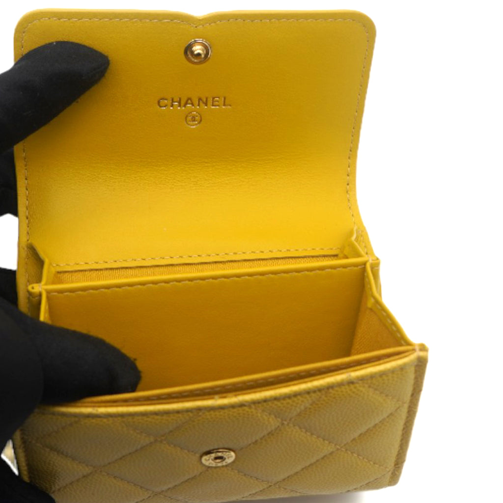 | This stylish wallet is crafted of beautiful diamond quilted caviar leather in yellow features a large Chanel CC stitched logo on the flap with light gold tips. The wallet opens to a partitioned yellow fabric interior three card slots |