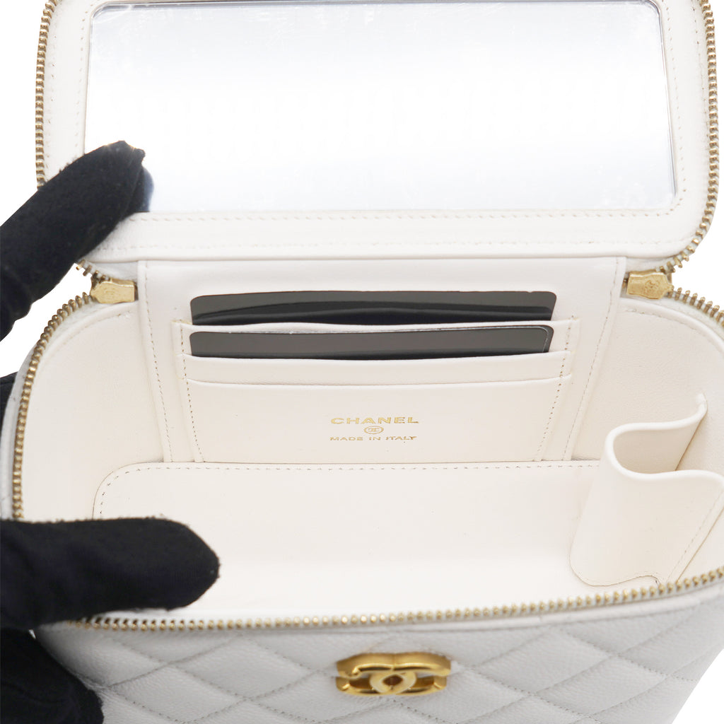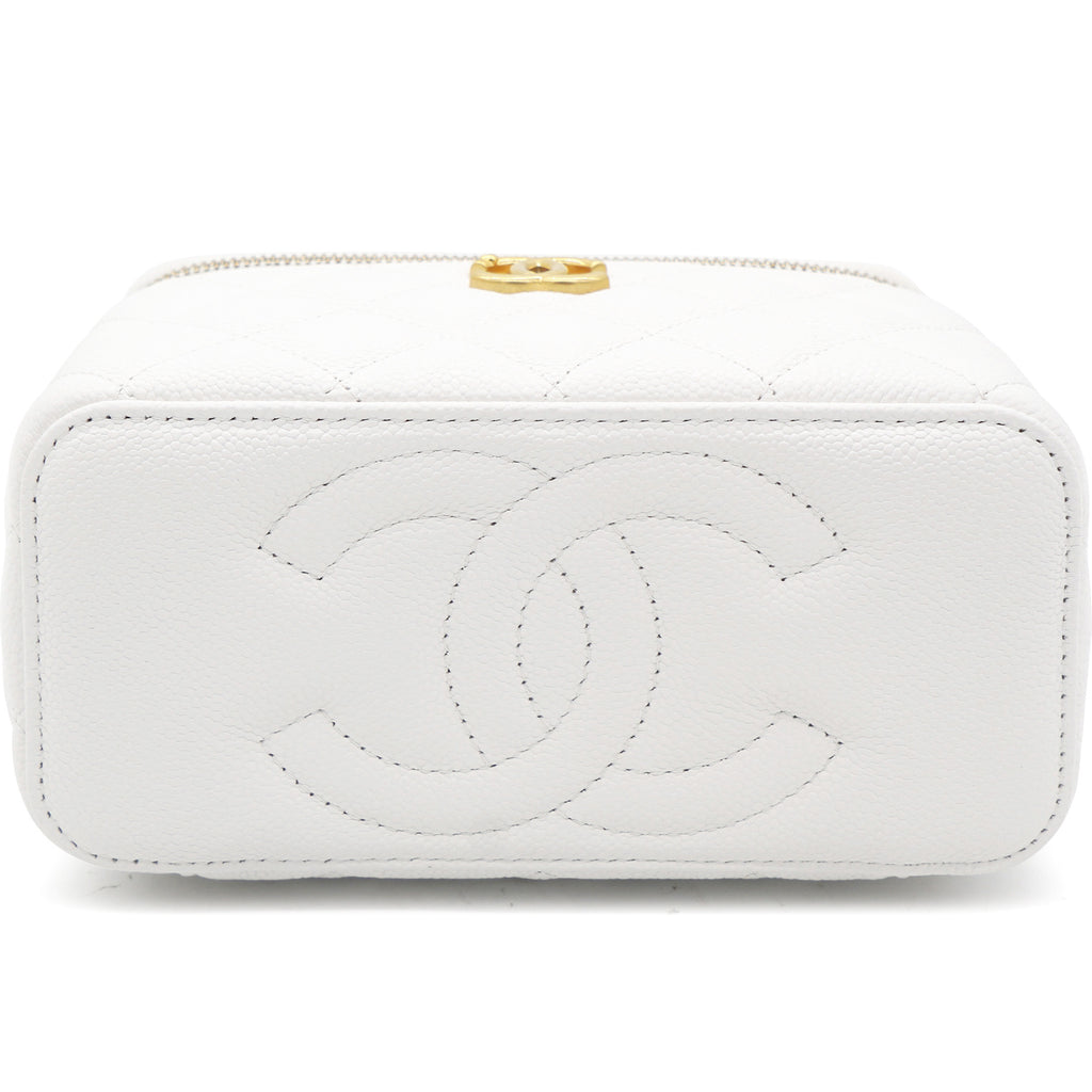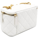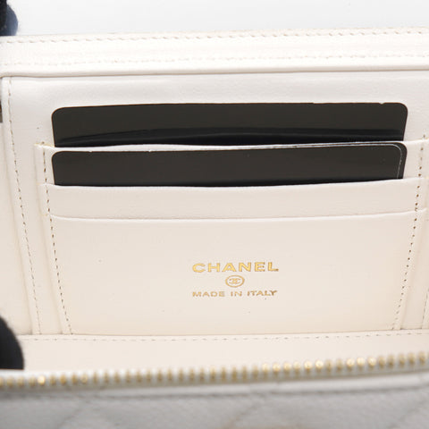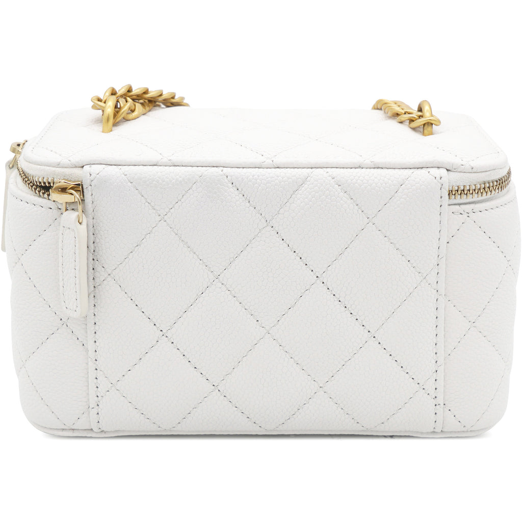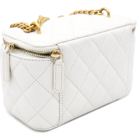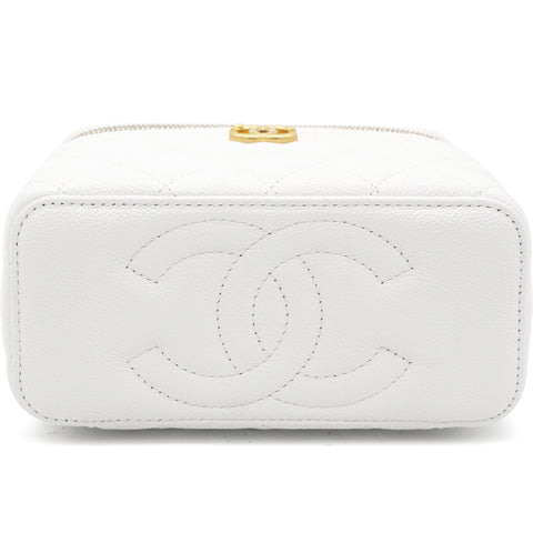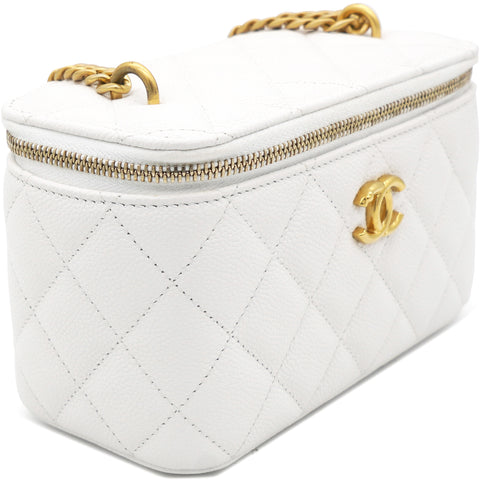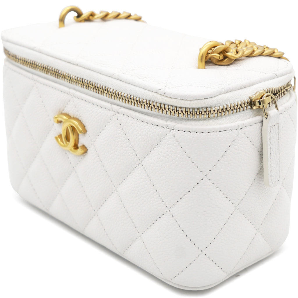 | This stylish crossbody is crafted of luxurious caviar leather in highly coveted white. It features an aged gold chain-link shoulder strap and aged gold heart hardware to adjust the strap. The handbag features a 3/4 wrap-around zipper that opens to a metallic gold fabric interior. |