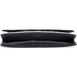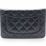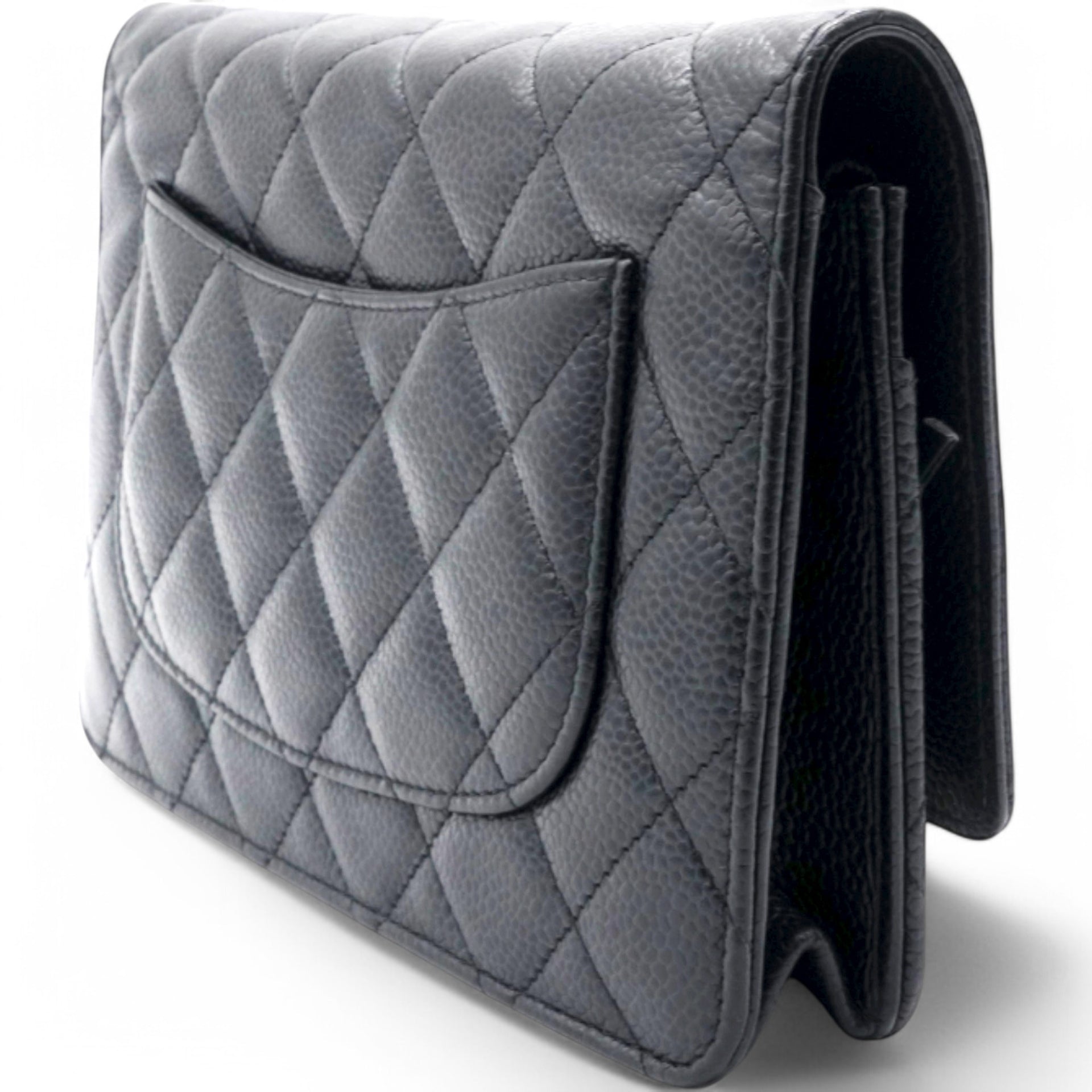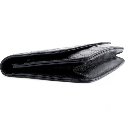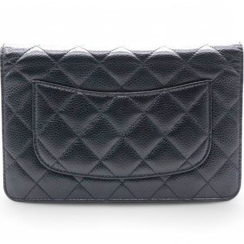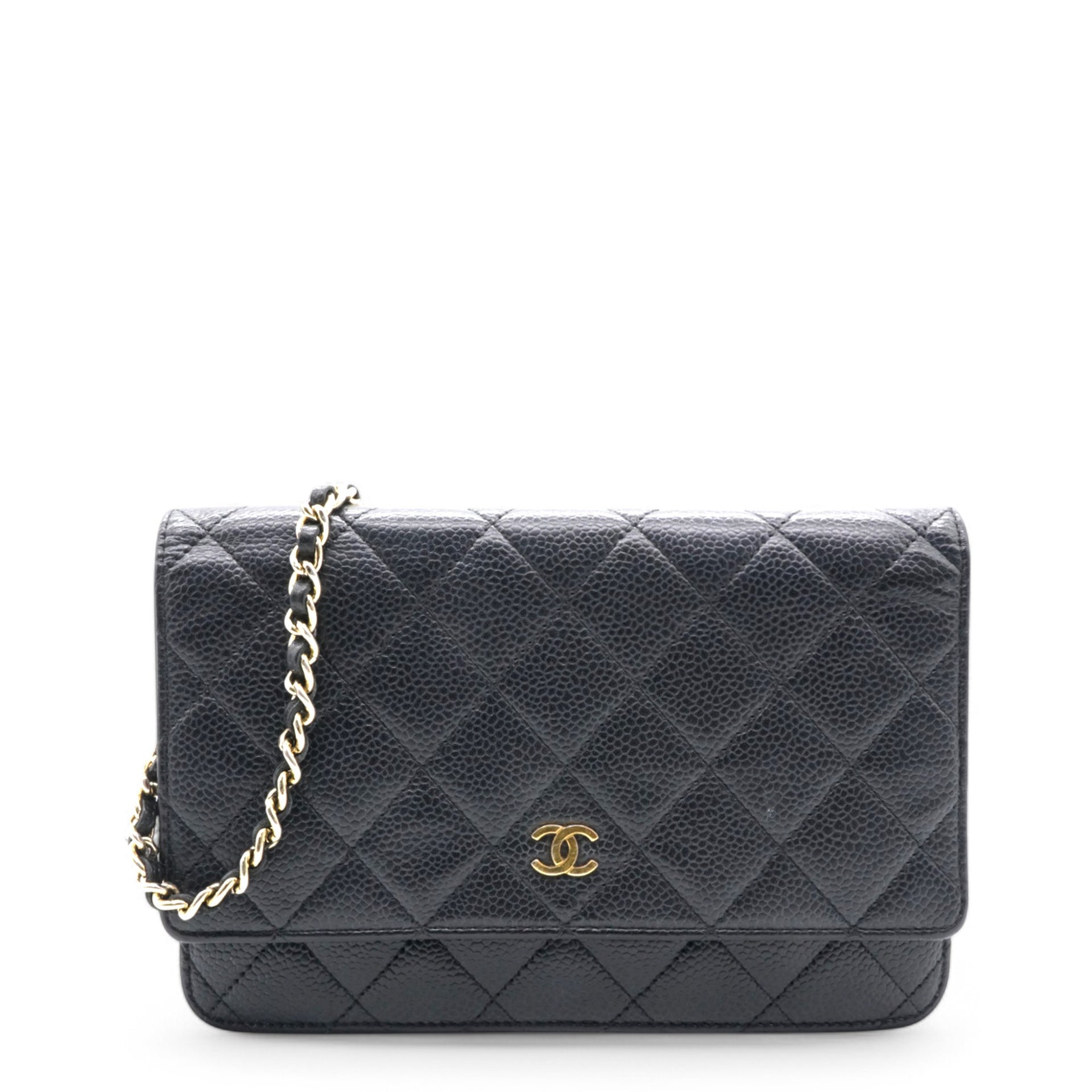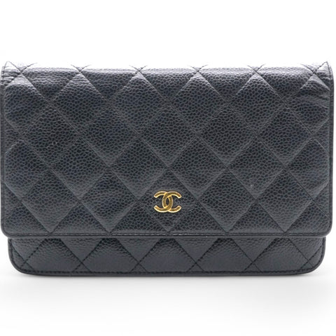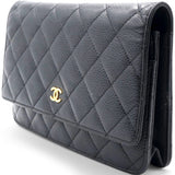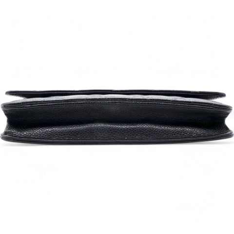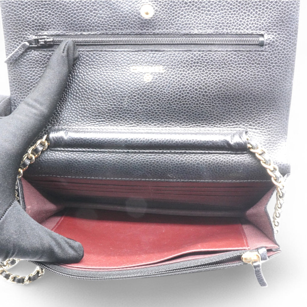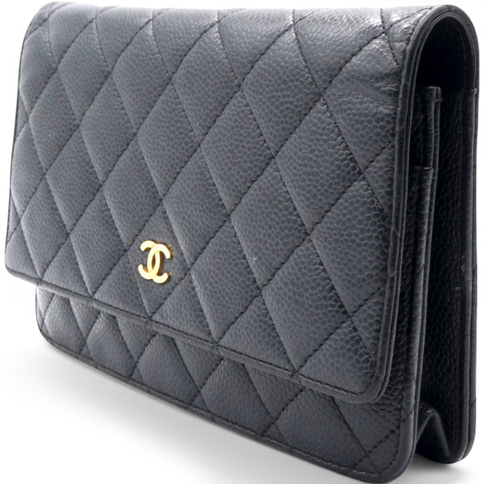 | This stylish wallet is crafted of luxuriously textured diamond quilted caviar leather in black. This shoulder bag features a gold chain-link crossbody strap and a Chanel CC logo on the facing flap. The bag opens to a burgundy fabric interior with a zipper compartment, card slots, and a leather patch pocket. |
