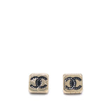 Glam up your look instantly with these stunning earrings from the house of Chanel. It features a square silhouette with 'CC' with crystals and frame detailing in metal. It is secured with push-lock closures. Style it with a simple blouse for a classic look.