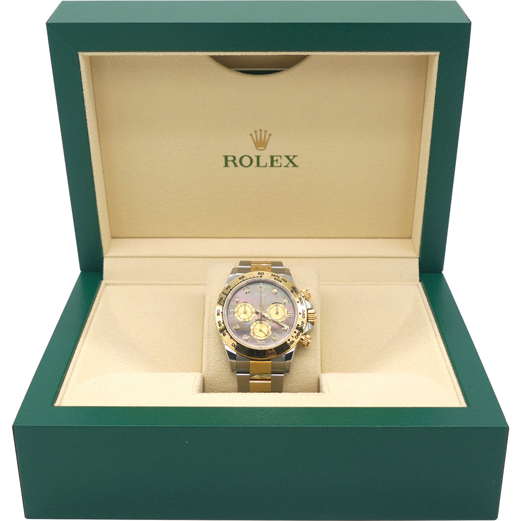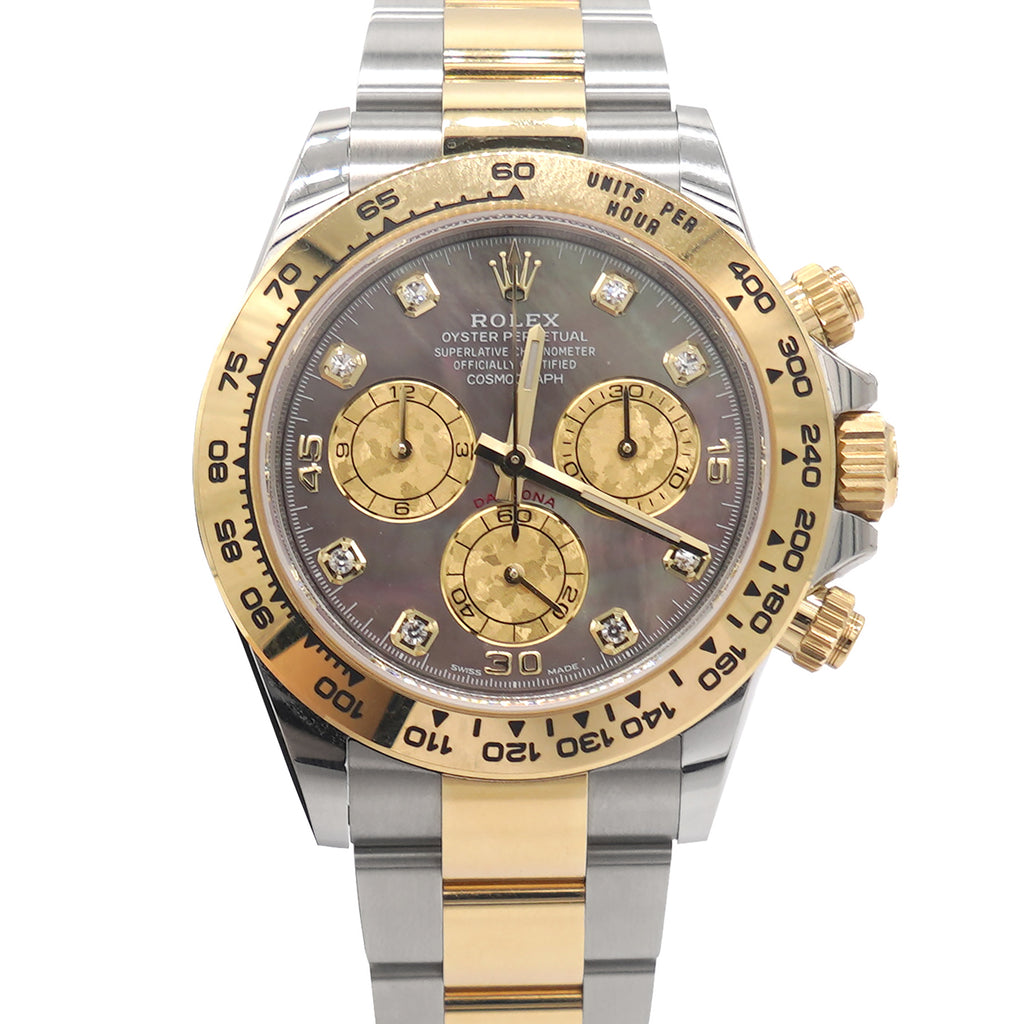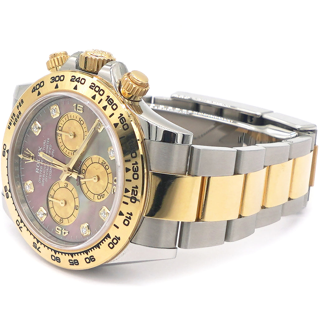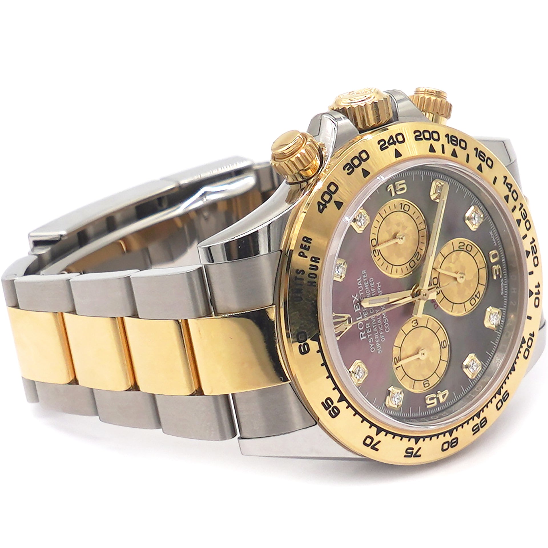 | This oyster perpetual cosmograph daytona in oystersteel and yellow gold, with a grey mother of pearl and diamond marks dial and an oyster bracelet, features a yellow gold bezel with engraved tachymetric scale. |