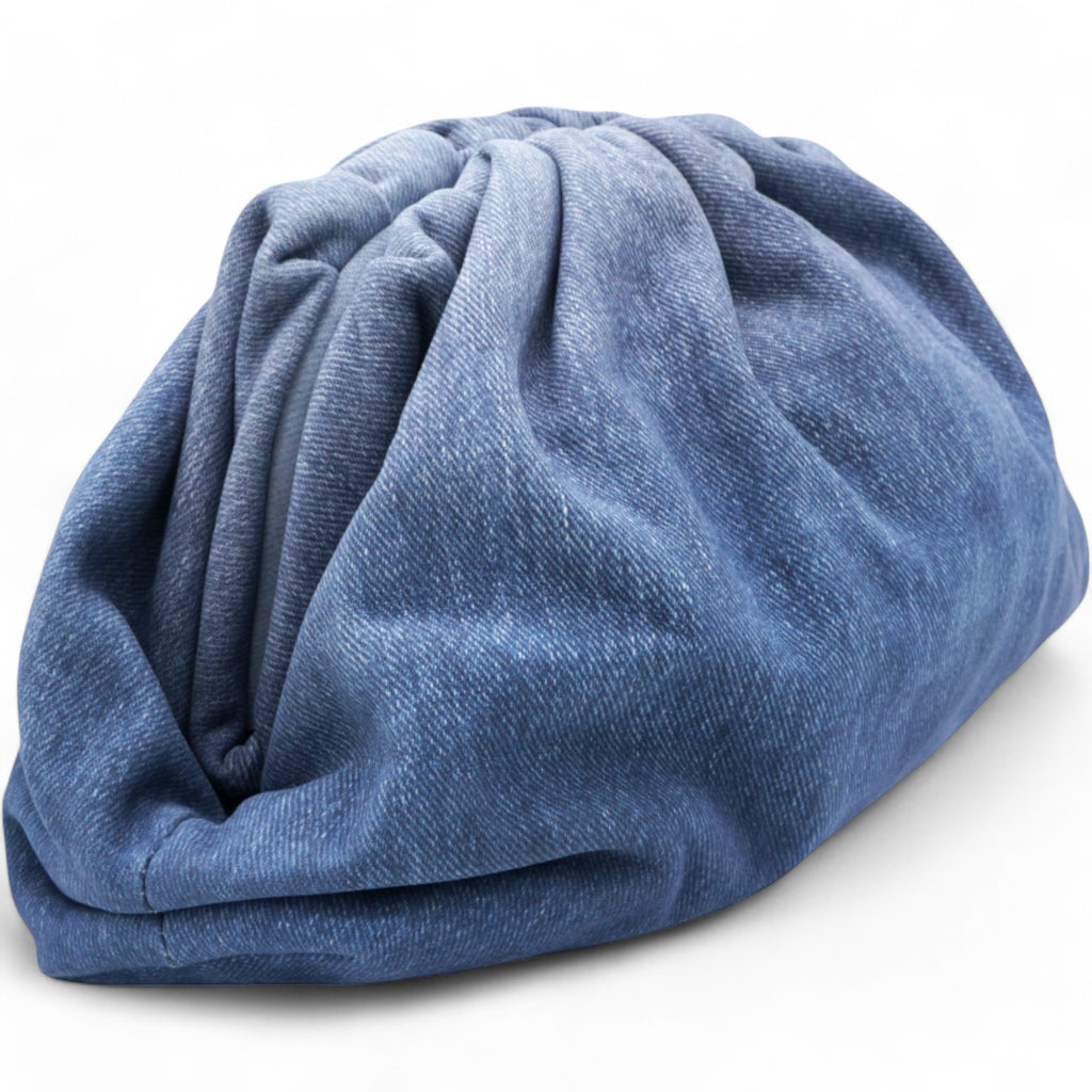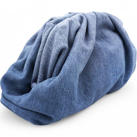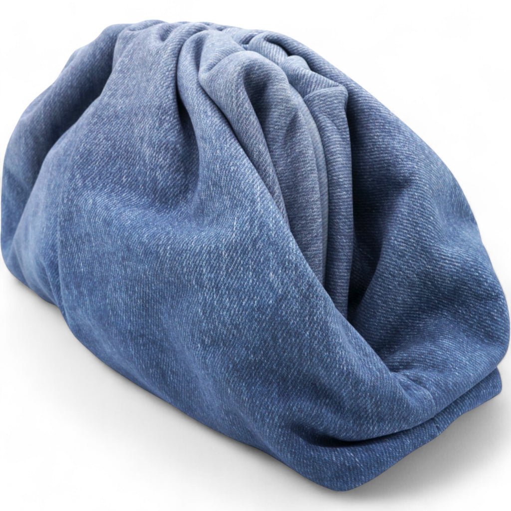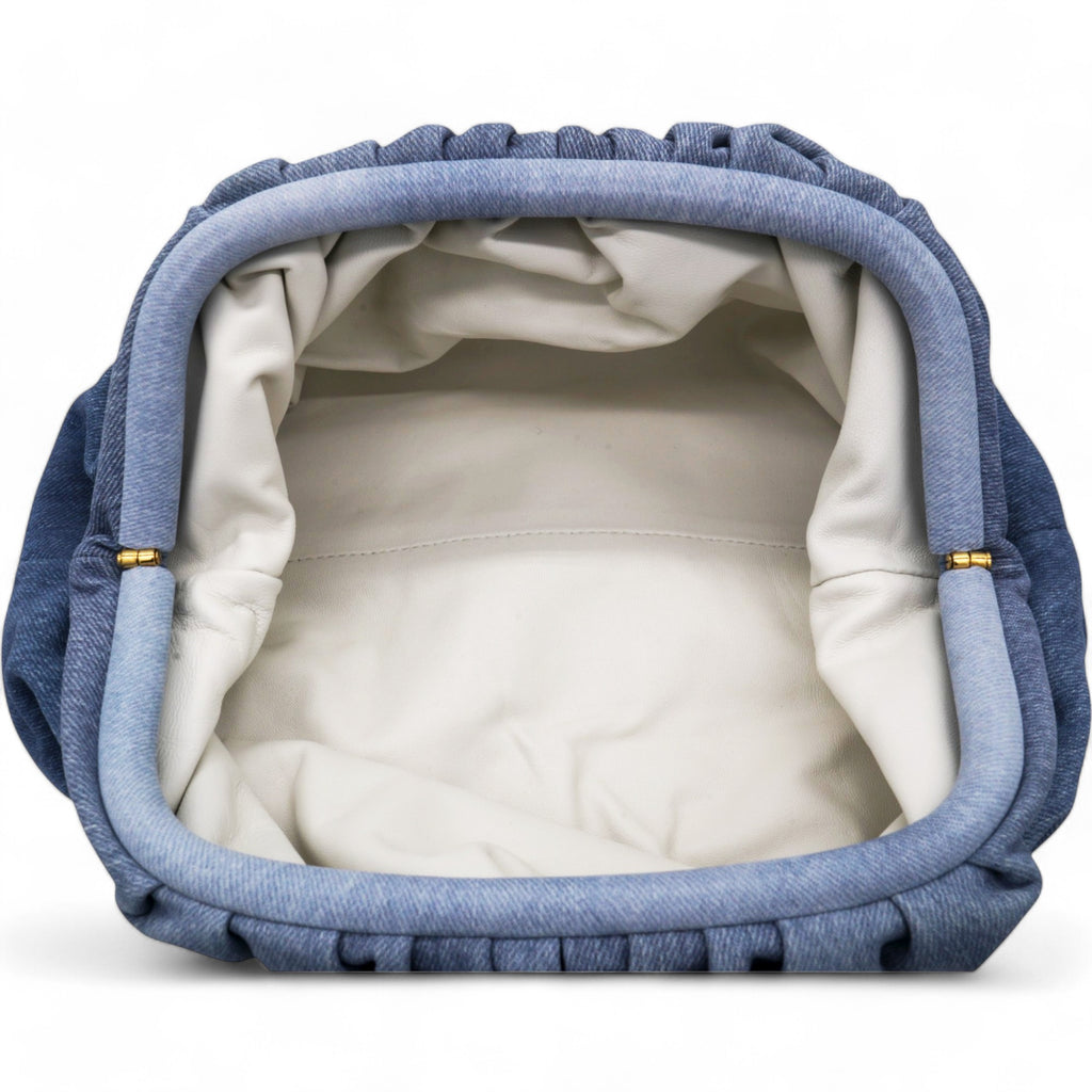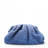 This stylish clutch is crafted of suede leather in a blue denim effect. The bag features a ruched leather magnetic top that opens to a white leather interior.