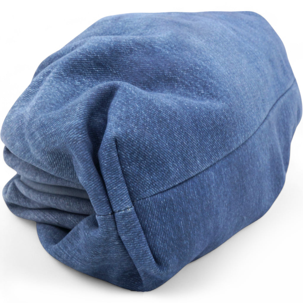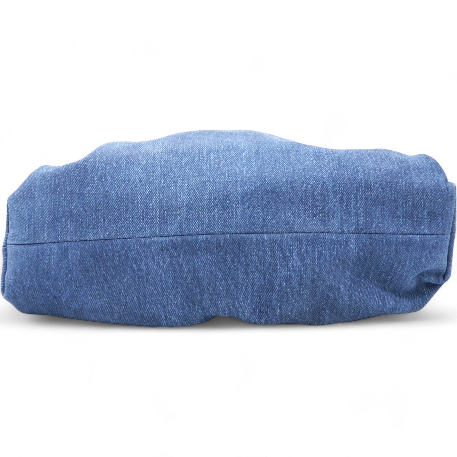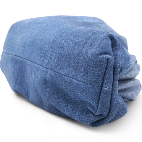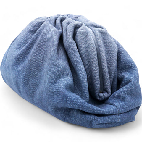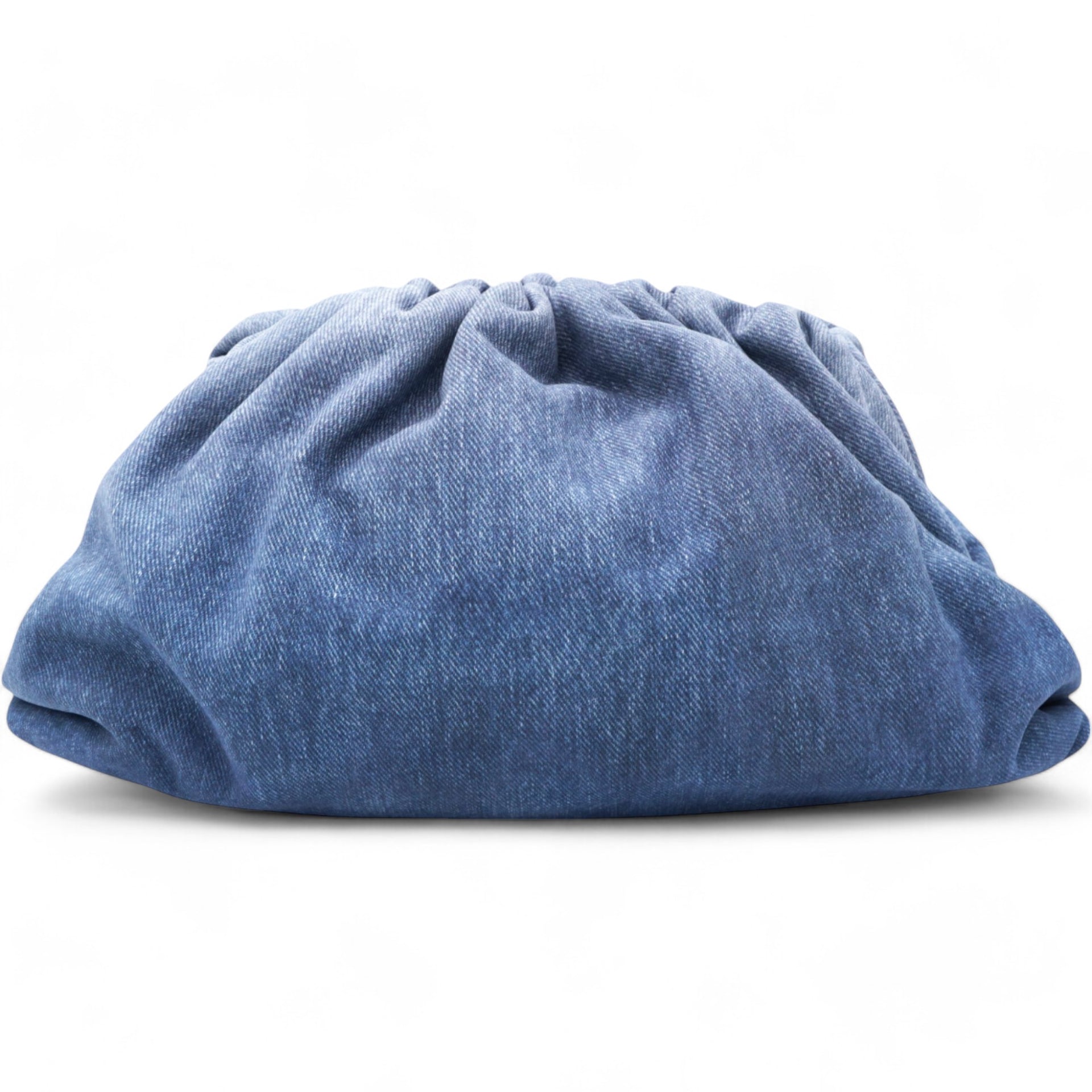 This stylish clutch is crafted of suede leather in a blue denim effect. The bag features a ruched leather magnetic top that opens to a white leather interior.