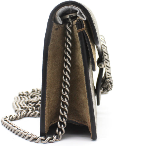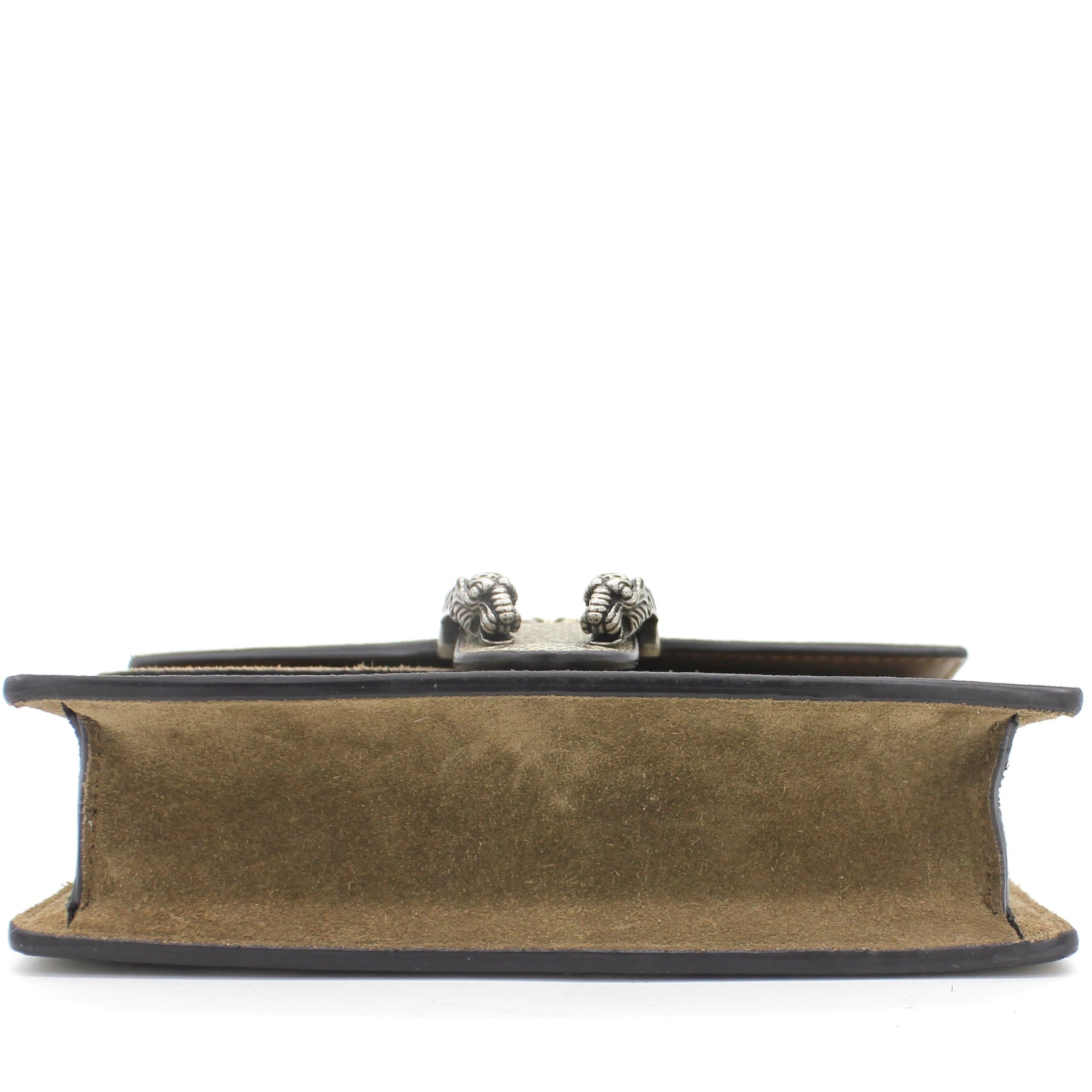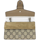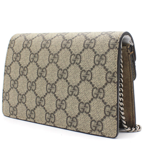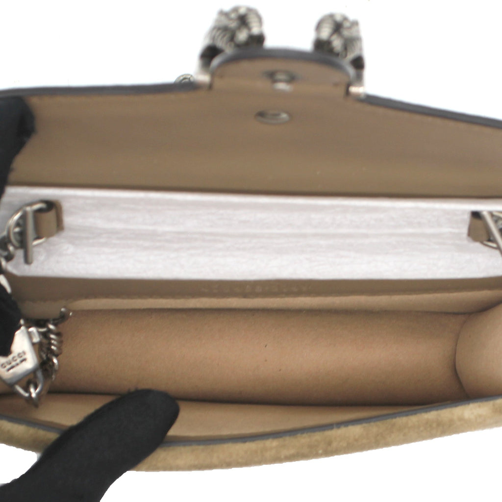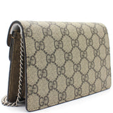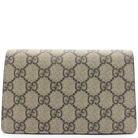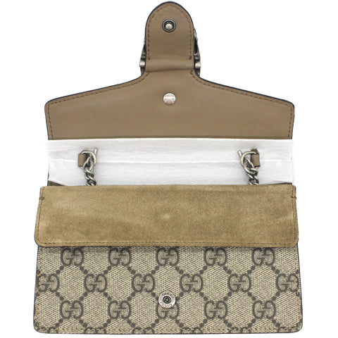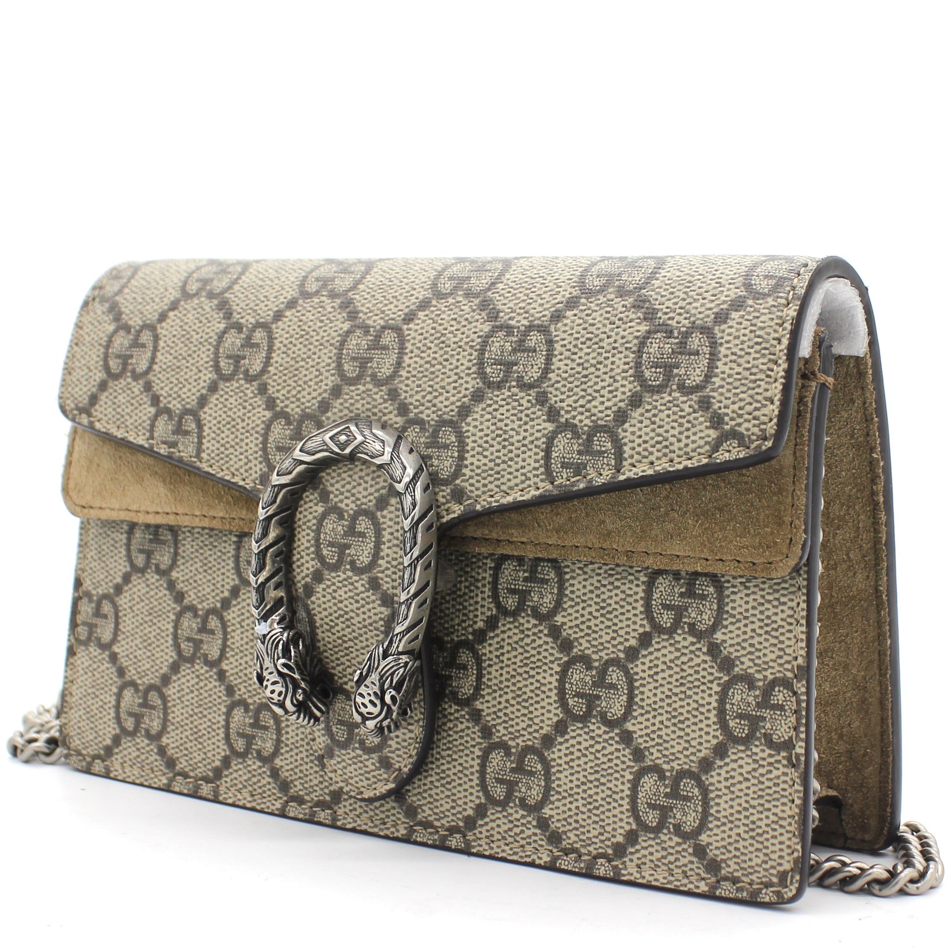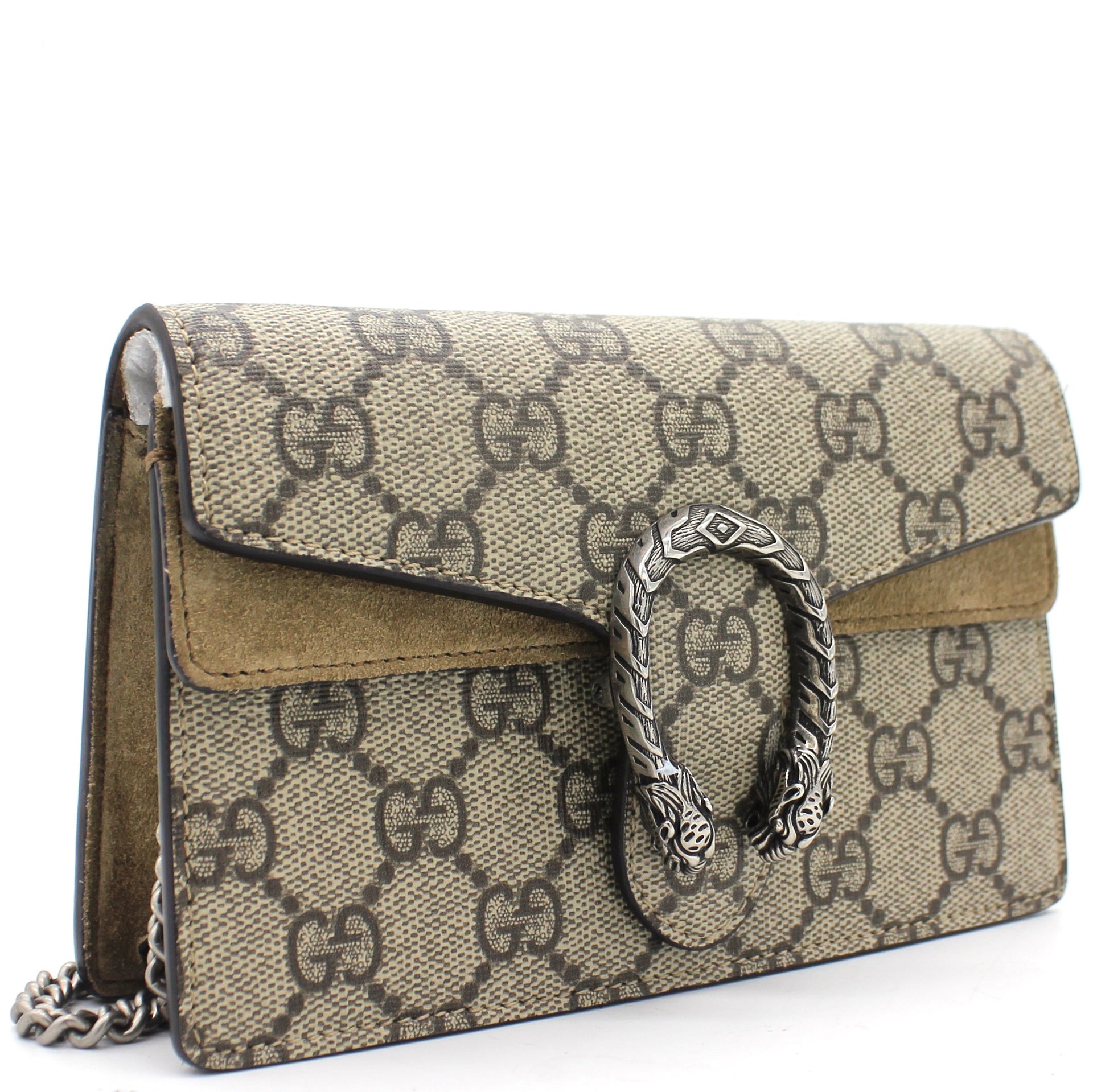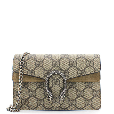 | A structured GG Supreme canvas chain super mini shoulder bag with a key ring that can be used to attach this bag to a separate larger bag. The closure has the textured tiger head spur closure-a unique detail referencing the Greek god Dionysus, who in myth is said to have crossed the river Tigris on a tiger sent to him by Zeus. The accessory can also be worn as a crossbody bag. |