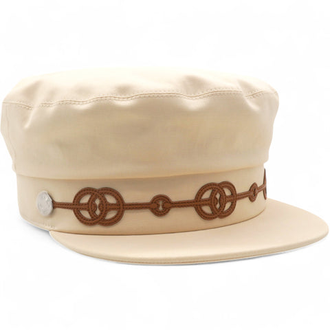 This is an authentic HERMES Double Linen Twill Casquette Cabourg Cliquetis Cap in White Creme. This lovely hat is crafted of light beige linen with a short brim and a twill lining.