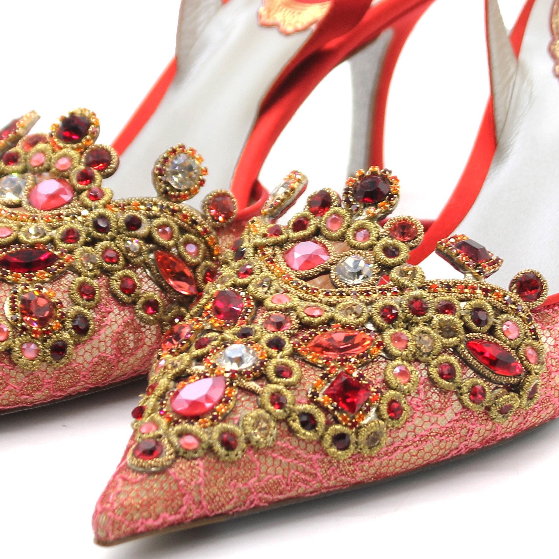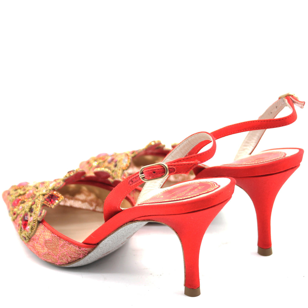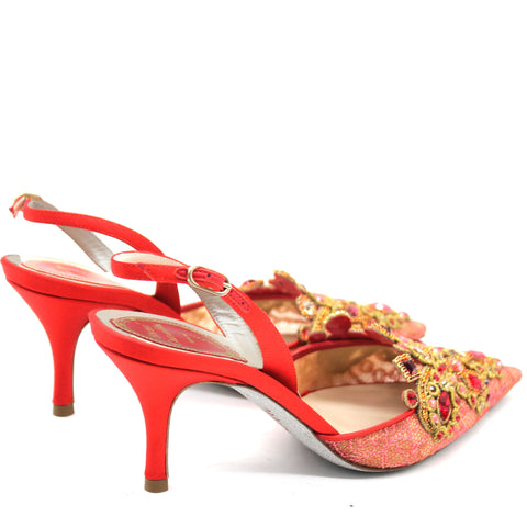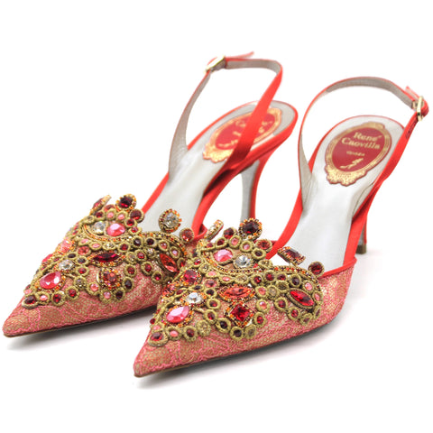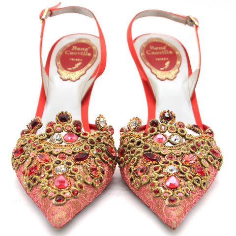 Red embellished pumps from René Caovilla featuring a pointed toe, rhinestone embellishments, lace panels, a slingback ankle strap, a branded insole and glitter details.