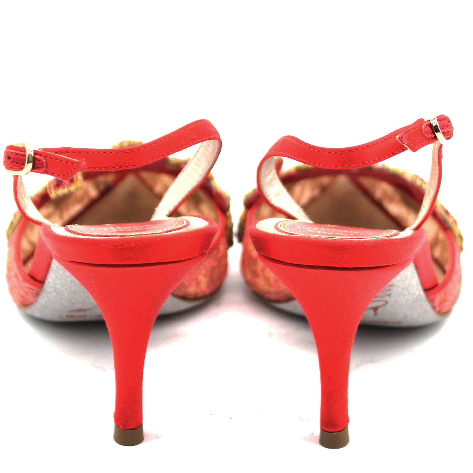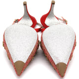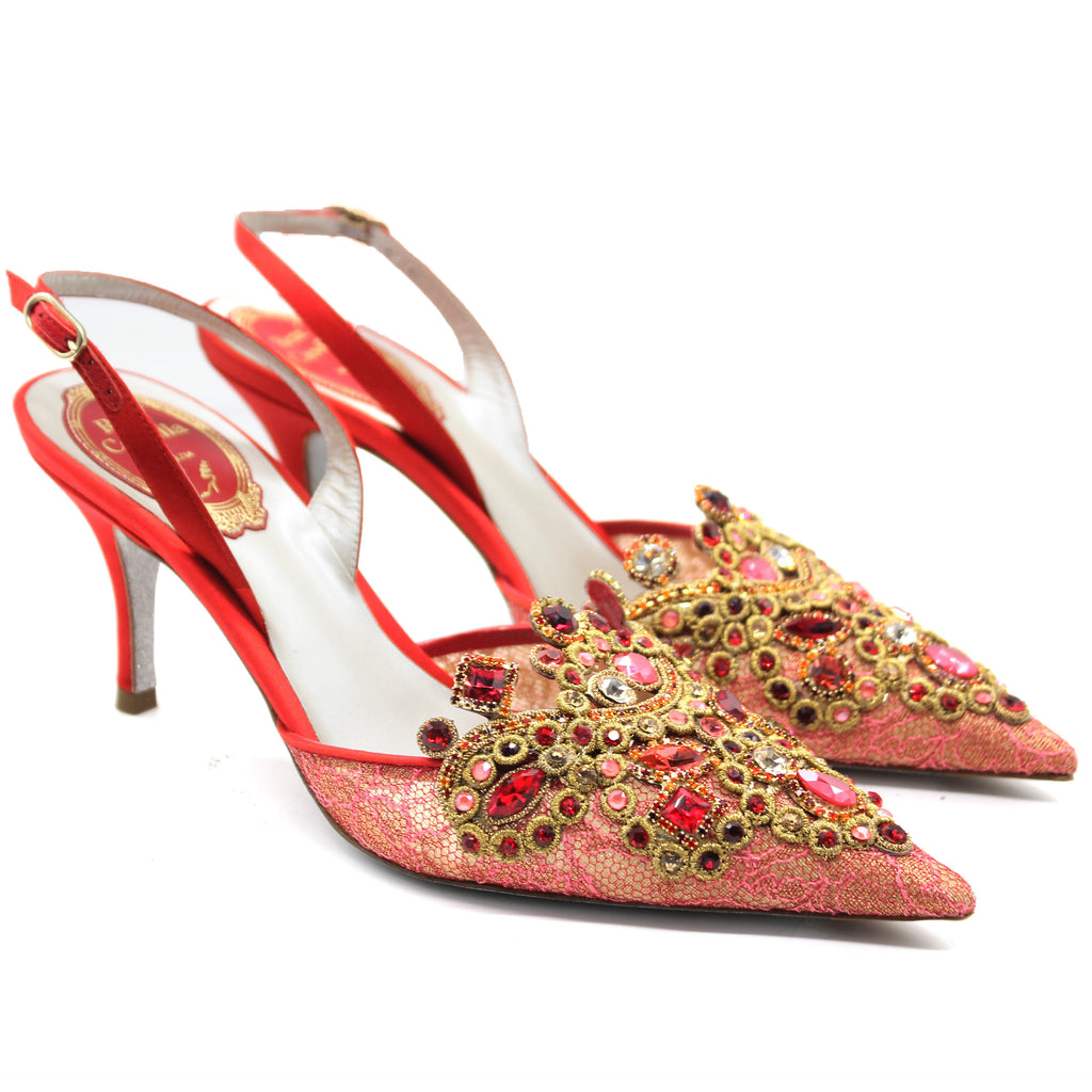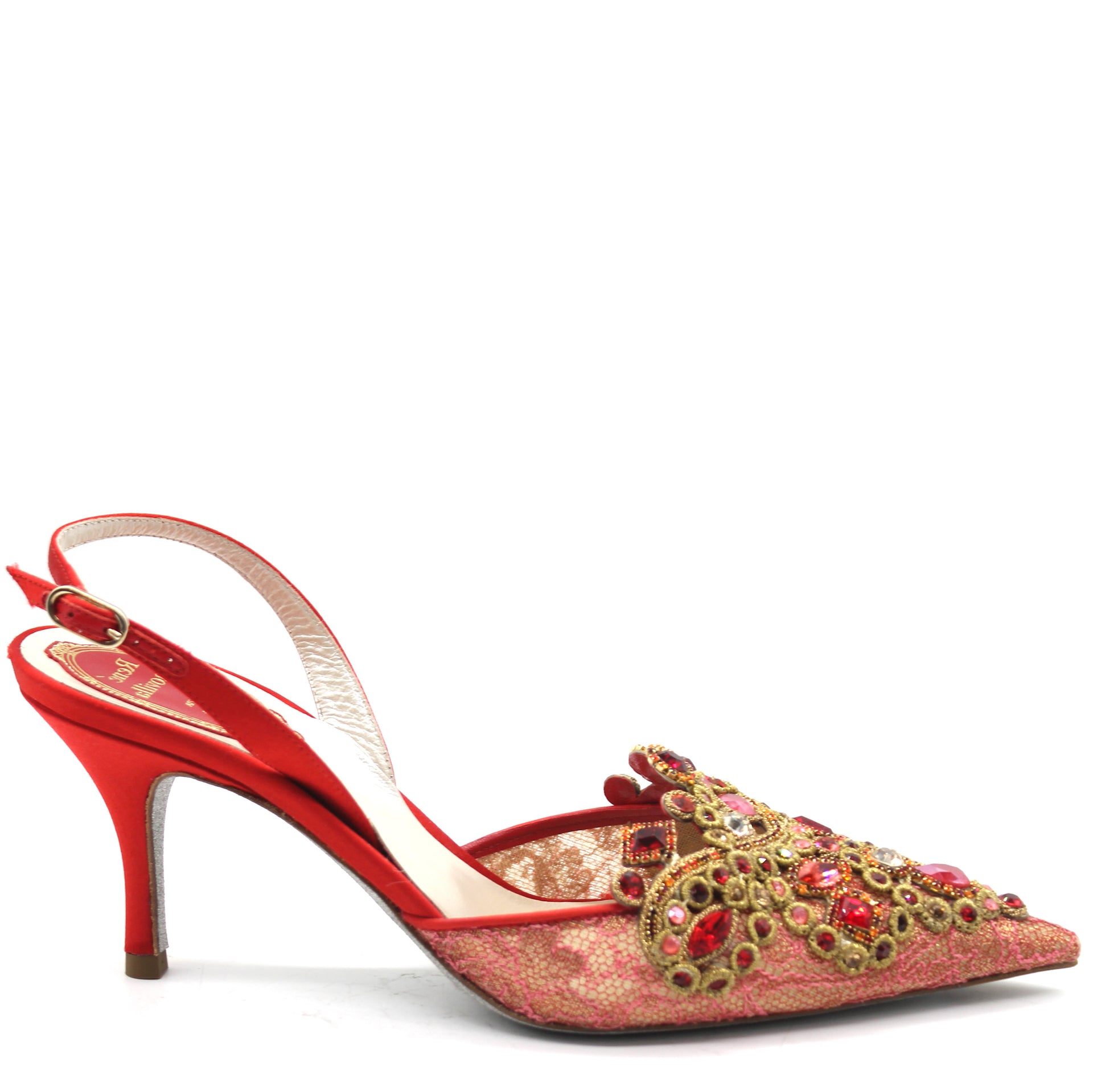 Red embellished pumps from René Caovilla featuring a pointed toe, rhinestone embellishments, lace panels, a slingback ankle strap, a branded insole and glitter details.