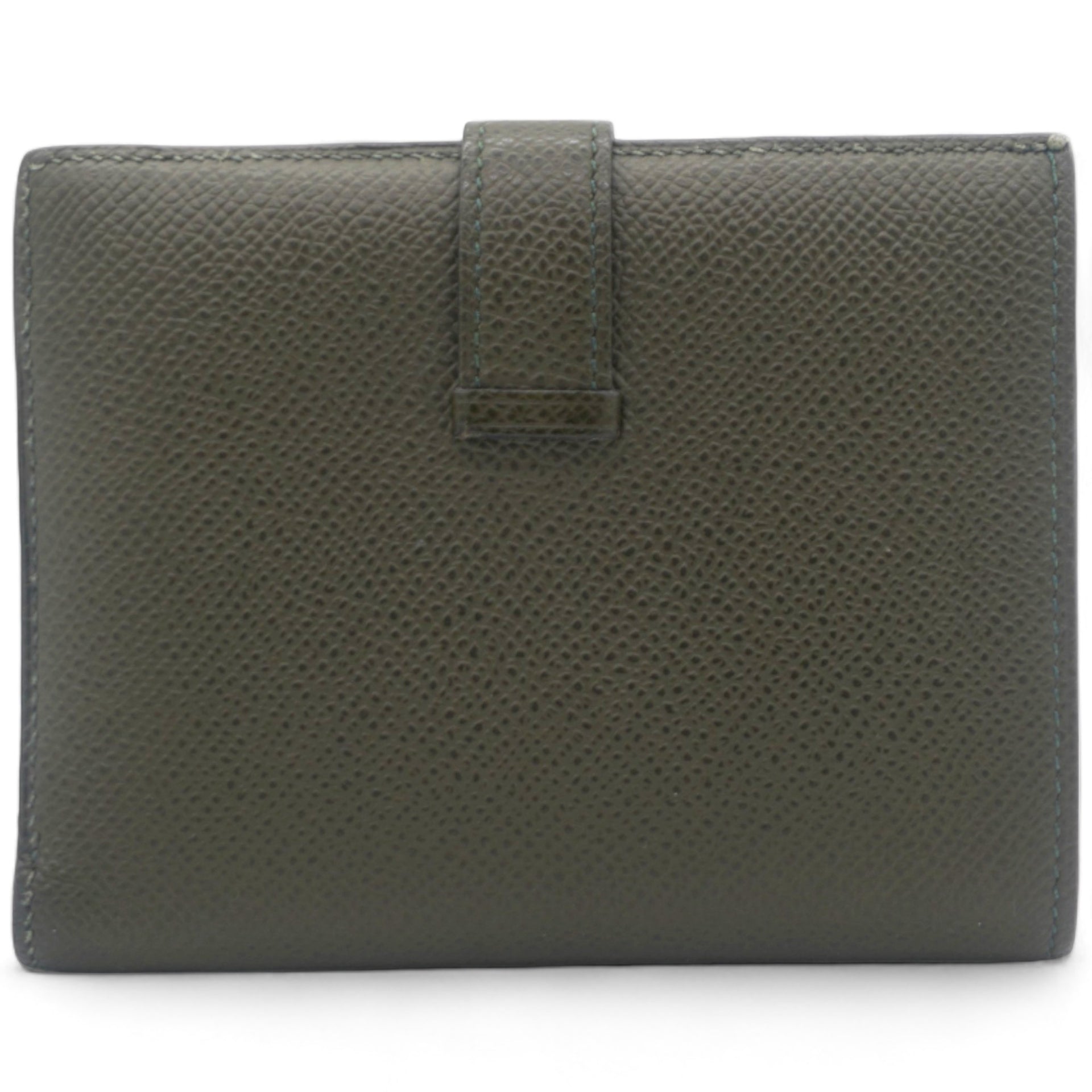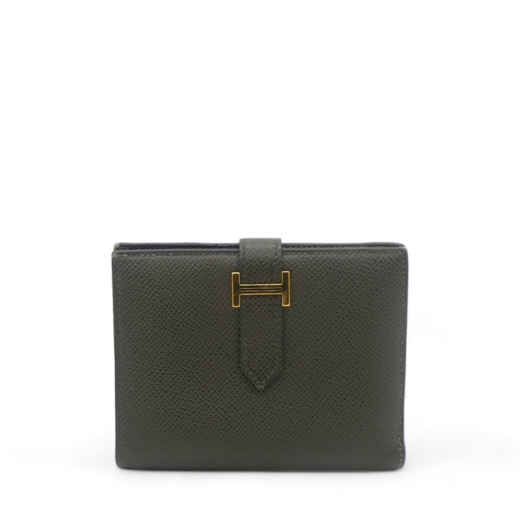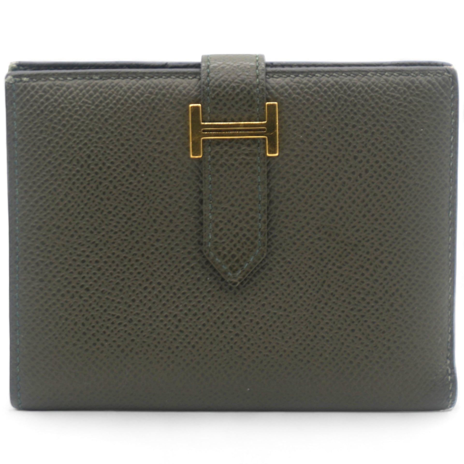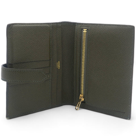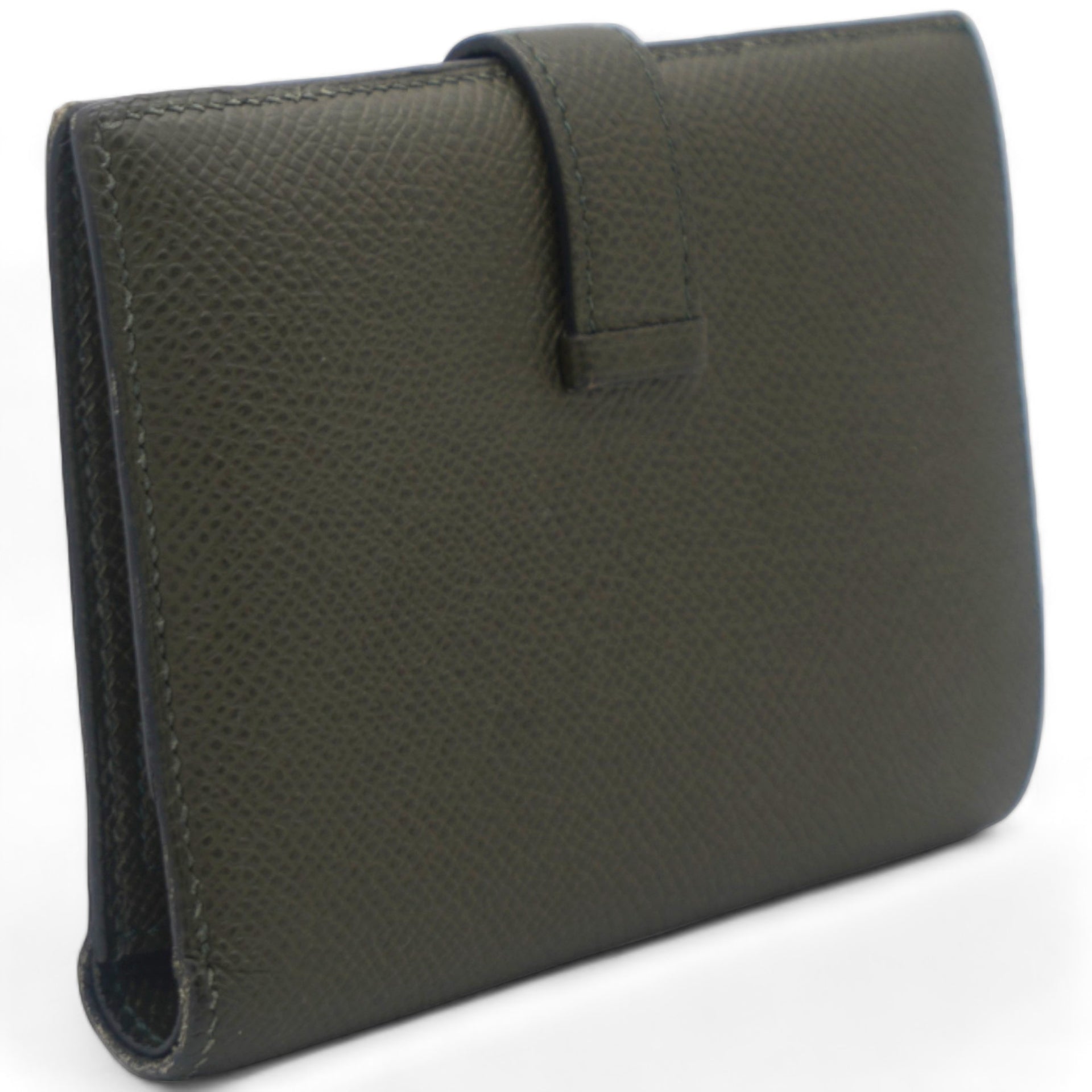 | This chic wallet is crafted of richly calfskin leather with a border of stitching, a cross over strap and a gold plated Hermes H clasp. The wallet opens to a matching leather interior with a card slot panel, patch pockets and a small zipper compartment. |