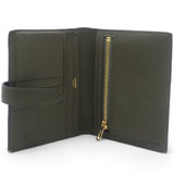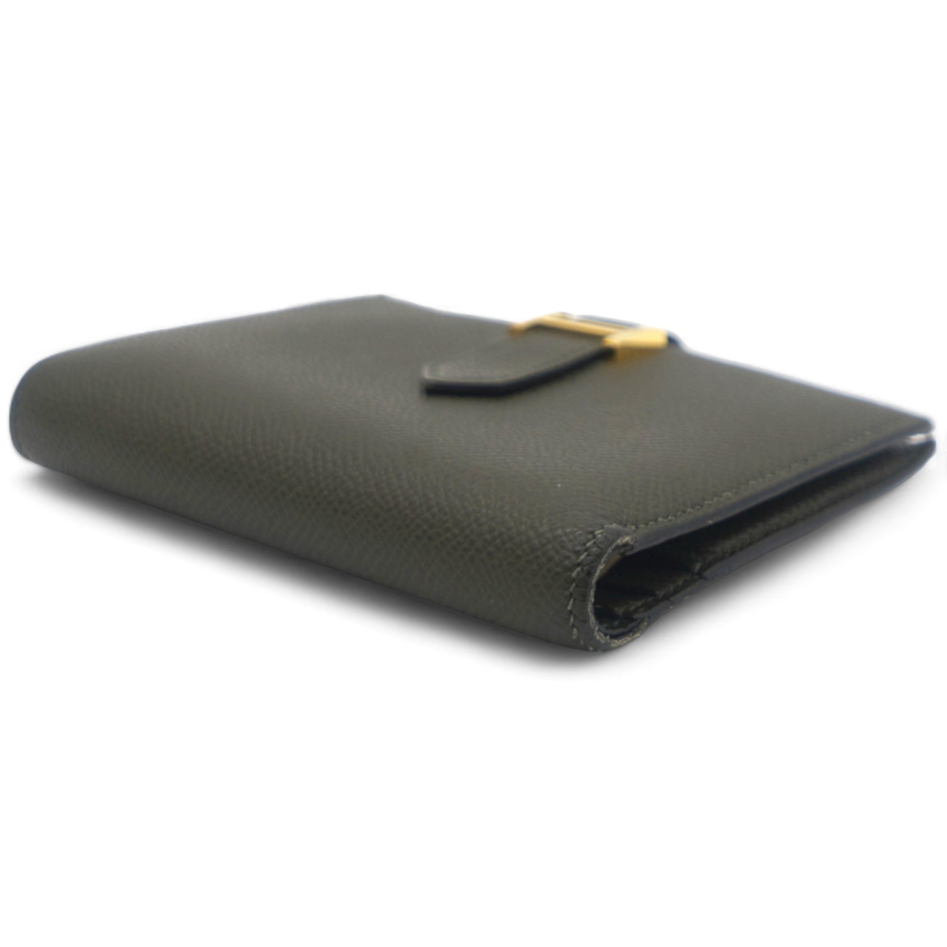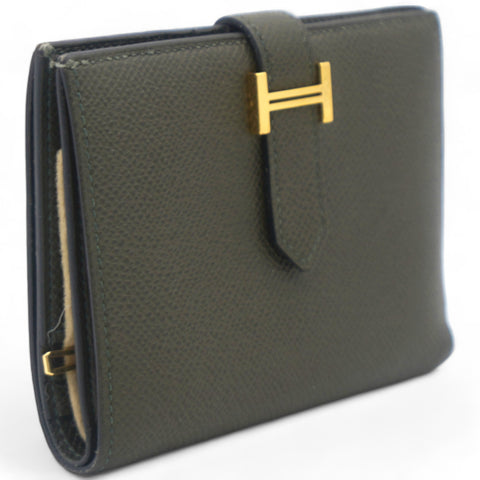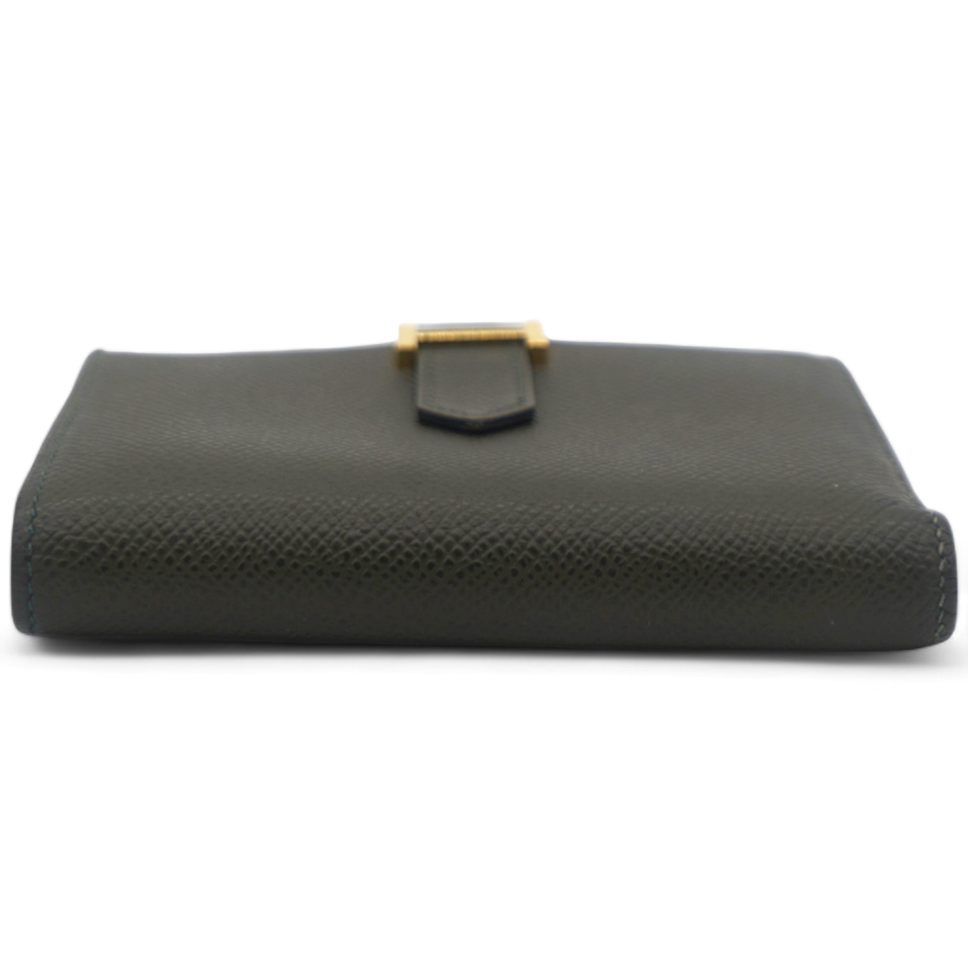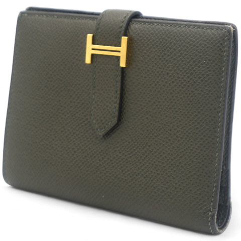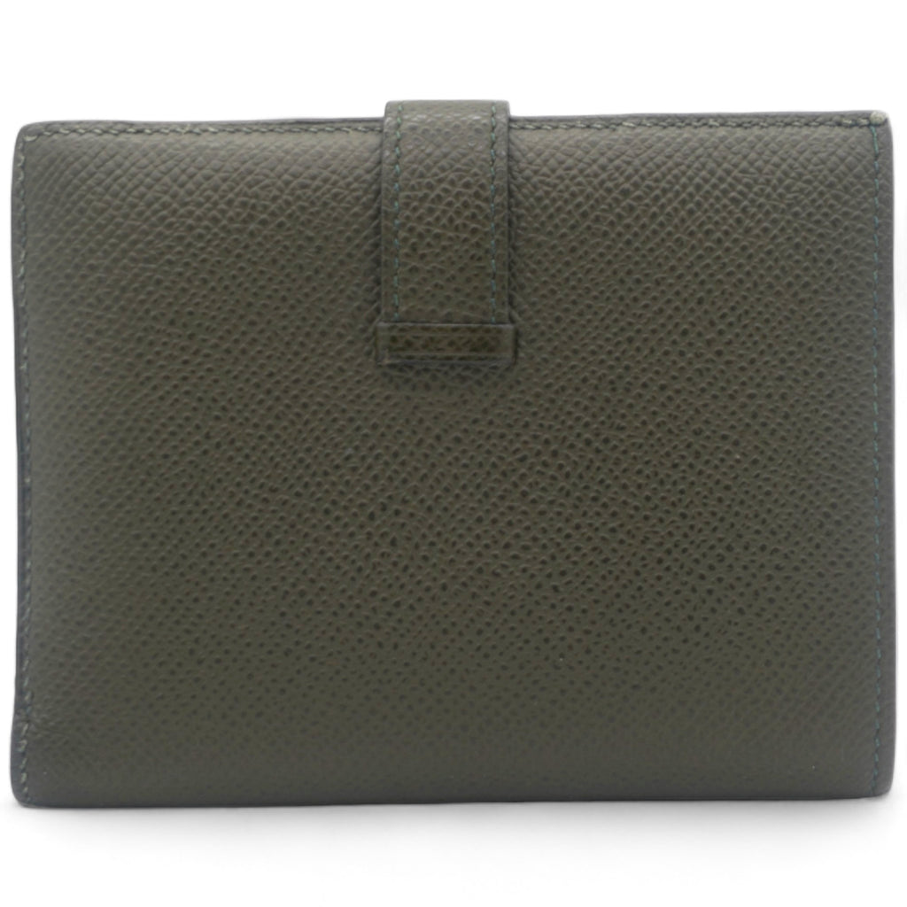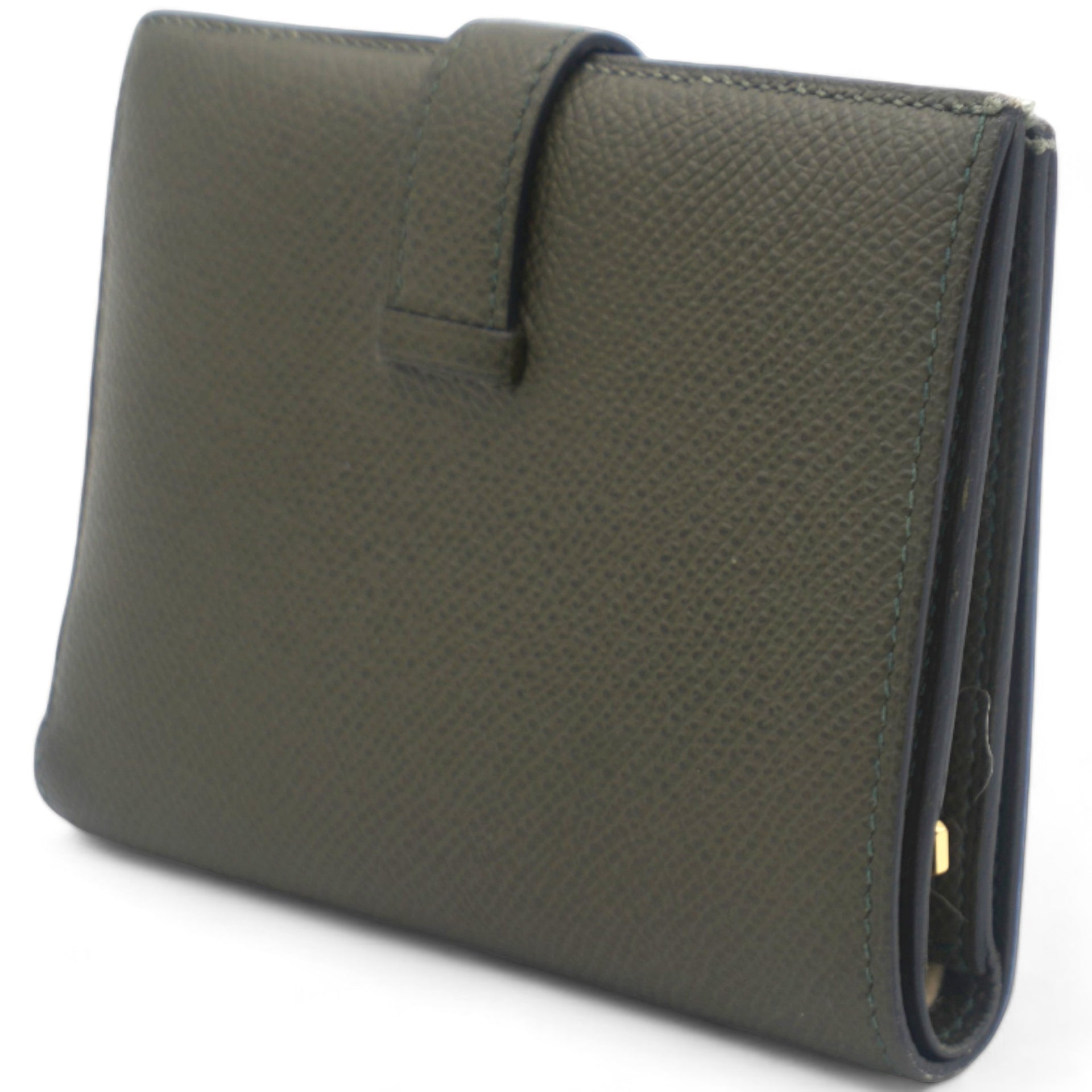 | This chic wallet is crafted of richly calfskin leather with a border of stitching, a cross over strap and a gold plated Hermes H clasp. The wallet opens to a matching leather interior with a card slot panel, patch pockets and a small zipper compartment. |