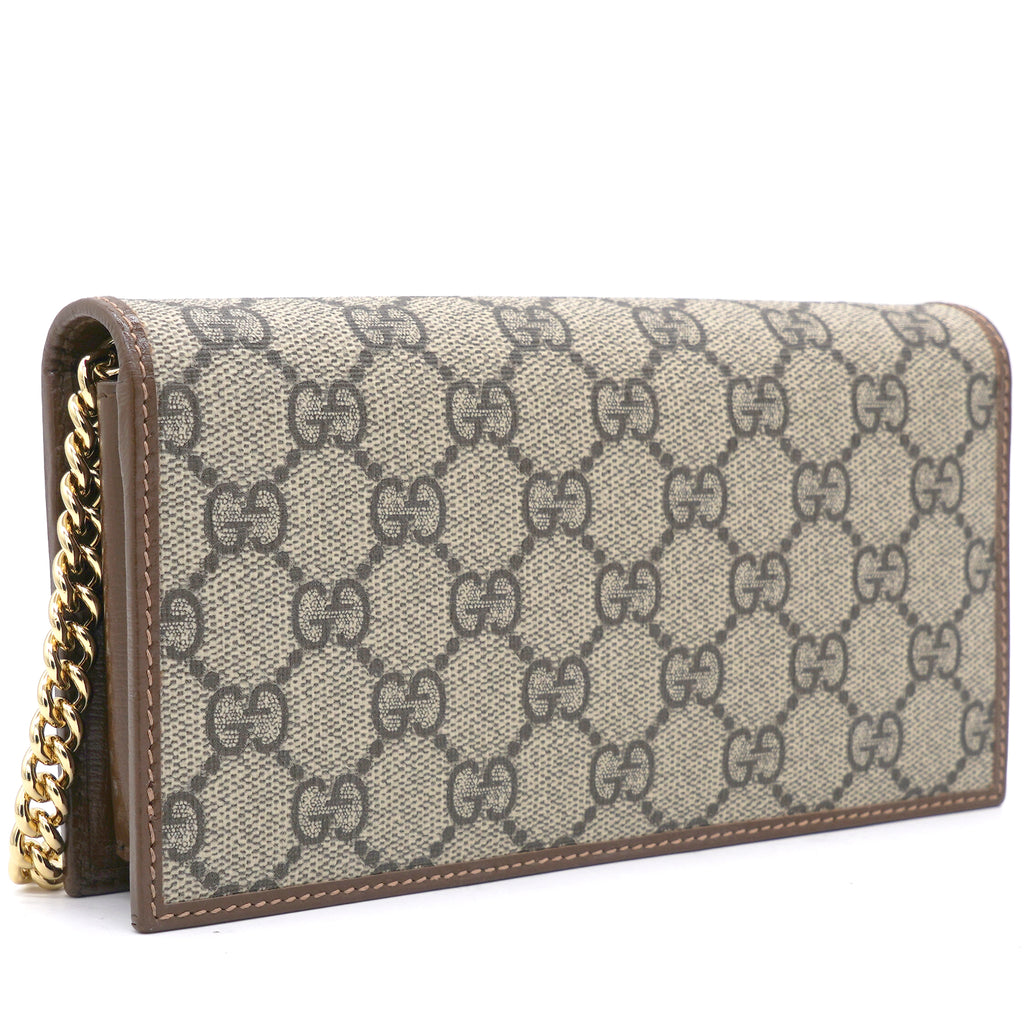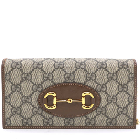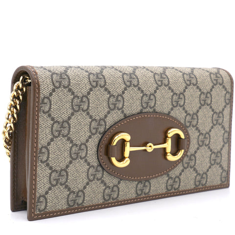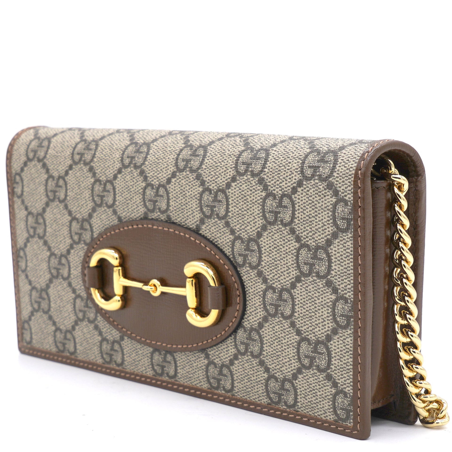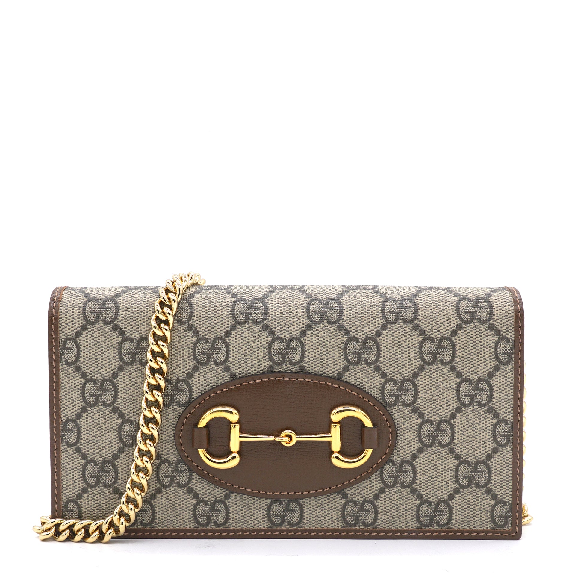| The chain wallet in GG Supreme canvas and leather is introduced as part of the Gucci Horsebit 1955 accessories collection, defined by the double ring and bar design also found in Handbags. The folded snap-closure shape features several card slots and pockets, completed with a detachable chain strap. |
