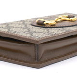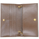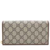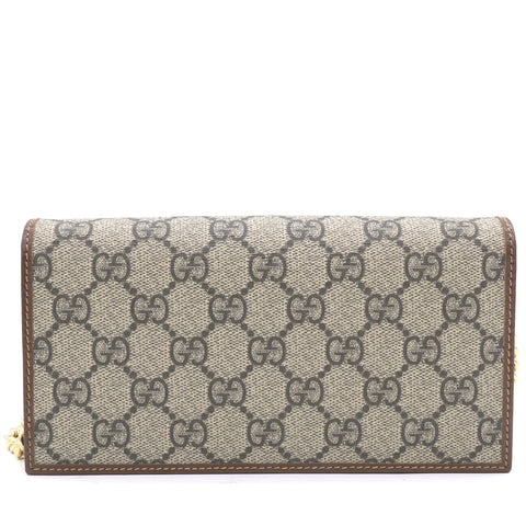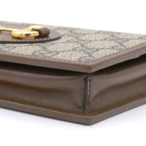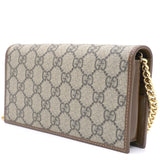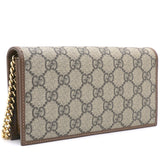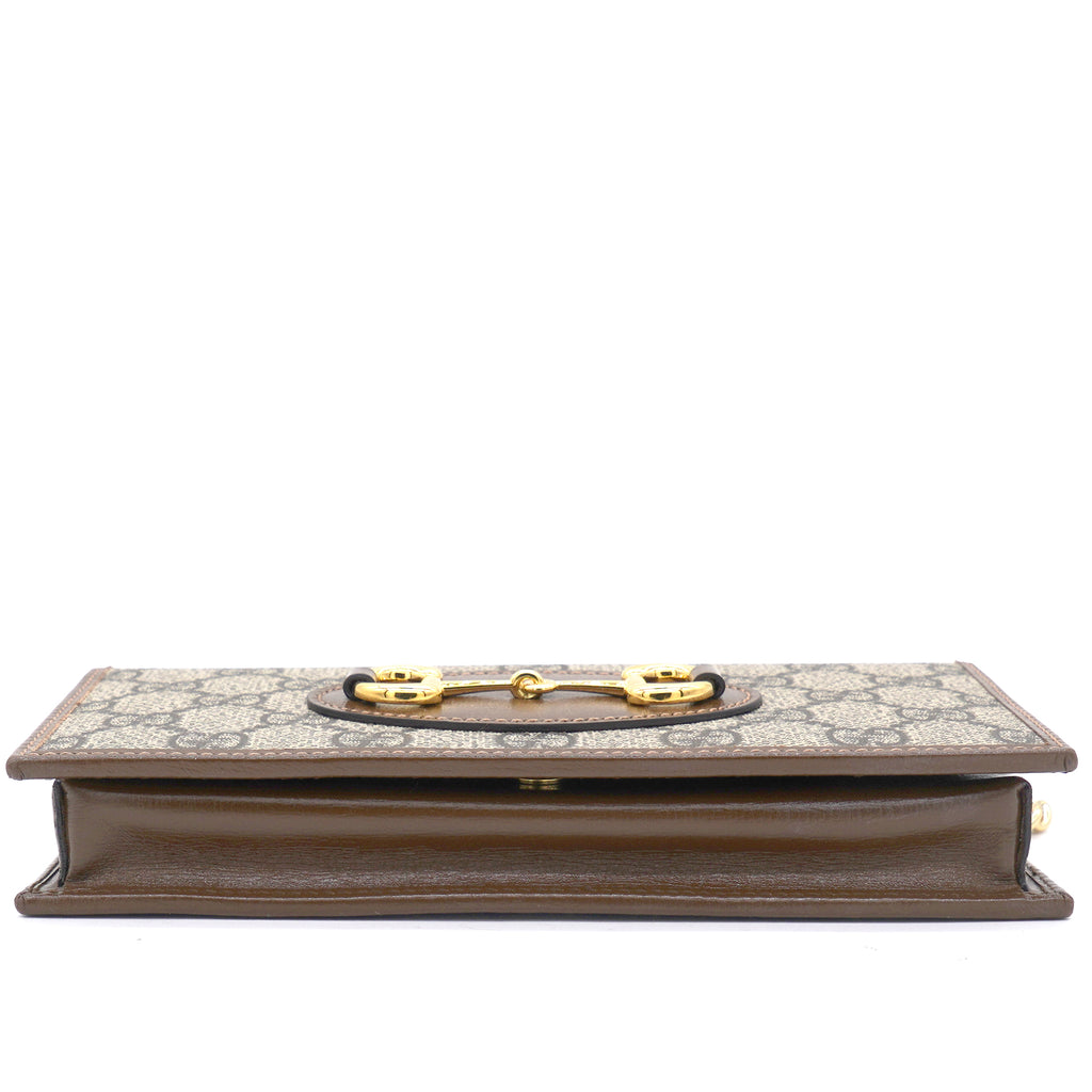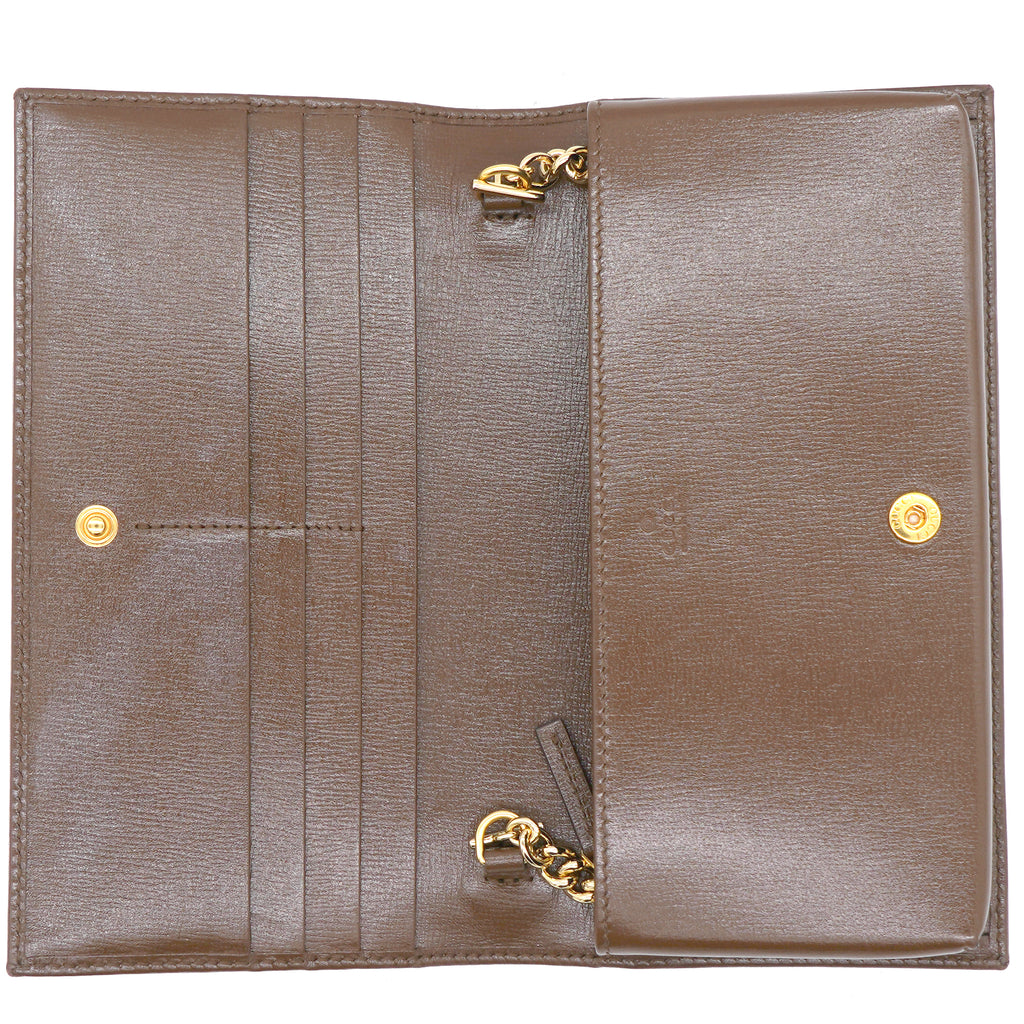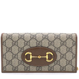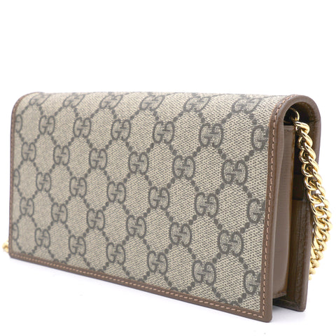 | The chain wallet in GG Supreme canvas and leather is introduced as part of the Gucci Horsebit 1955 accessories collection, defined by the double ring and bar design also found in Handbags. The folded snap-closure shape features several card slots and pockets, completed with a detachable chain strap. |