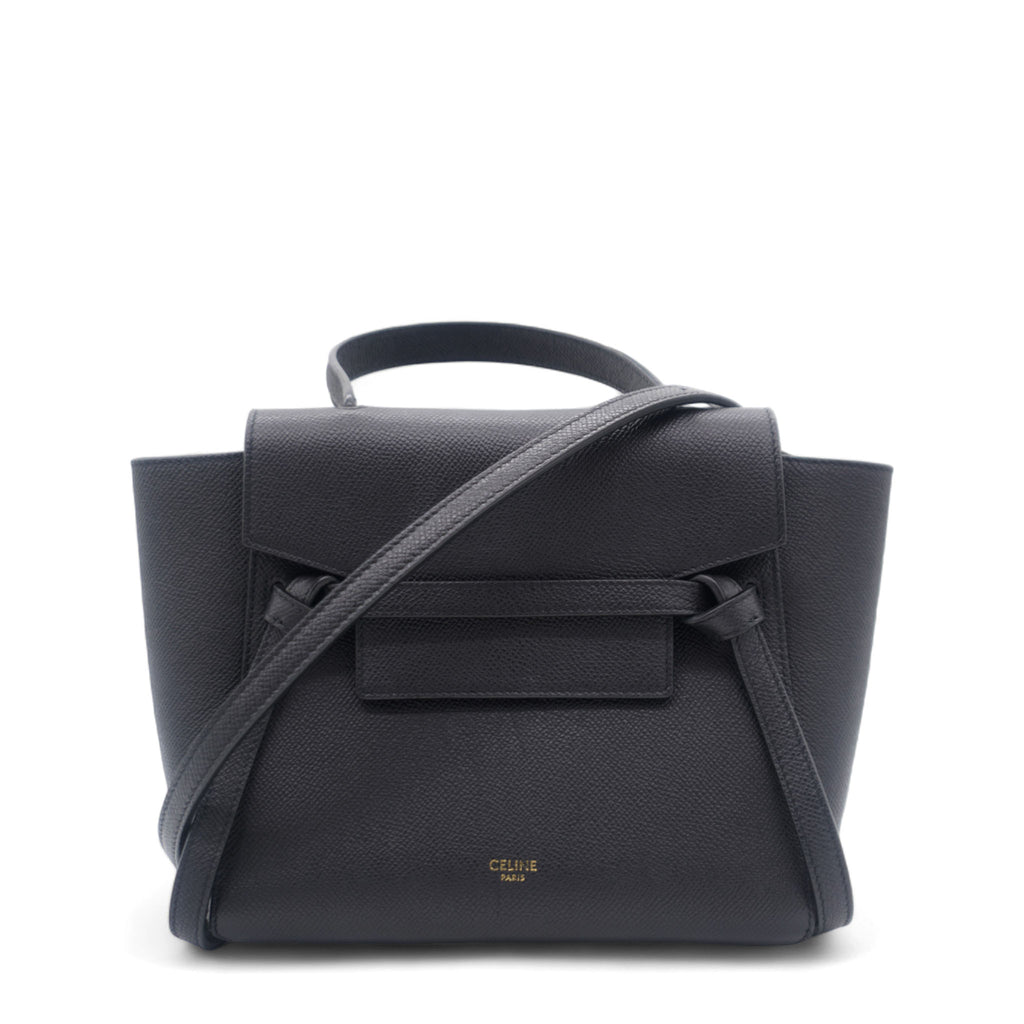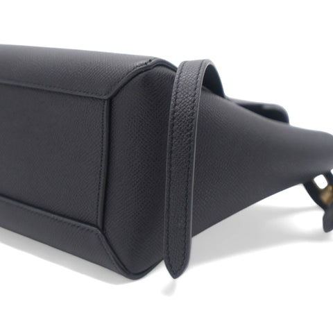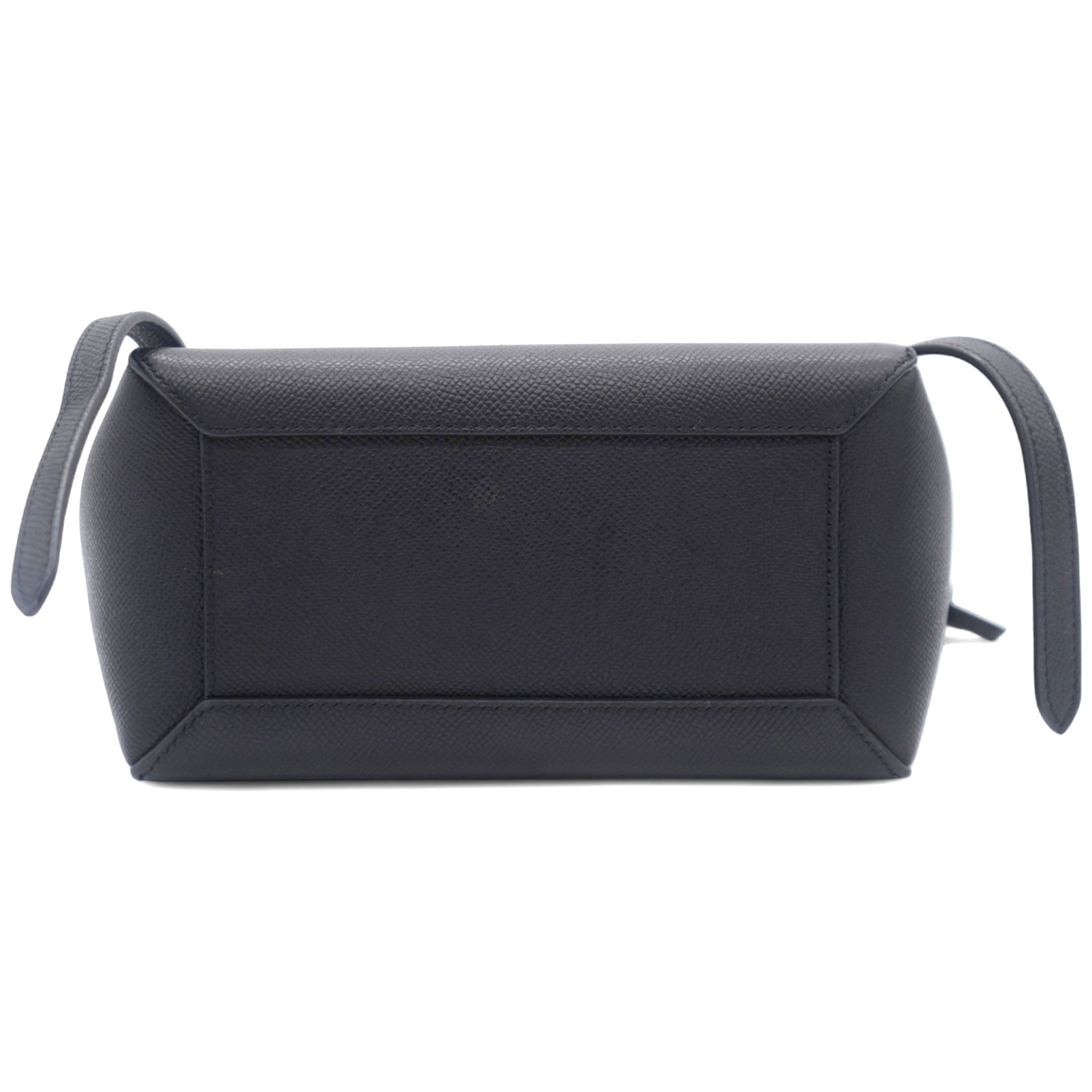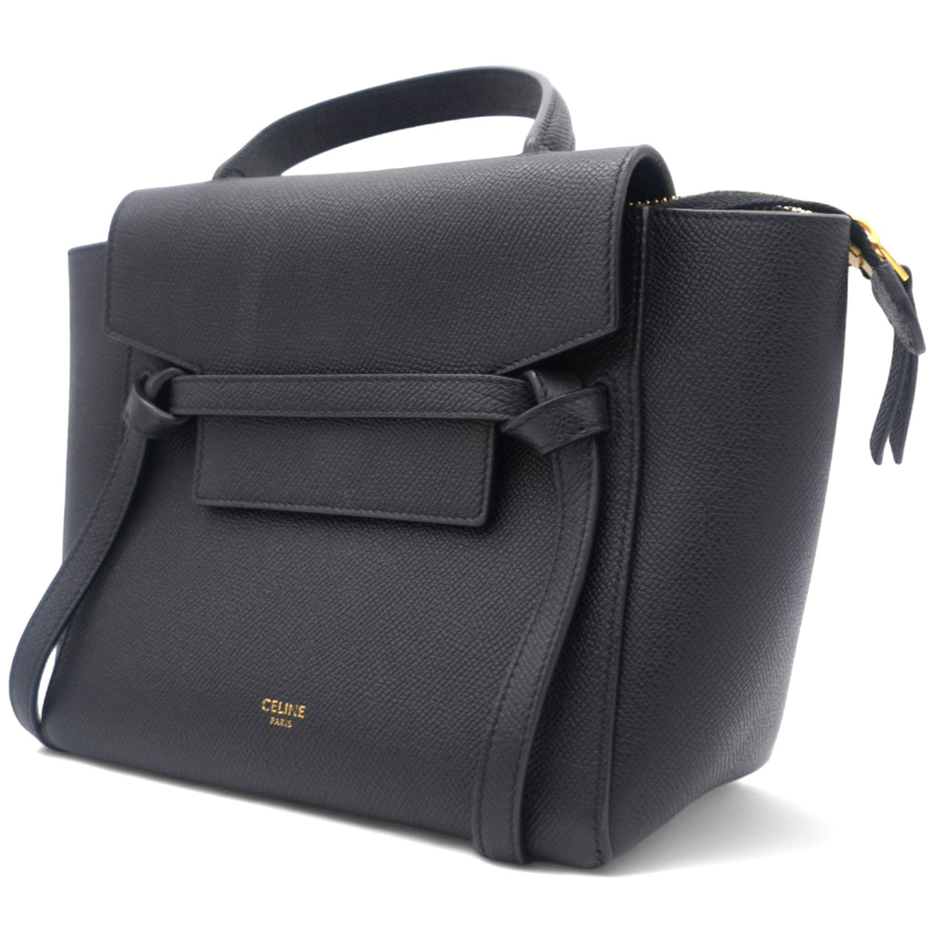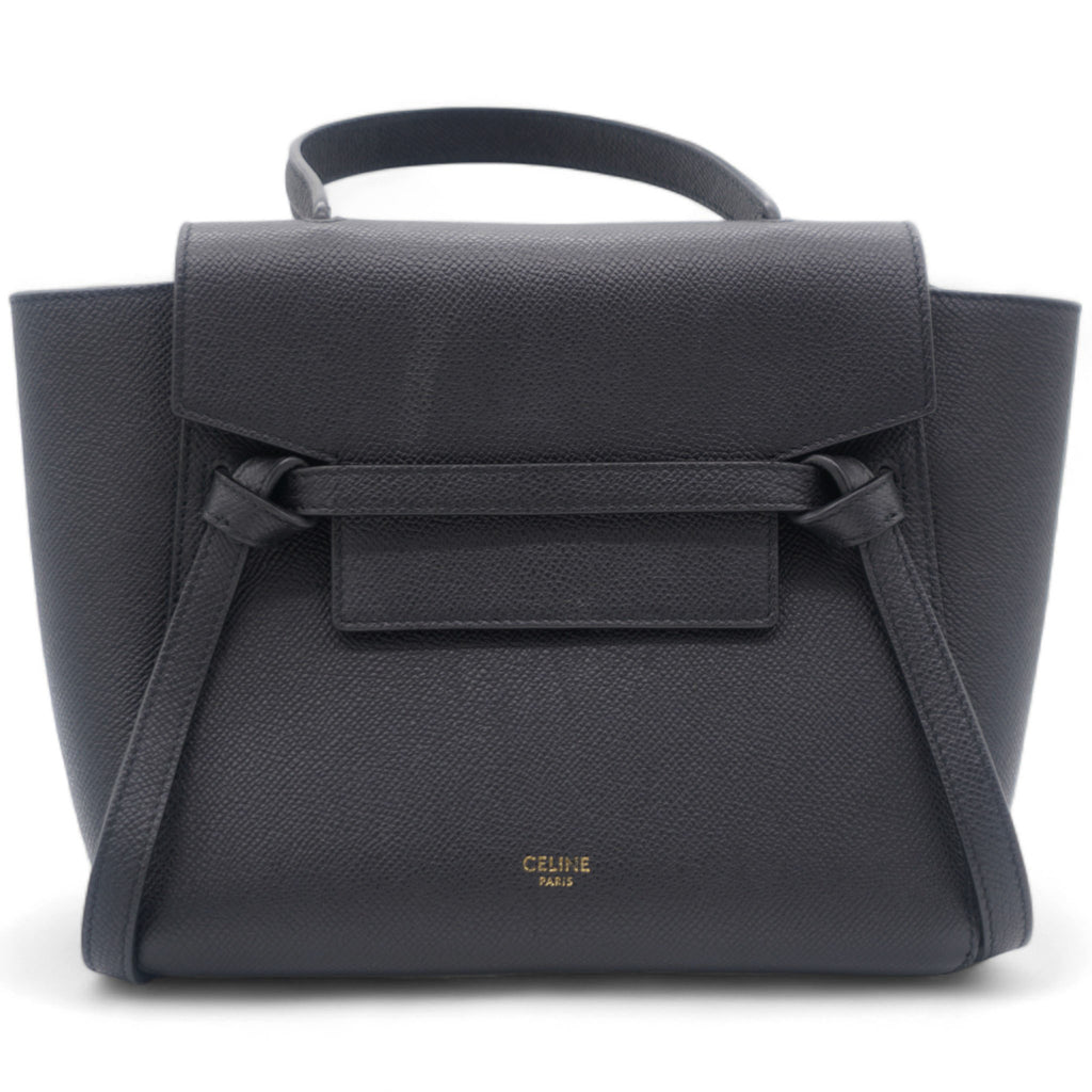 This is an authentic CELINE Grained Calfskin Nano Belt Bag in Black. This chic tote is crafted of richly textured calfskin leather with a structured and spacious silhouette in grey. The bag features a leather strap top handle, an optional shoulder strap, and a facing flap secured by a strap and brass button.