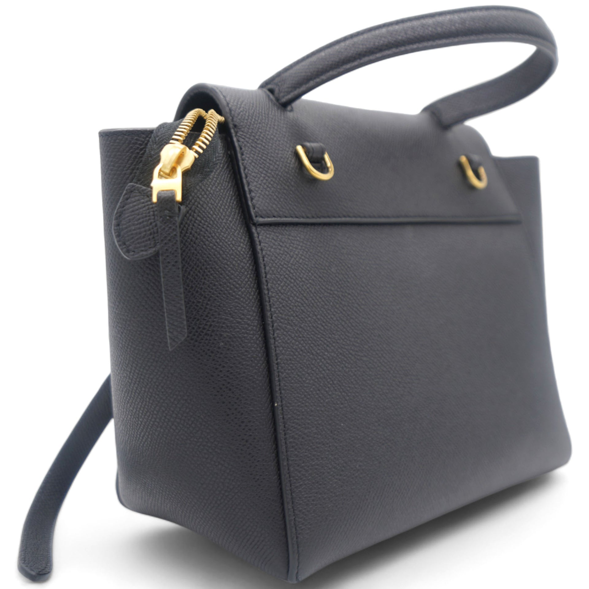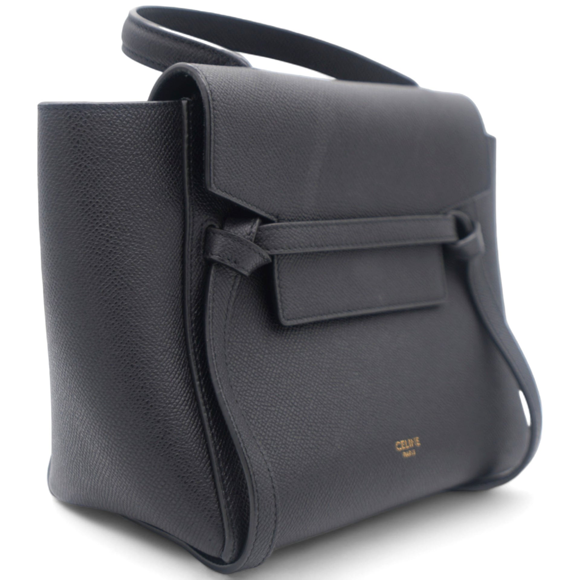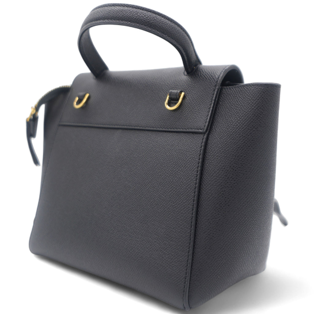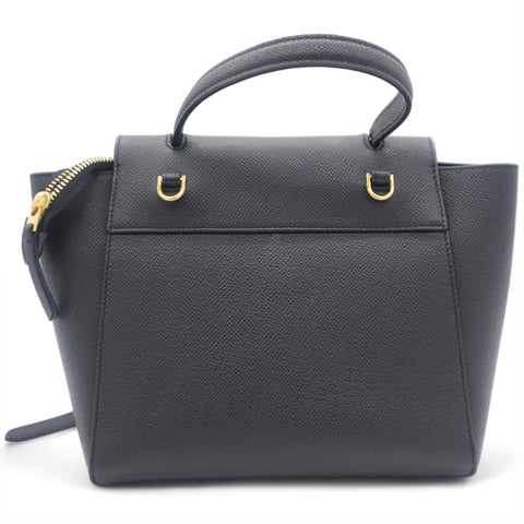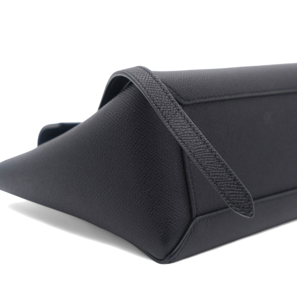 This is an authentic CELINE Grained Calfskin Nano Belt Bag in Black. This chic tote is crafted of richly textured calfskin leather with a structured and spacious silhouette in grey. The bag features a leather strap top handle, an optional shoulder strap, and a facing flap secured by a strap and brass button.