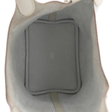 This stunning tote is crafted of luxuriously soft clemence calfskin leather in grey and white. This handbag features a unique one piece reinforced design with leather top handles and a closure strap that can be secured by a padlock. This opens to a spacious suede interior. This is an excellent tote for everyday wear with the classical sophistication