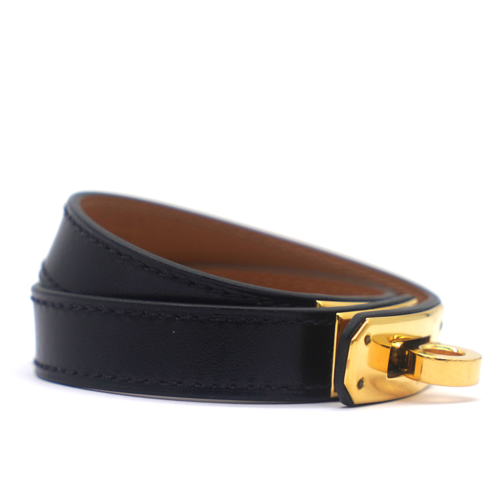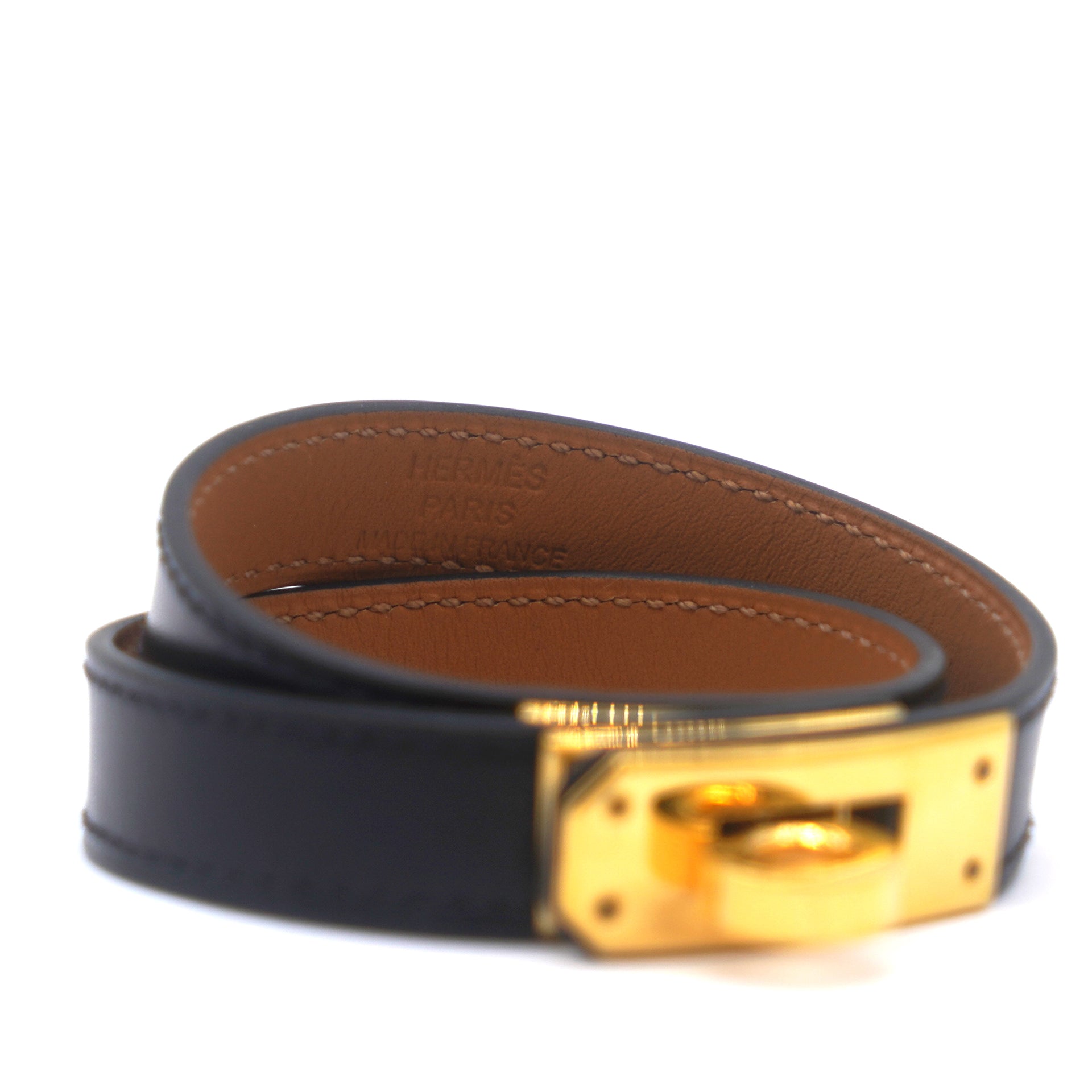 | This Hermes Double Tour wrap bracelet is a chic accessory that can be paired with everything, from casuals to evening outfits. Made from box leather in Black, it is beautified with a Kelly twist closure in yellow gold-plated metal. The bracelet has a long strap that wraps twice around your wrist. |