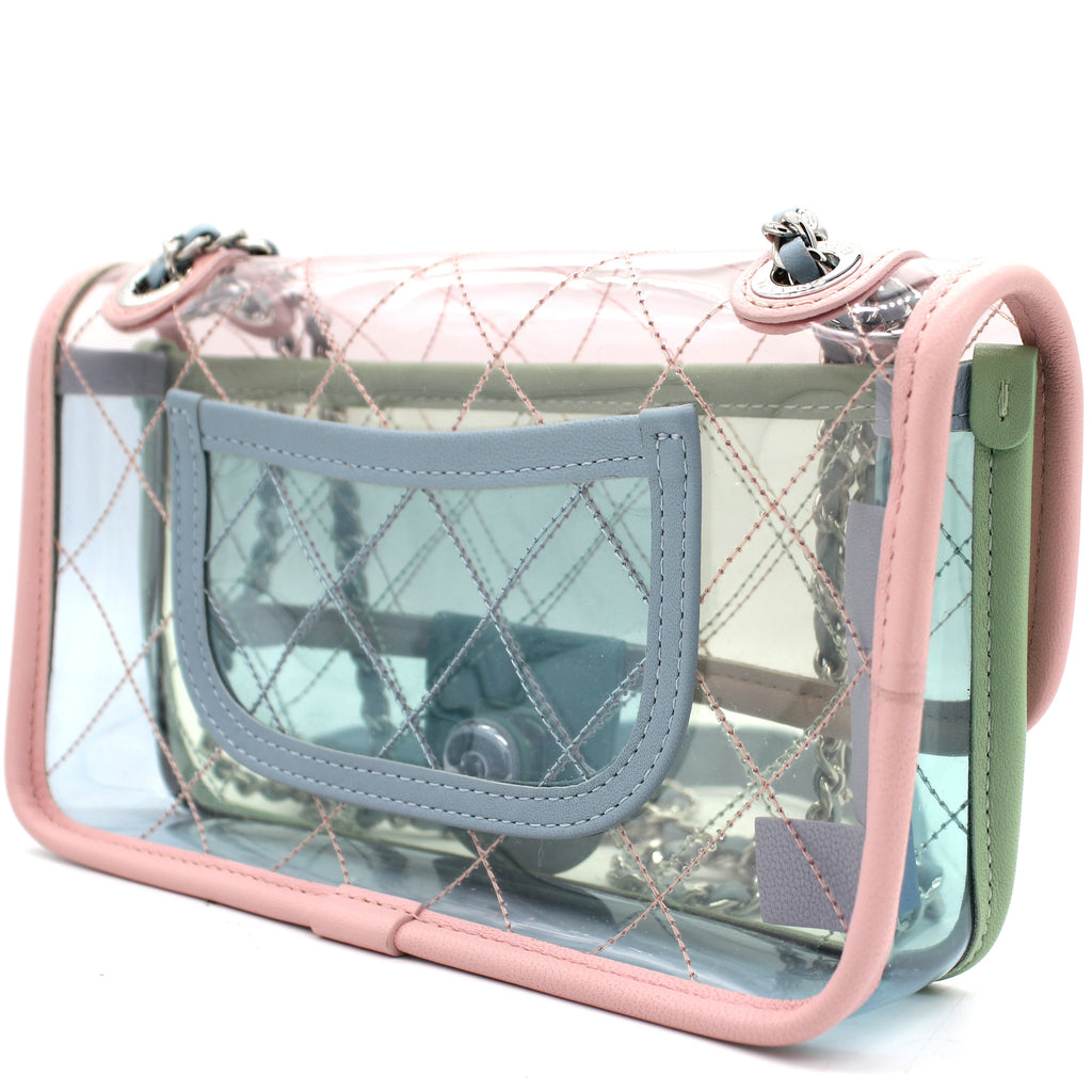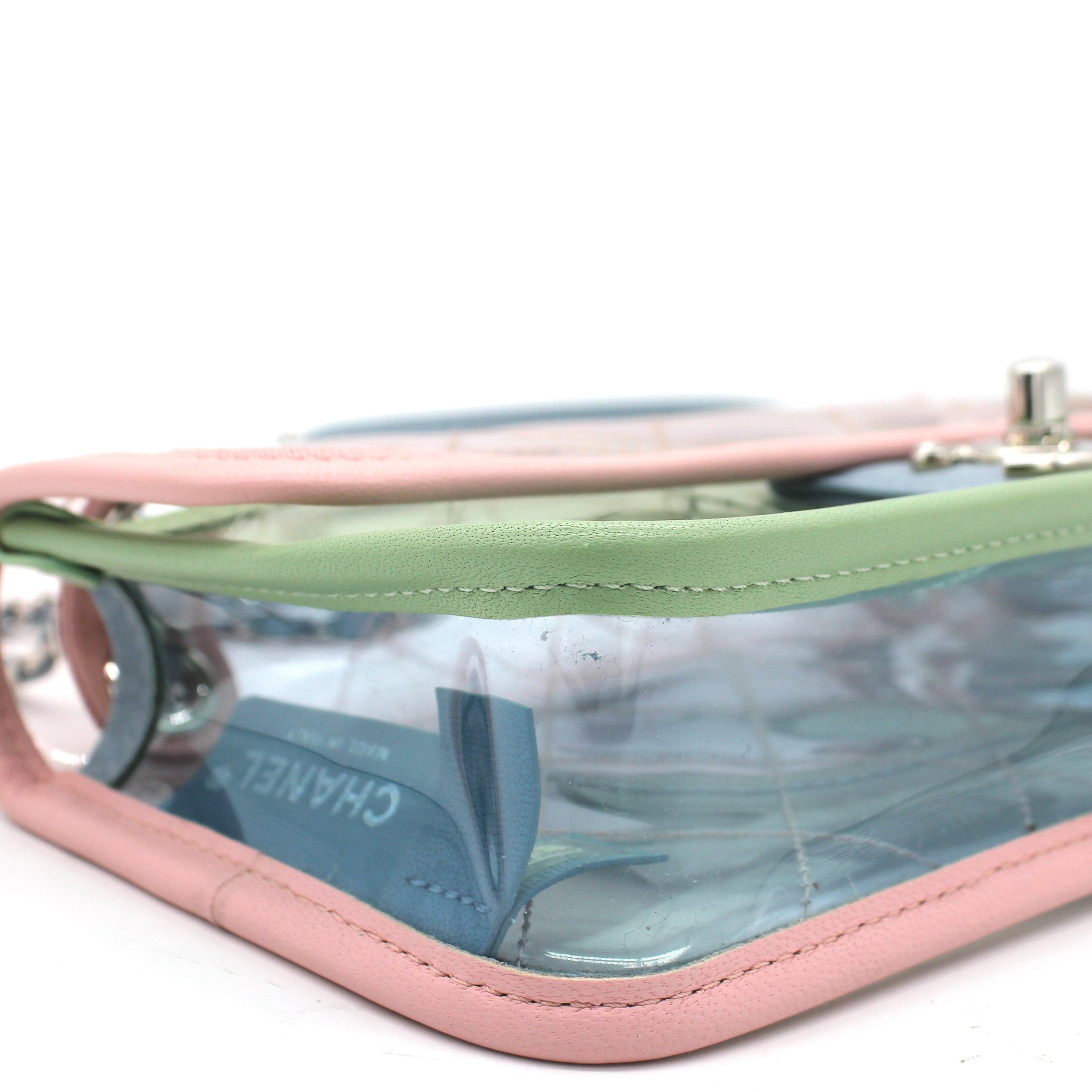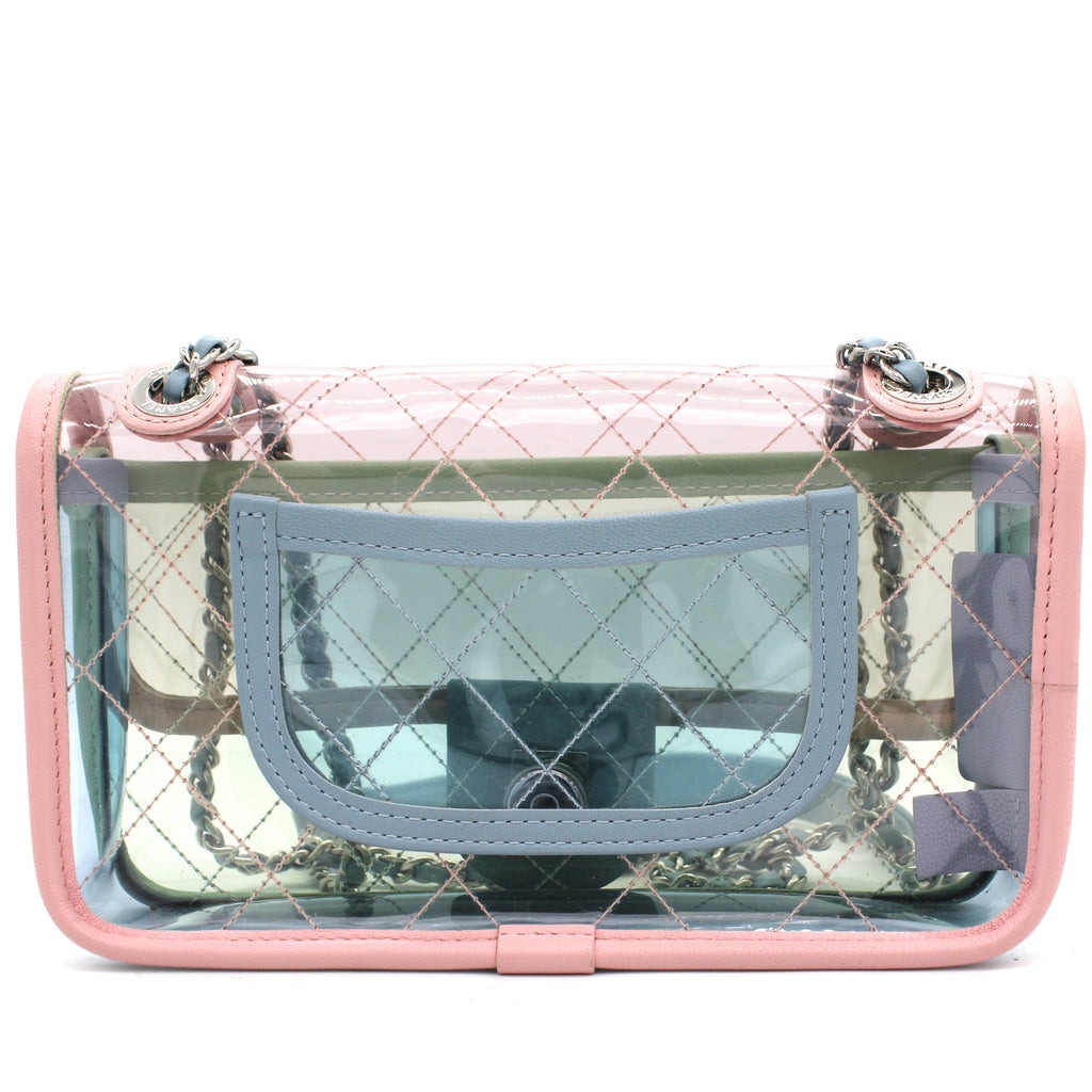 | This shoulder bag is crafted of clear, blue and green PVC with iconic diamond shaped stitching. The handbag has classic polished silver chain shoulder straps threaded with pink leather and a silver Chanel classic CC turn lock on a pink leather tab. This opens with a front flap to a clear interior. Satisfy your practical needs as well as your demand for style with this unique lovely classic |