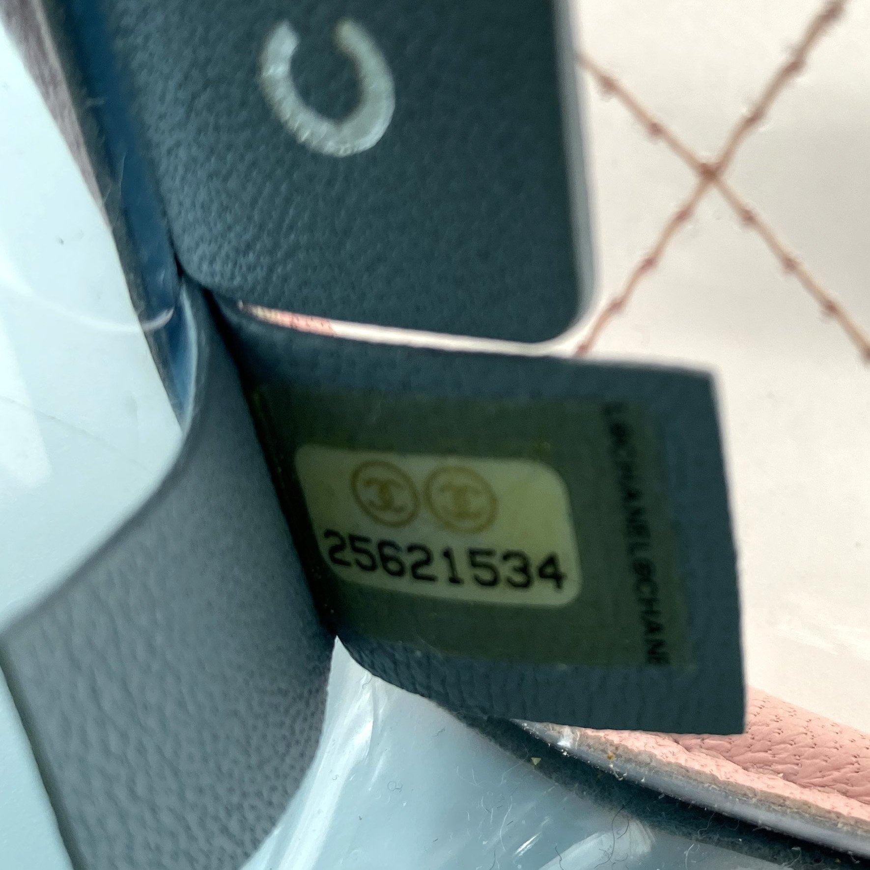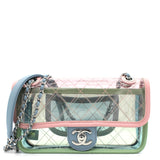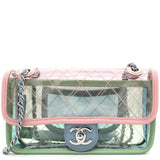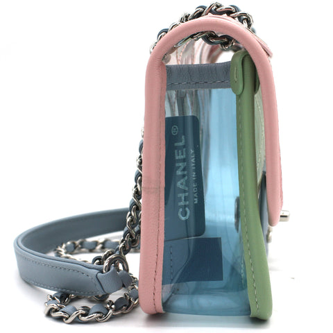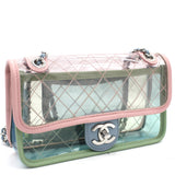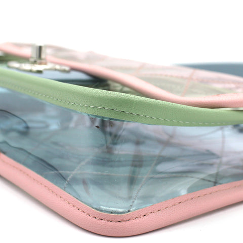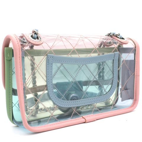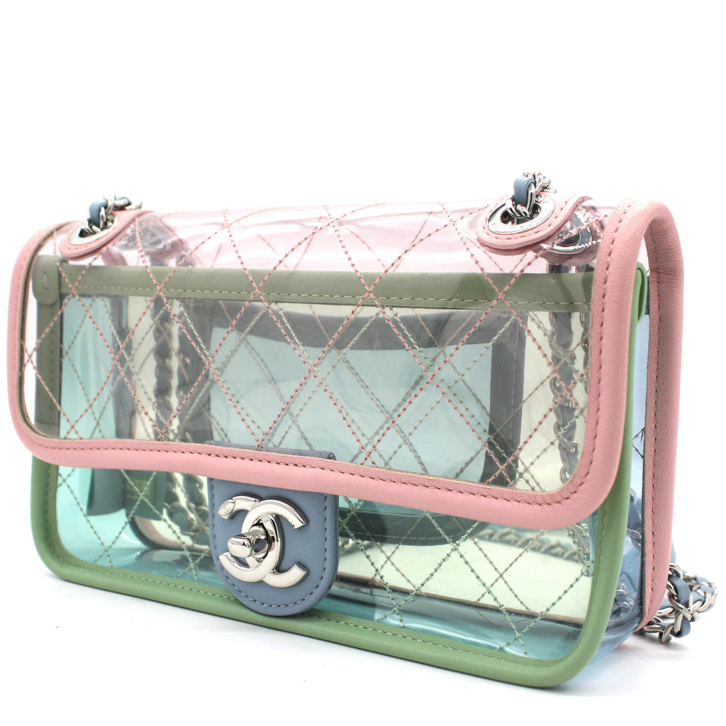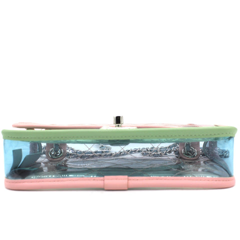 | This shoulder bag is crafted of clear, blue and green PVC with iconic diamond shaped stitching. The handbag has classic polished silver chain shoulder straps threaded with pink leather and a silver Chanel classic CC turn lock on a pink leather tab. This opens with a front flap to a clear interior. Satisfy your practical needs as well as your demand for style with this unique lovely classic |