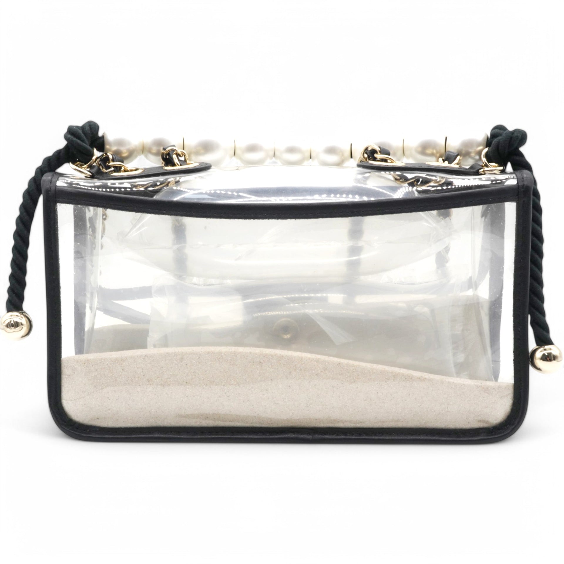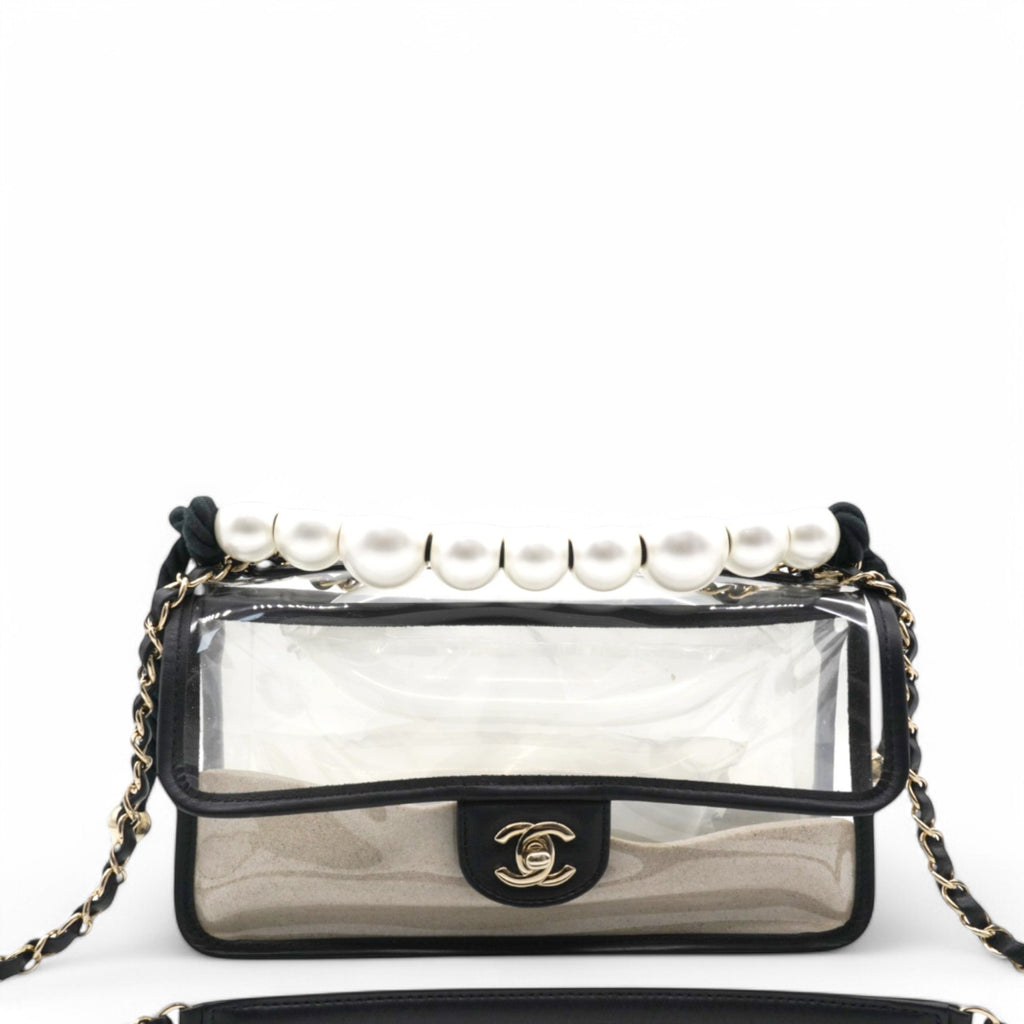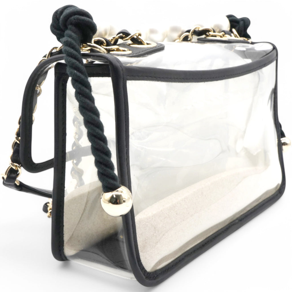 | This shoulder bag is crafted of transparent PVC with black leather trim. This bag features sand-filled sides, a rear patched pocket, a faux pearl handle, a leather threaded shoulder strap, and polished gold hardware. This opens with a front flap to a spacious transparent PVC interior with a black leather base. |