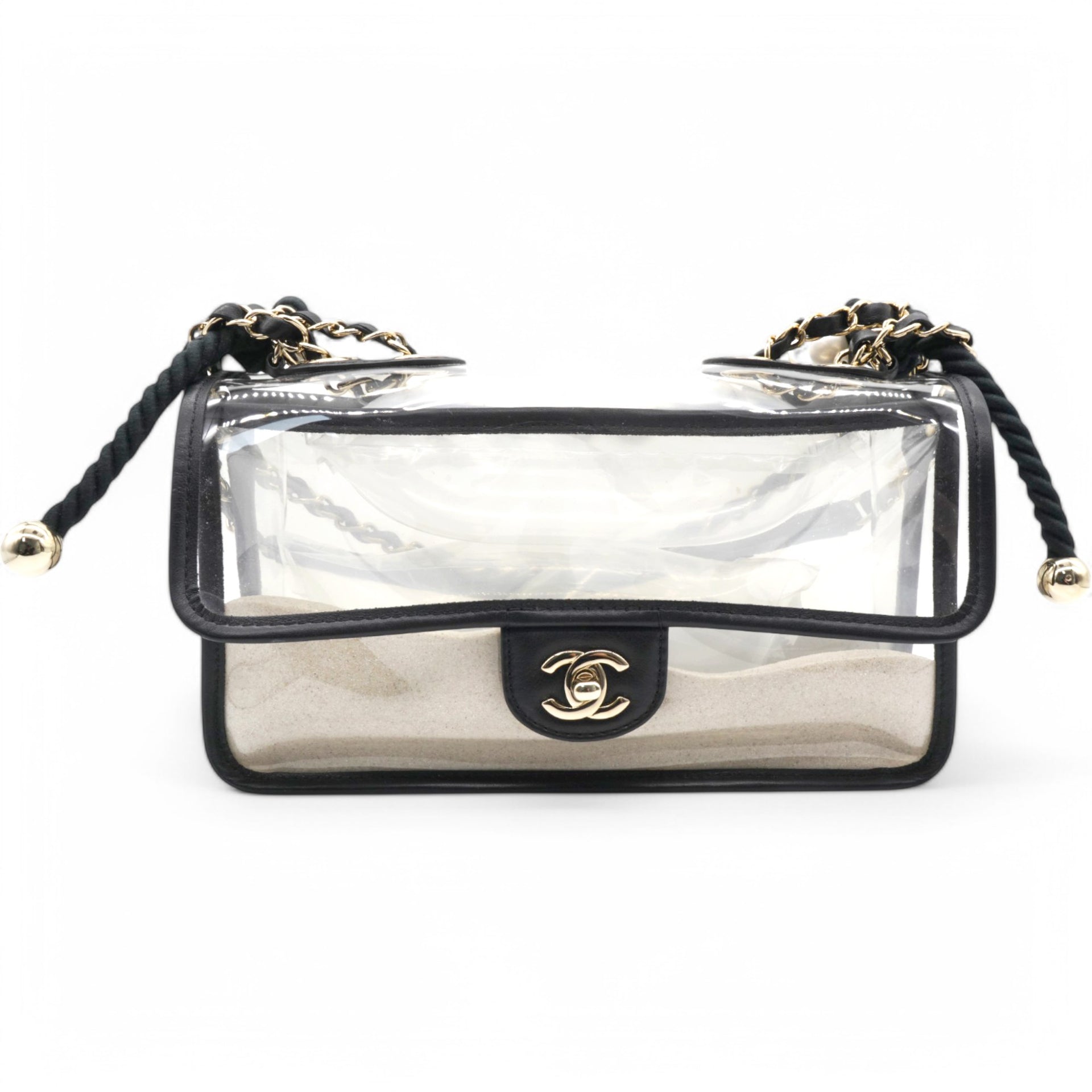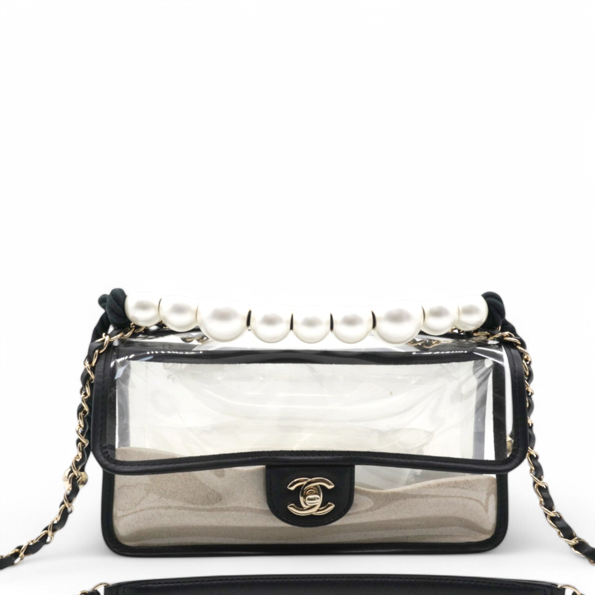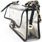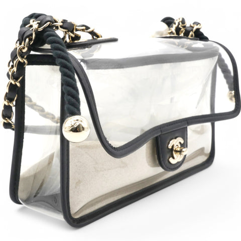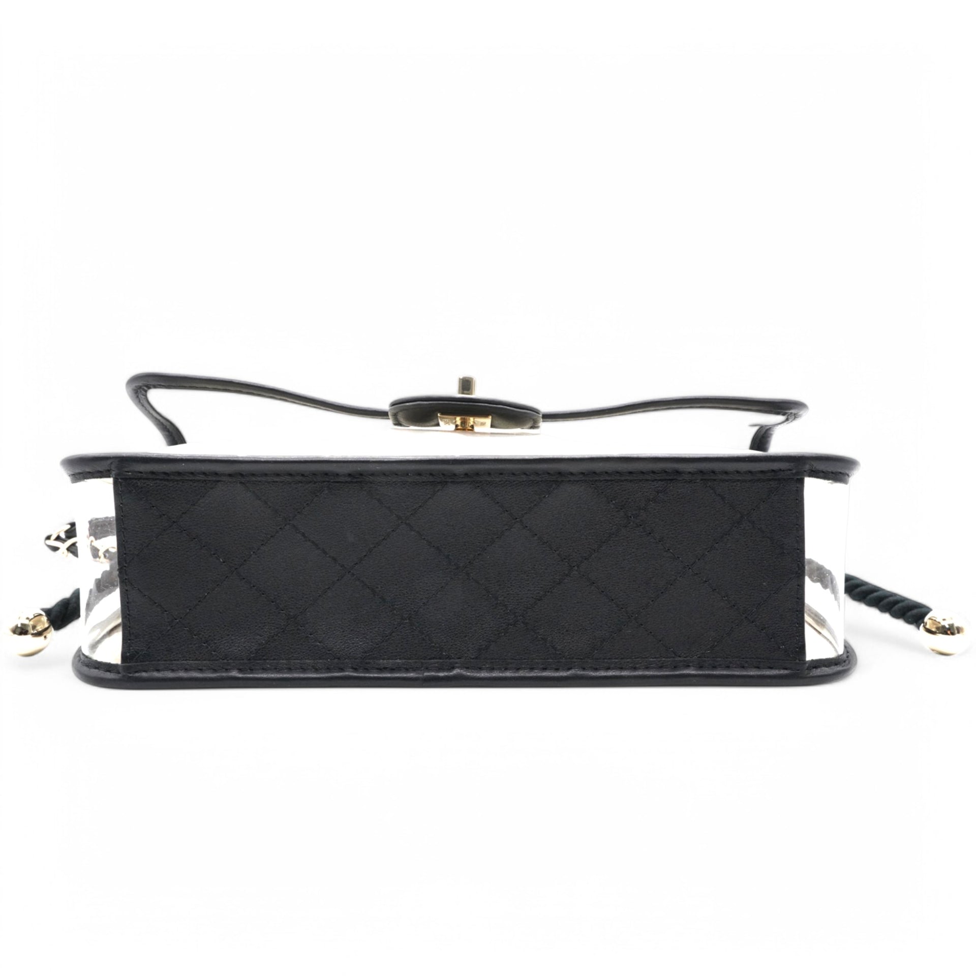 | This shoulder bag is crafted of transparent PVC with black leather trim. This bag features sand-filled sides, a rear patched pocket, a faux pearl handle, a leather threaded shoulder strap, and polished gold hardware. This opens with a front flap to a spacious transparent PVC interior with a black leather base. |
