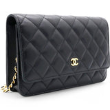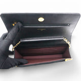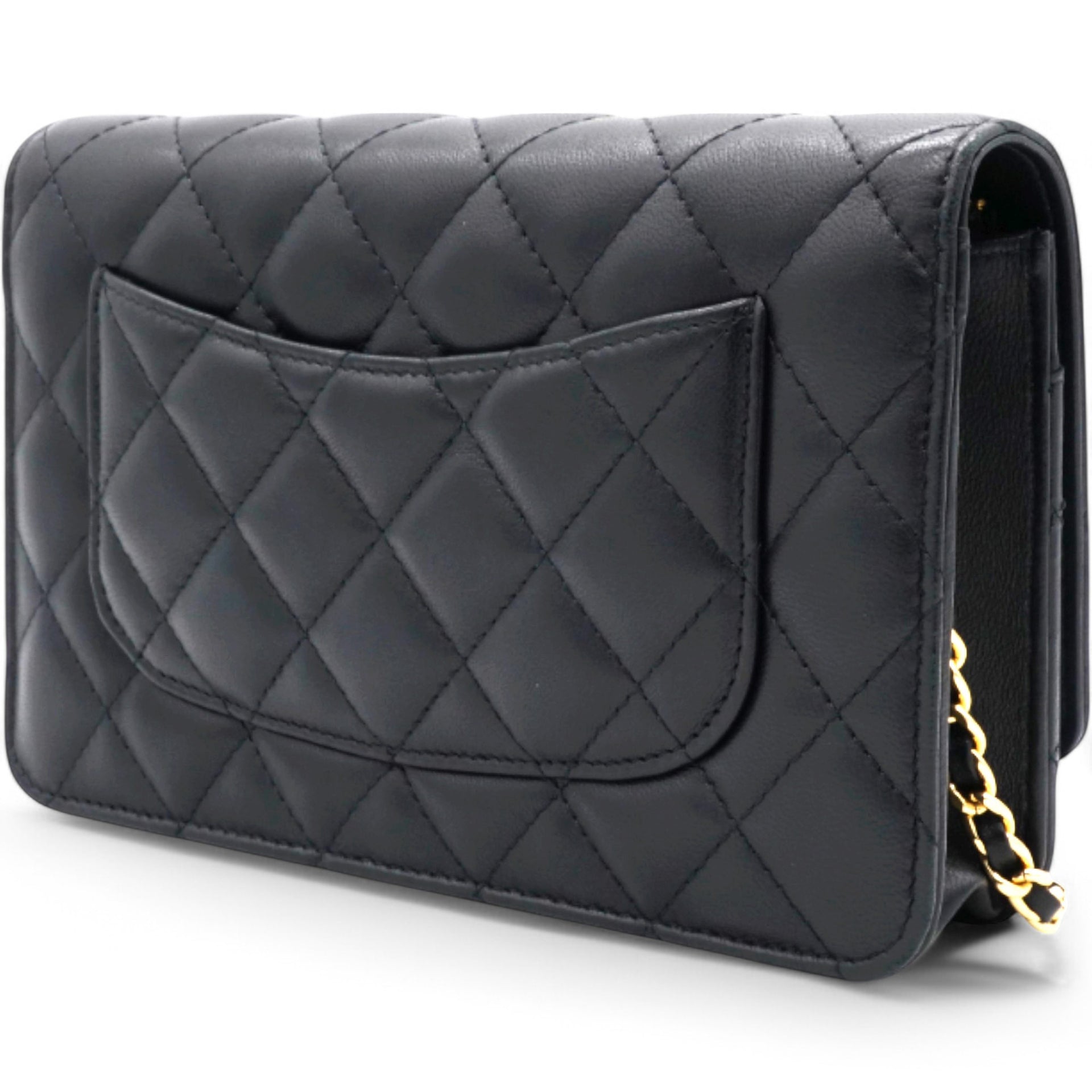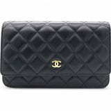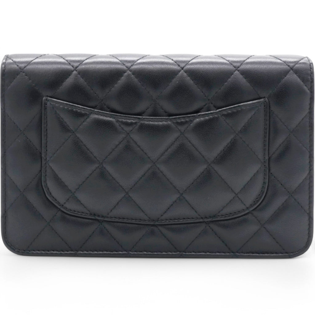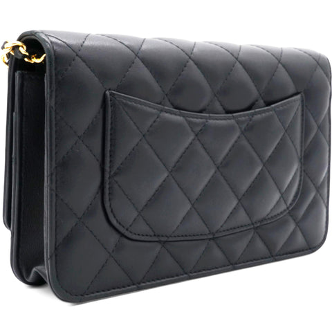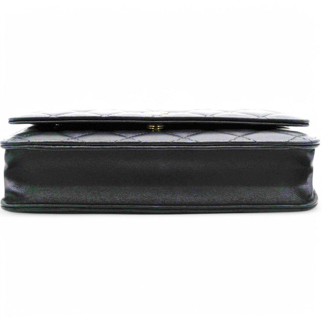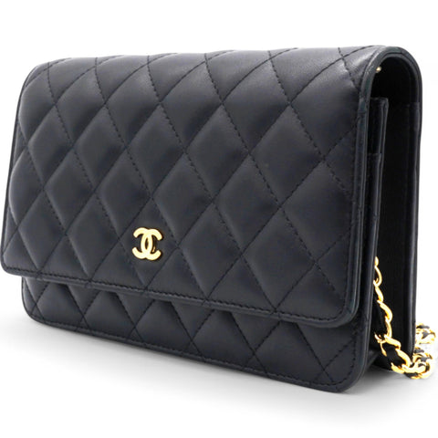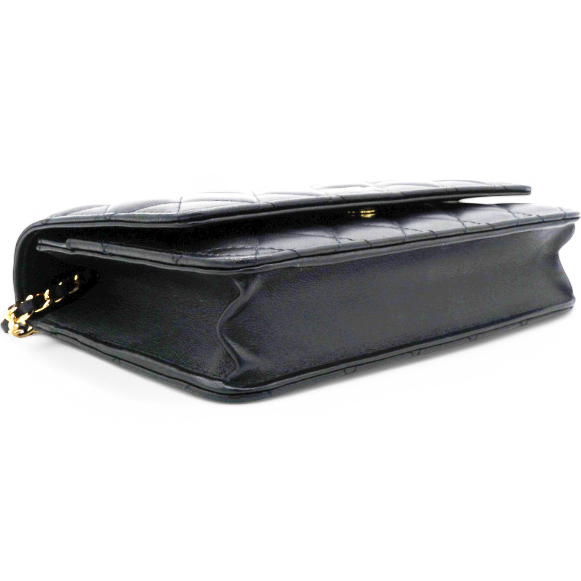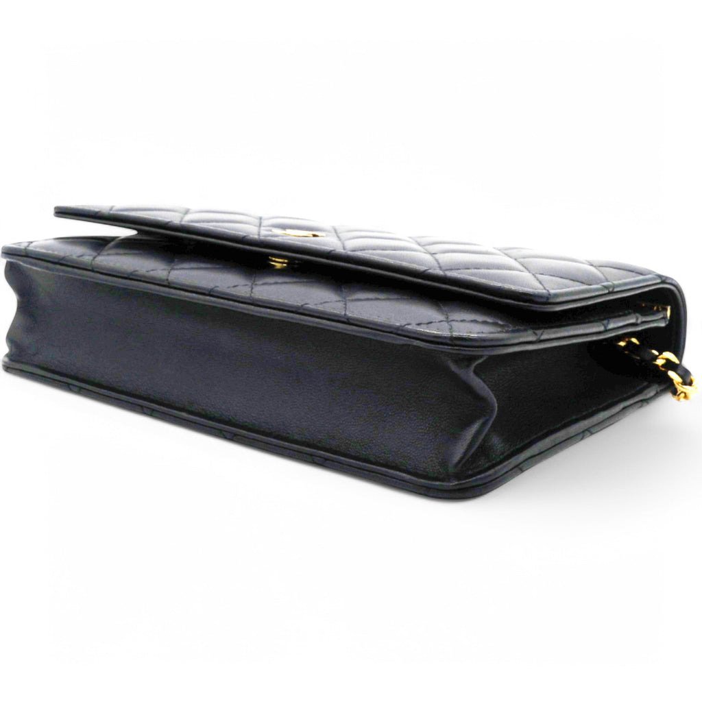 | This stylish wallet is crafted of luxuriously diamond lambskin leather in black. This shoulder bag features a polished gold chain-link leather threaded crossbody strap and a Chanel CC logo on the facing flap. The bag opens to a burgundy fabric and leather interior with a zipper compartment, card slots, and a leather patch pocket. |