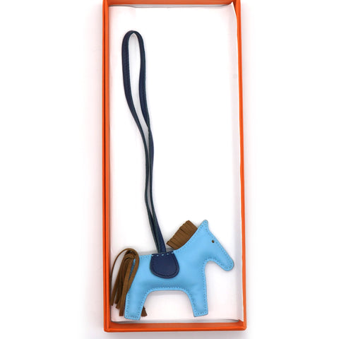 | This is an authentic HERMES Milo Lambskin Grigri Rodeo Horse Bag Charm PM in Celeste, Bleu De Malte and Kraft. This bag charm is crafted of stuffed light blue lambskin leather with a brown fringe mane and tail with a dark blue saddle and leather strap. |