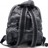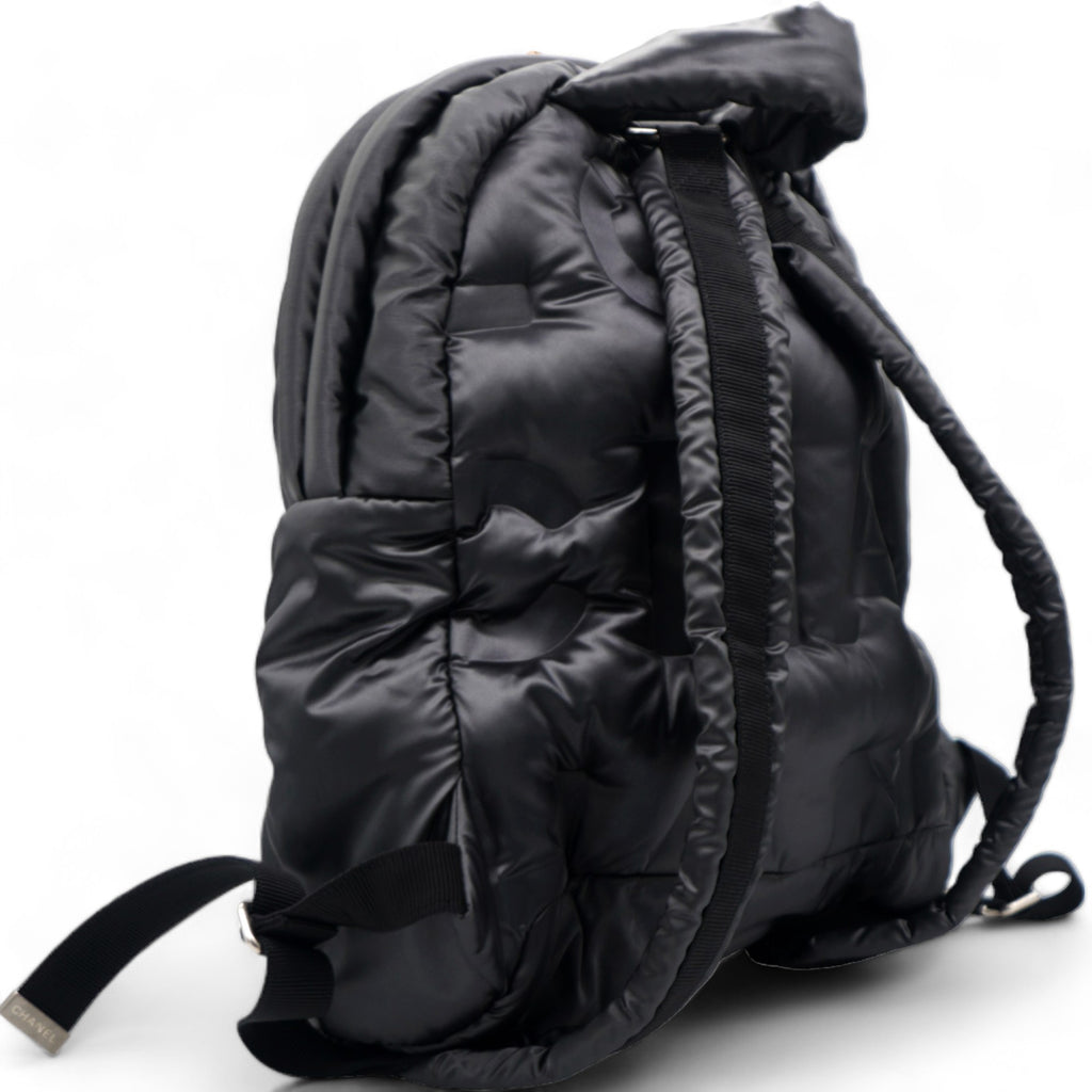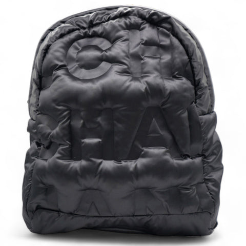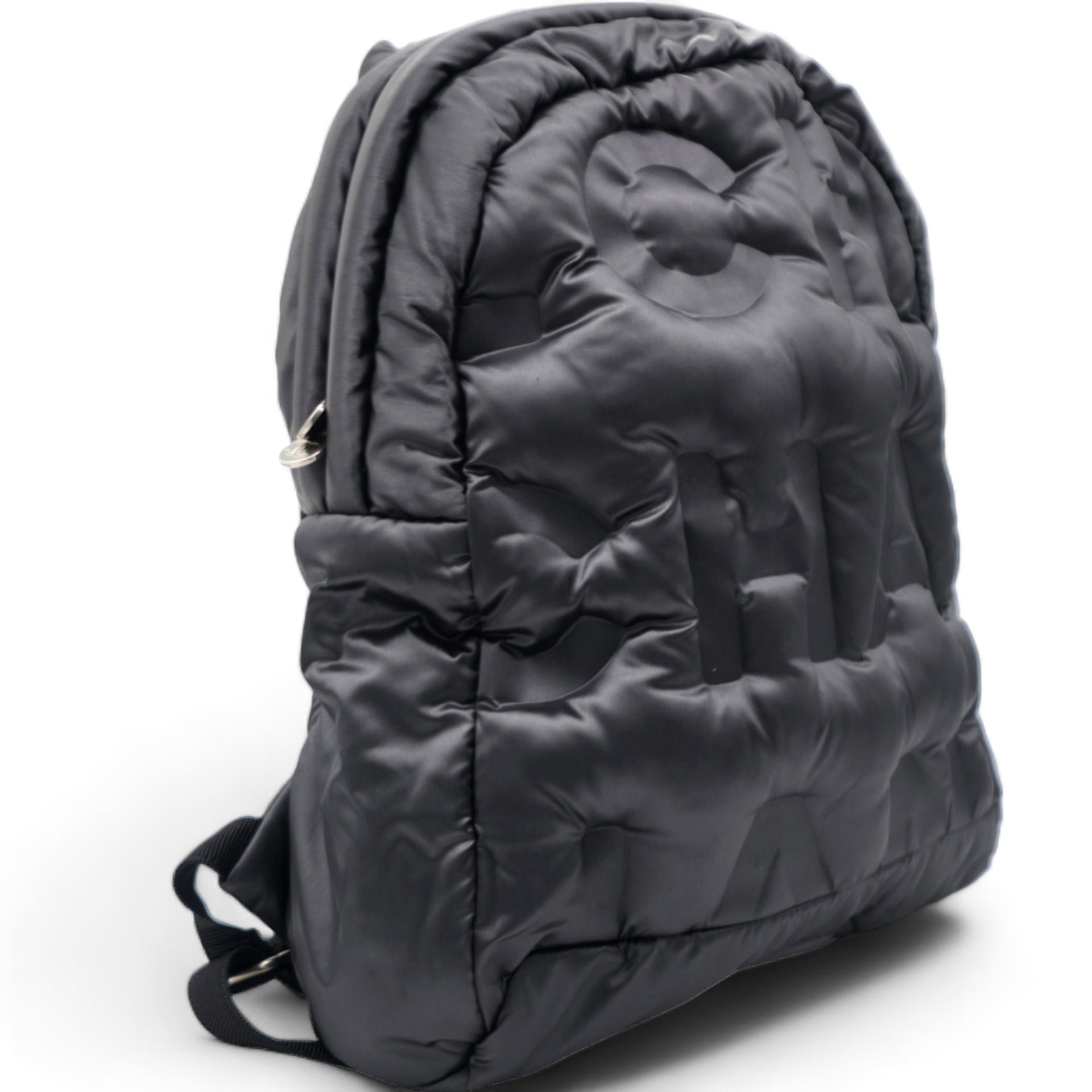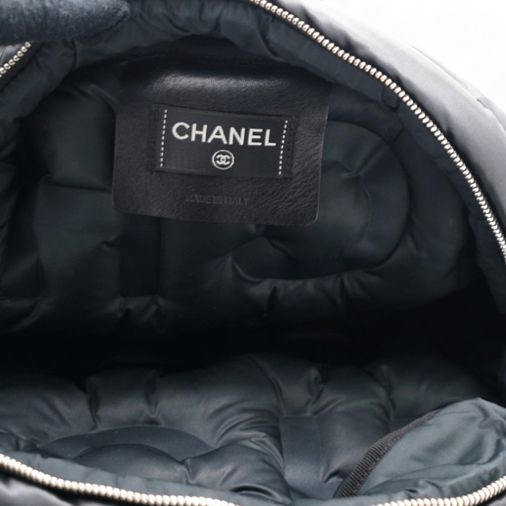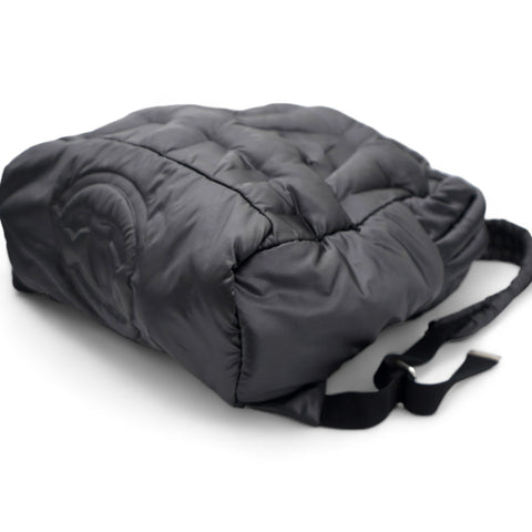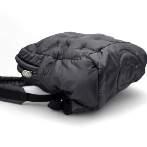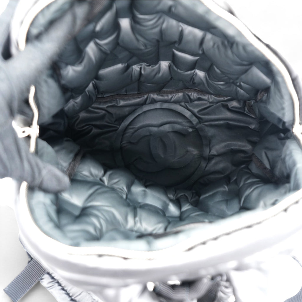 | This is a unique backpack that is finely crafted of soft Chanel embossed nylon in navy blue. The backpack features aged silver hardware and two lengthy shoulder straps. The zipper pull opens to a silver nylon Chanel embossed interior. |