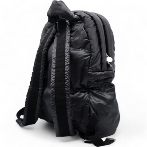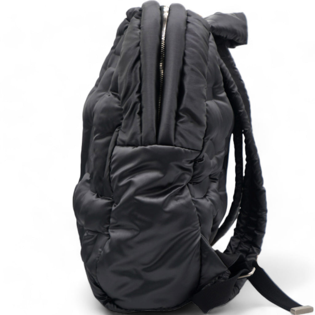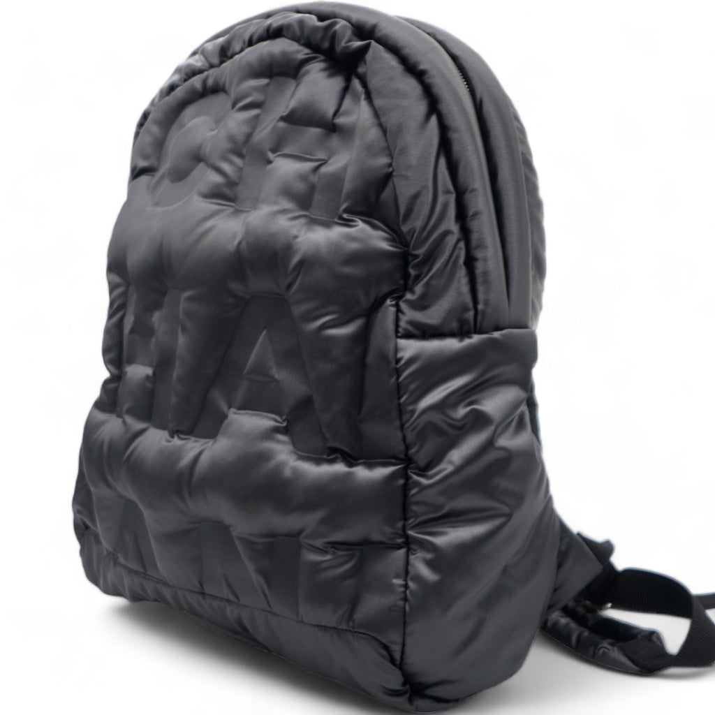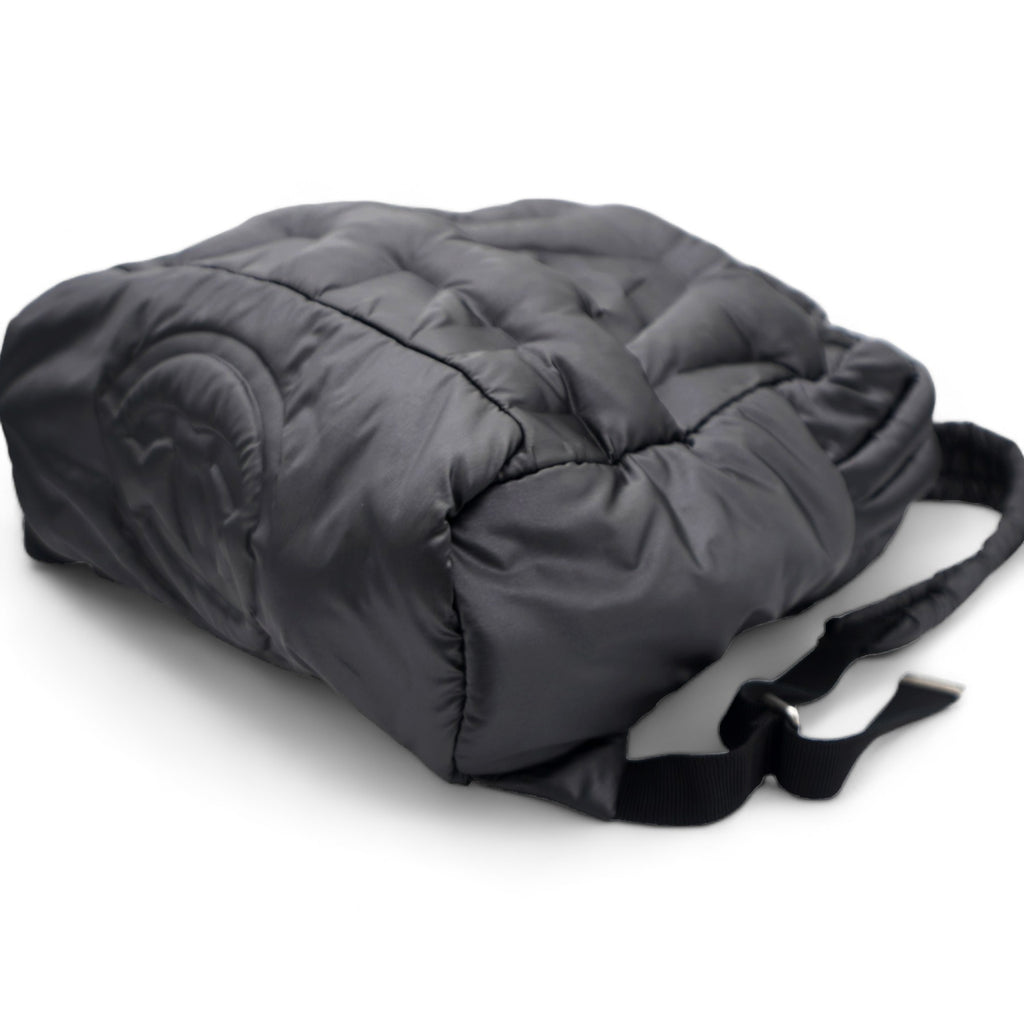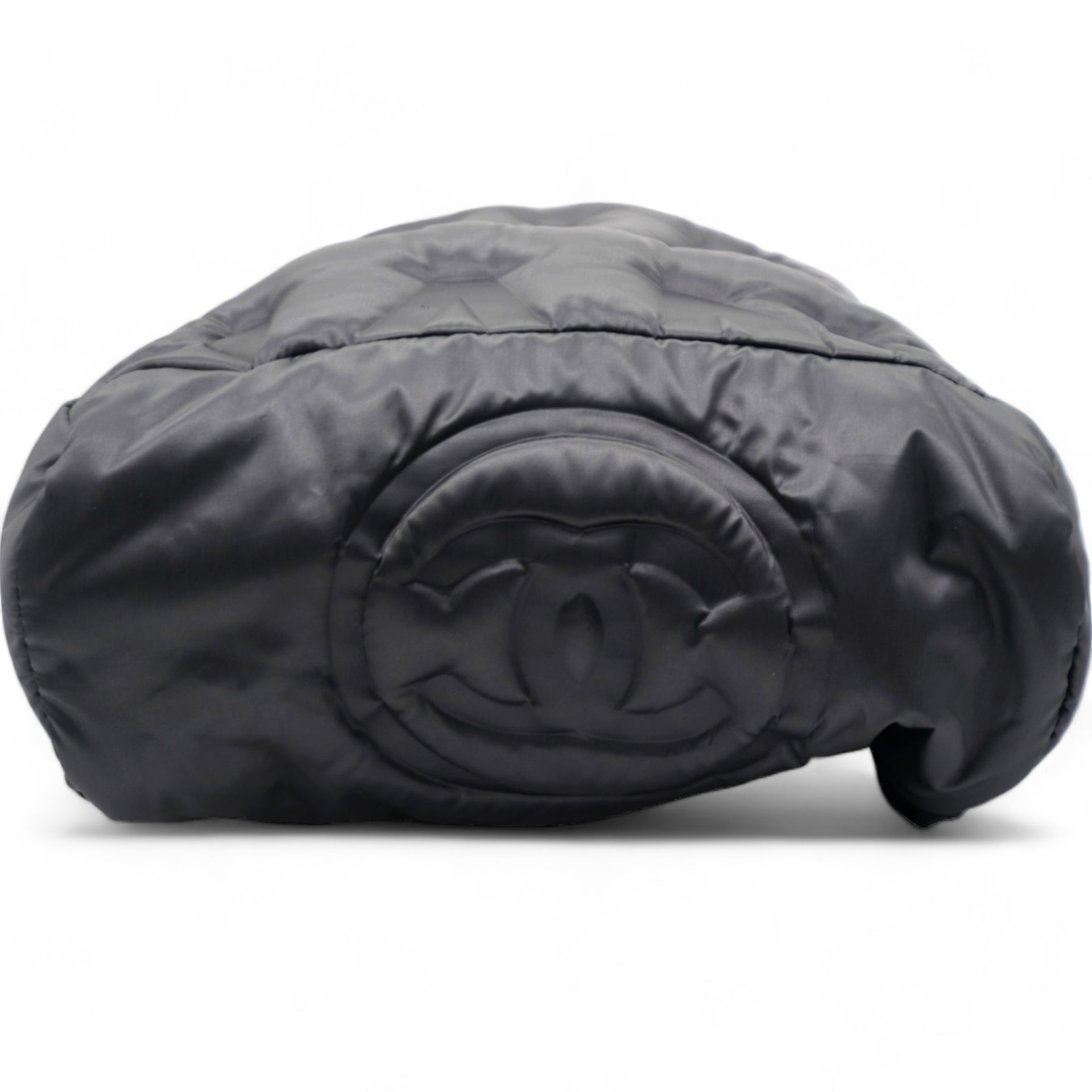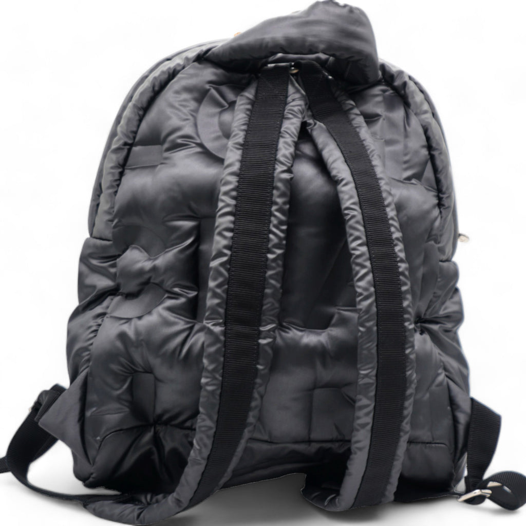 | This is a unique backpack that is finely crafted of soft Chanel embossed nylon in navy blue. The backpack features aged silver hardware and two lengthy shoulder straps. The zipper pull opens to a silver nylon Chanel embossed interior. |
