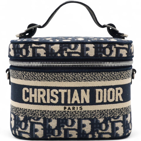 This stylish beauty case is crafted of Dior monogram canvas in navy on beige. The bag features navy blue trim around the edges, a top handle, and aged silver hardware. The zipper opens to a fabric interior with pockets.