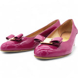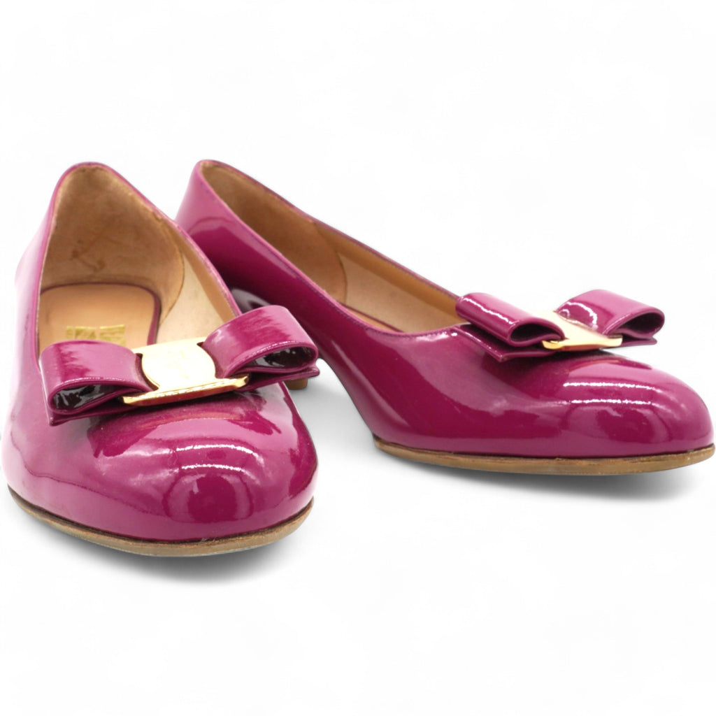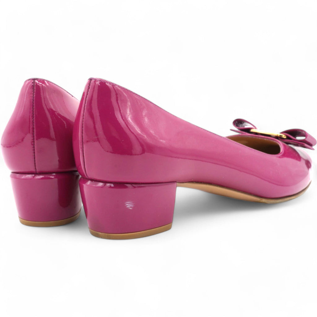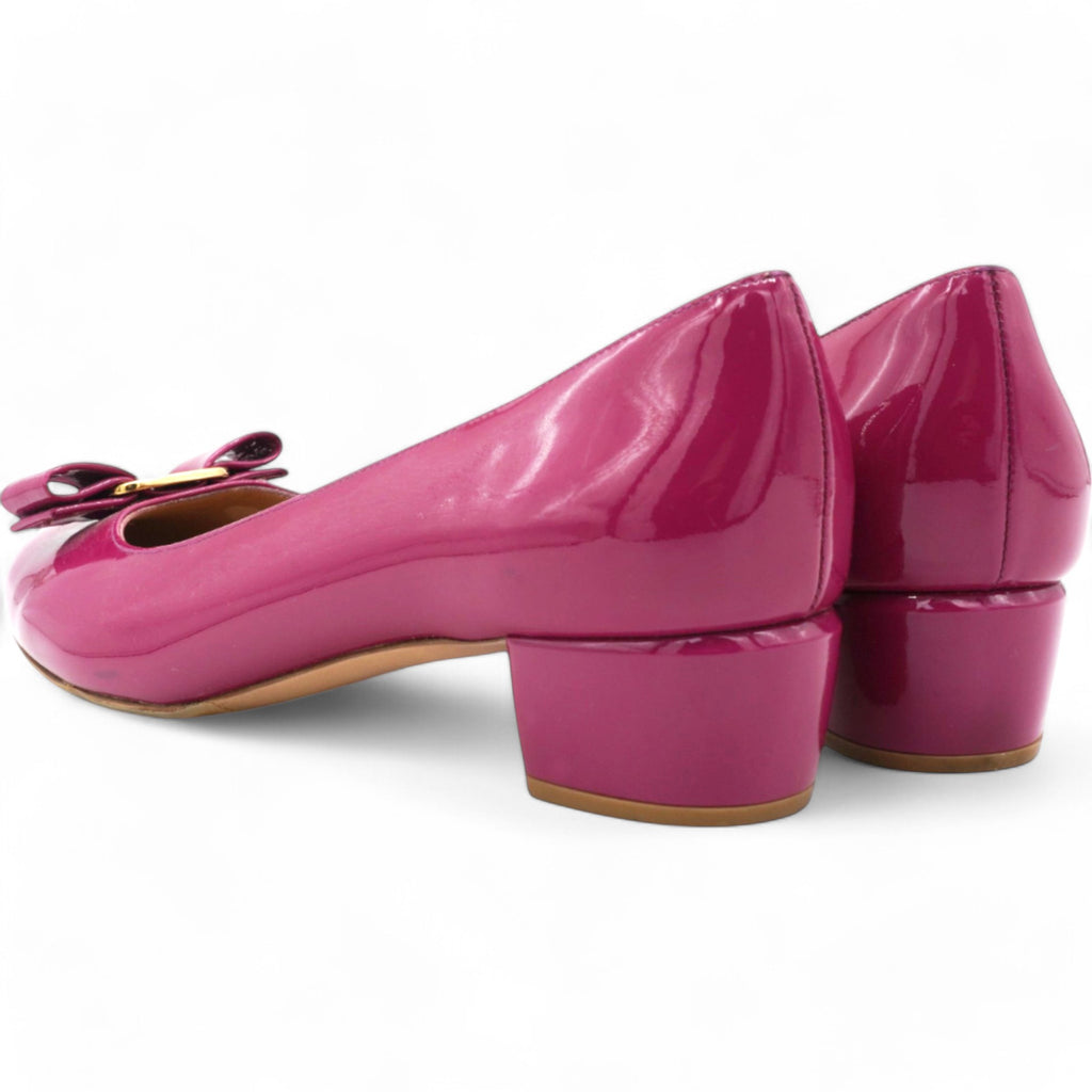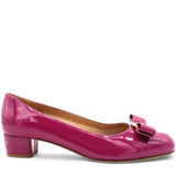 | A Ferragamo classic with a new look. The timeless pump shoe with its rounded toe and wrapped heel has a slightly conical silhouette for a more modern edge. Made of naplak with a tonal Vara bow, this is the perfect slip on to complete formal looks or city daywear |