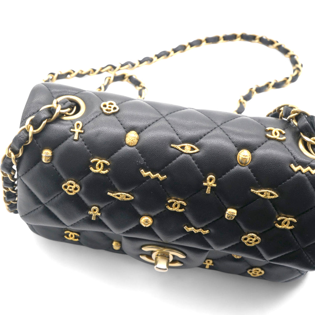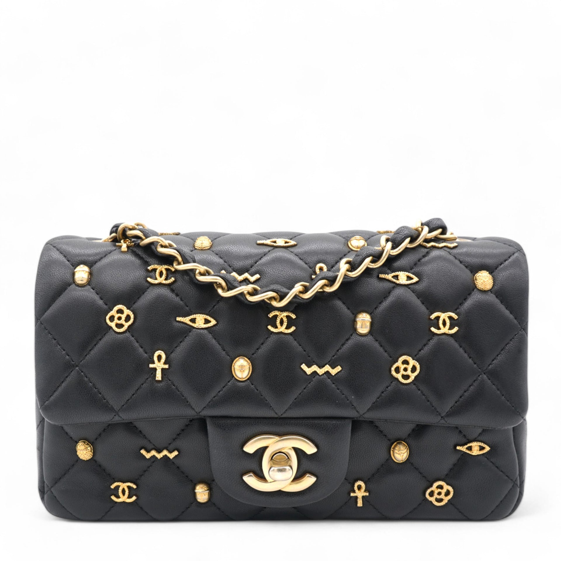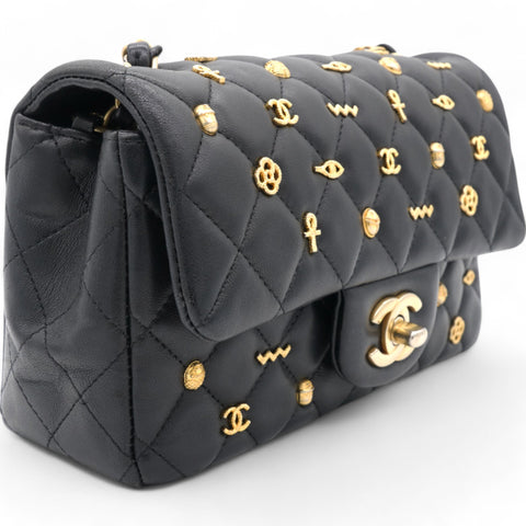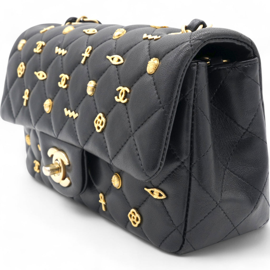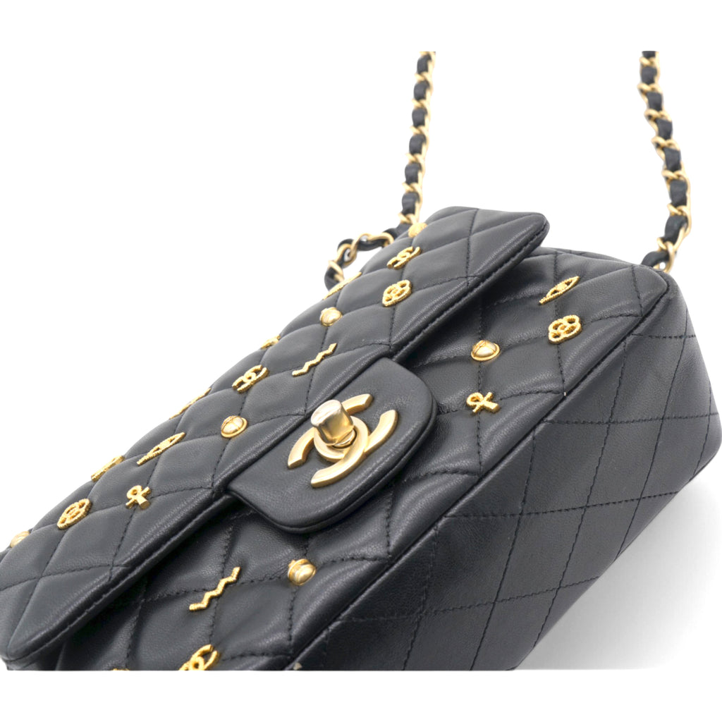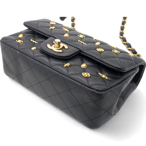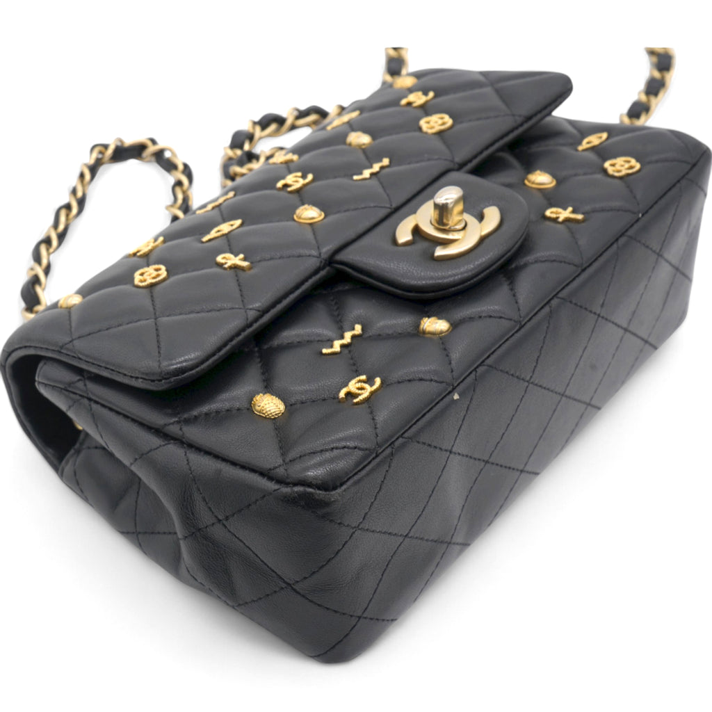 | This stylish classic flap shoulder bag is finely crafted of black diamond quilted leather adorned with exquisitely detailed iconic Chanel charms. The bag features a gold chain-link shoulder strap threaded with leather and a matching gold Chanel CC turn-lock for the facing flap and a rear pocket. This opens to a black leather interior with patch pockets. |