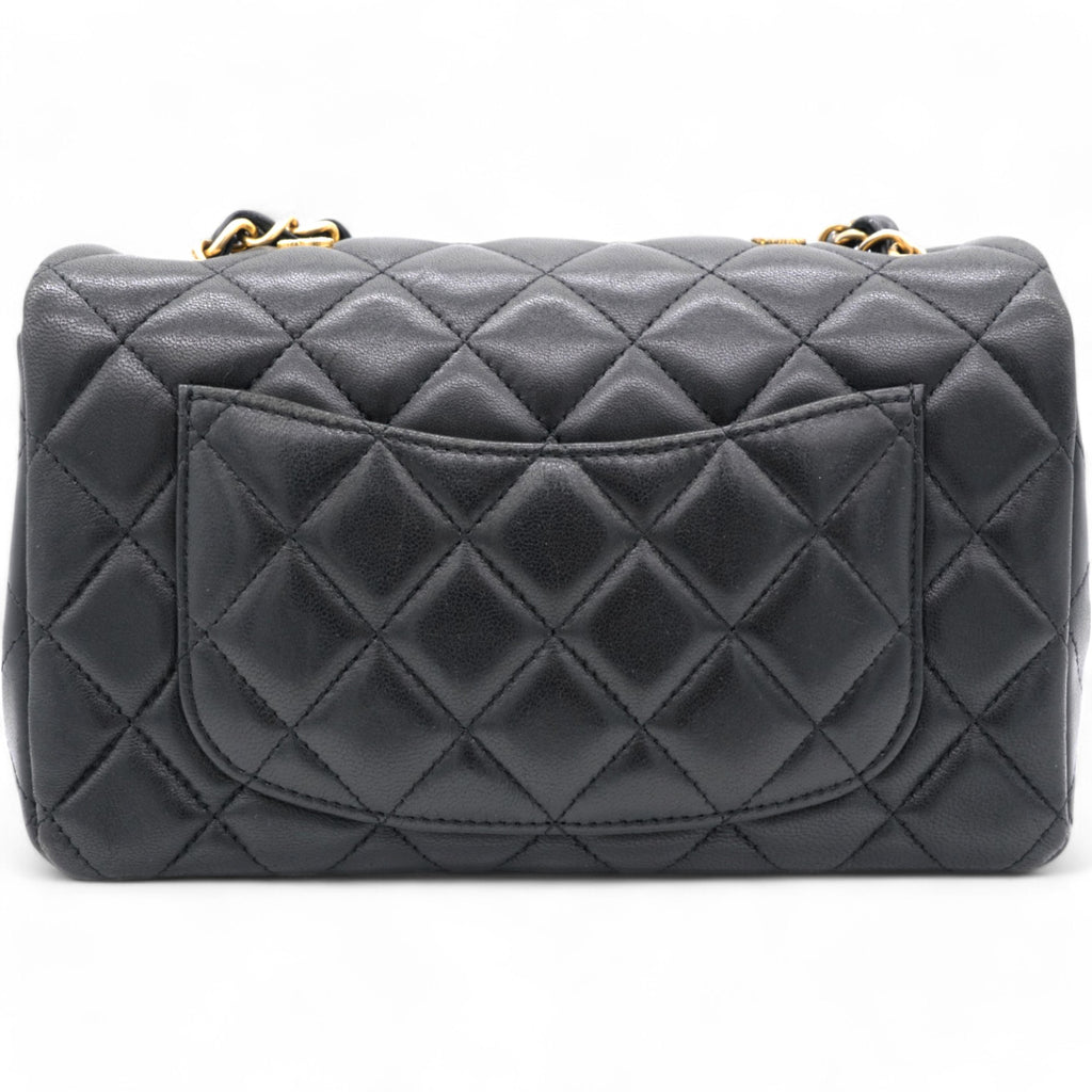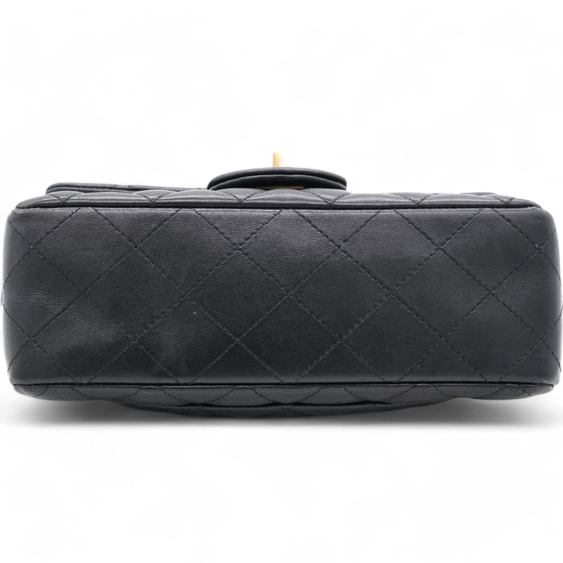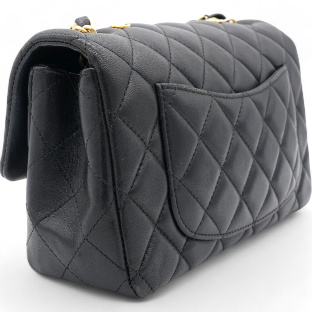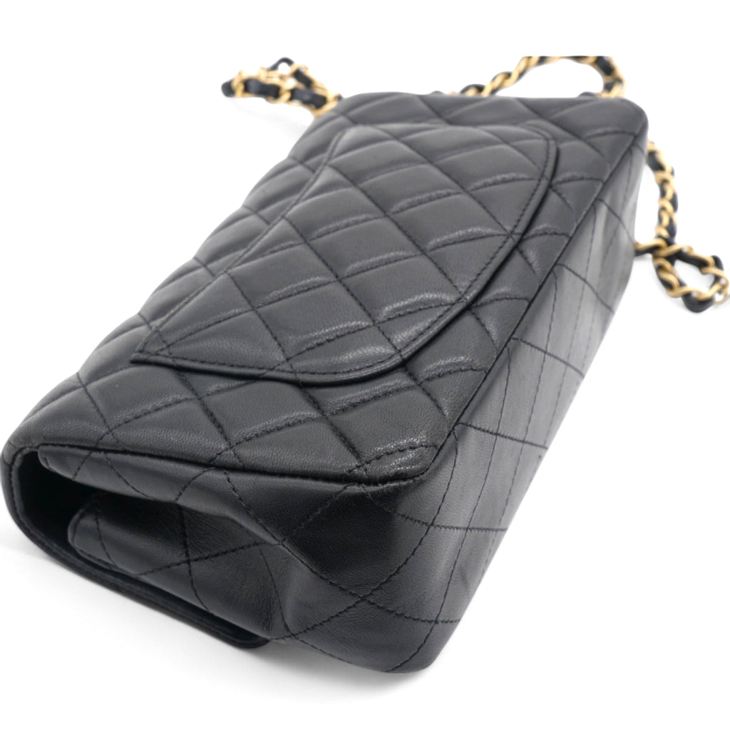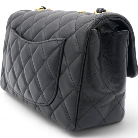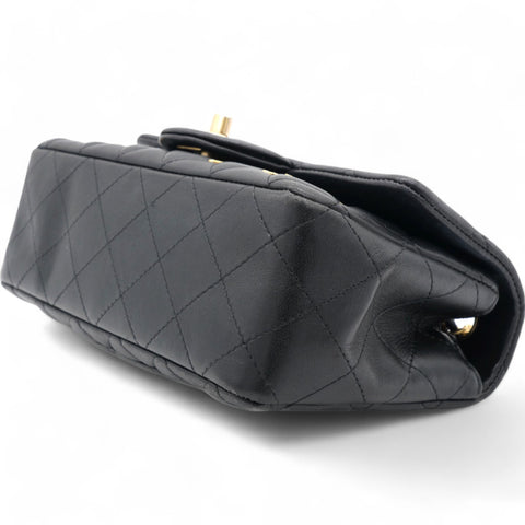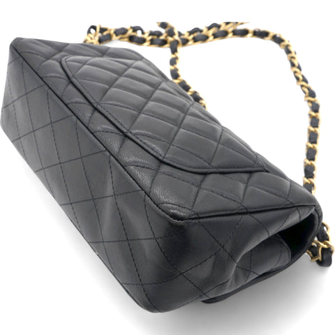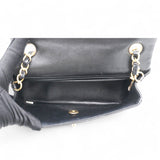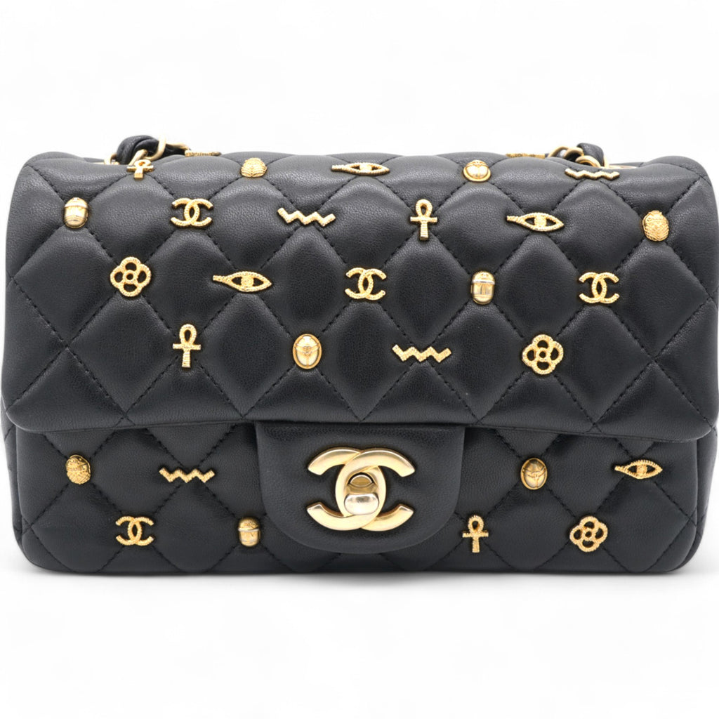 | This stylish classic flap shoulder bag is finely crafted of black diamond quilted leather adorned with exquisitely detailed iconic Chanel charms. The bag features a gold chain-link shoulder strap threaded with leather and a matching gold Chanel CC turn-lock for the facing flap and a rear pocket. This opens to a black leather interior with patch pockets. |