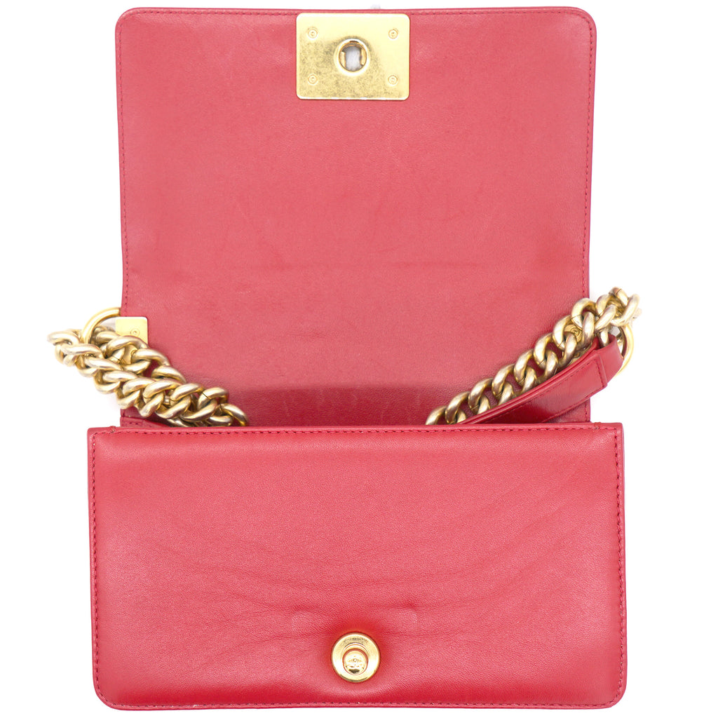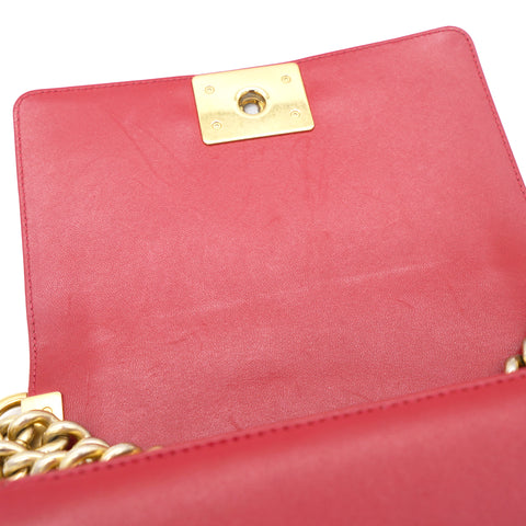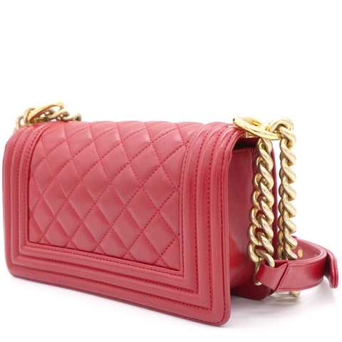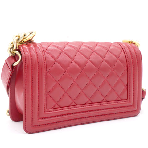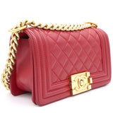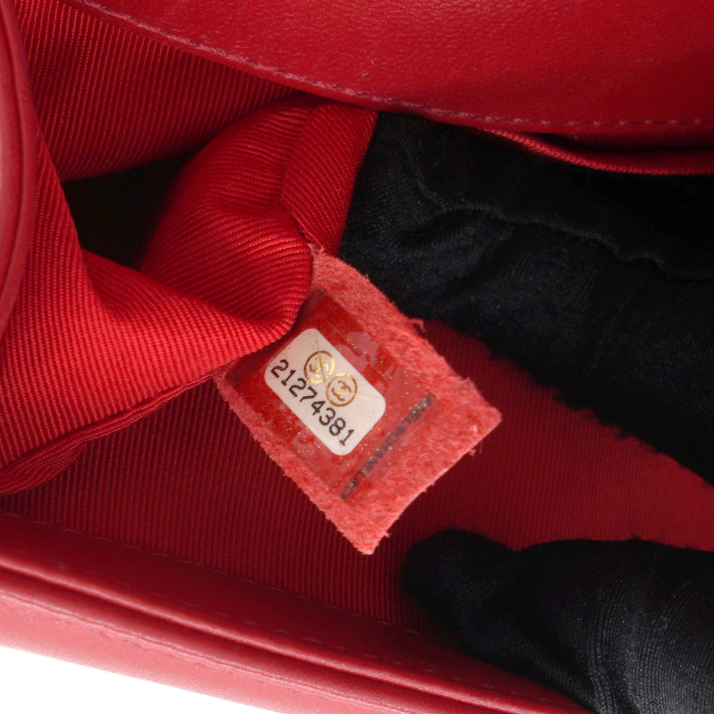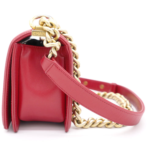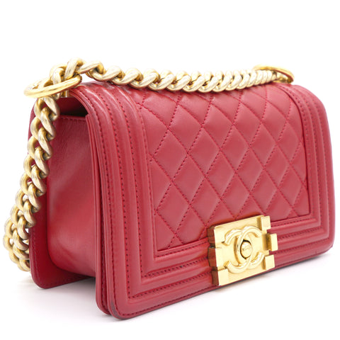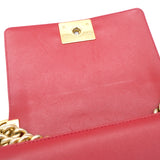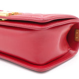 | The Boy flap bag is an icon of Chanel's. This here has been exquisitely crafted from leather. It does not only bring a red shade but also their signature label within the fabric interior and the iconic CC boy push lock on the flap. The piece has gold-tone hardware, and a lovely chain link just so you can easily parade it. This flap bag, with its structured silhouette and classy style, is eyed by women worldwide. Cease the wait and make this luxurious bag yours today |