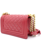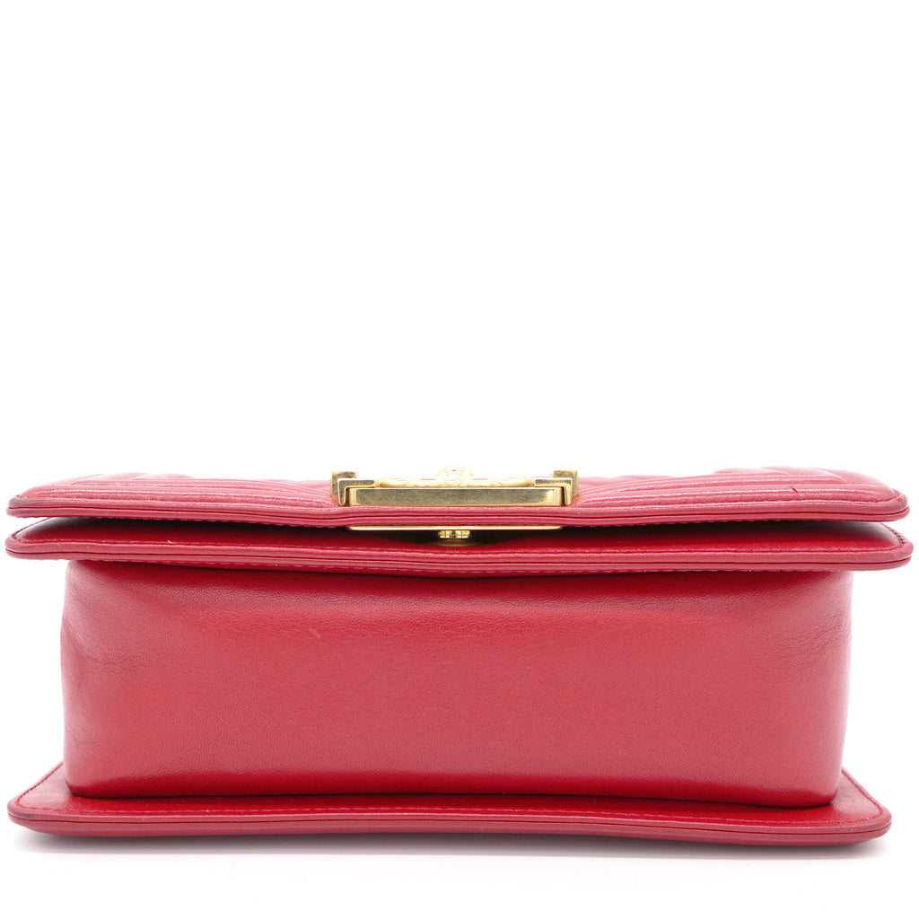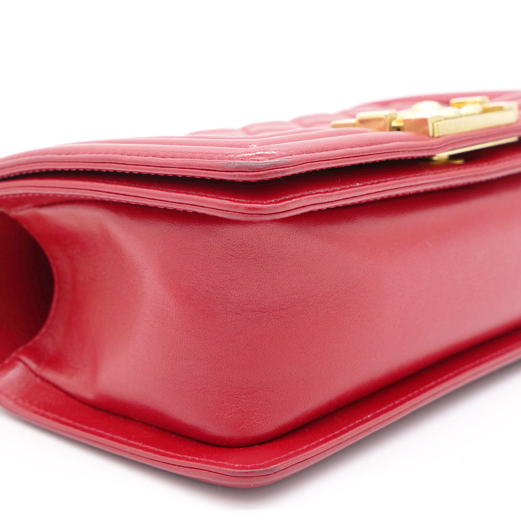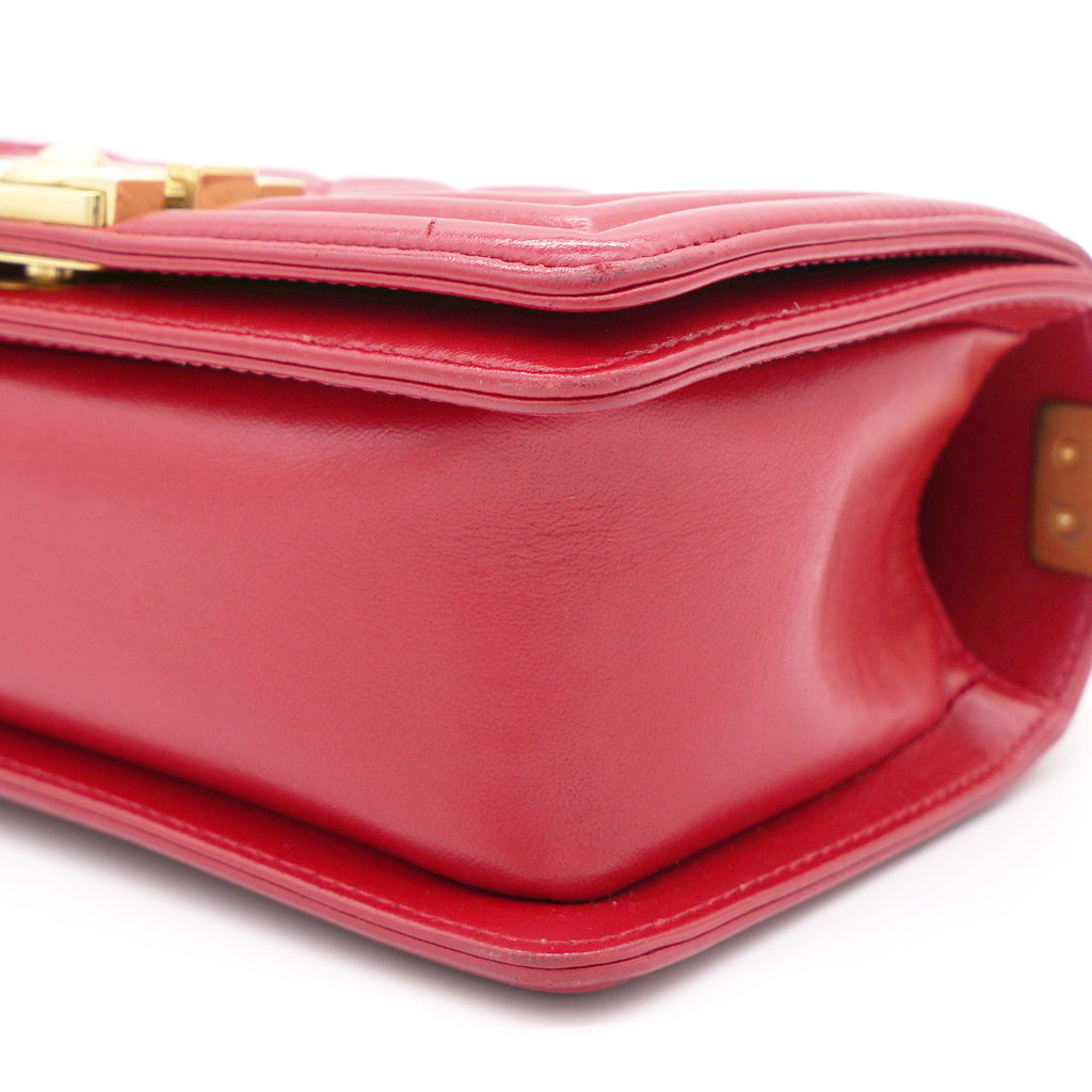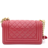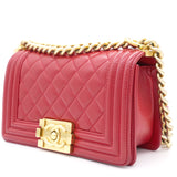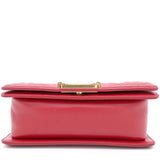 | The Boy flap bag is an icon of Chanel's. This here has been exquisitely crafted from leather. It does not only bring a red shade but also their signature label within the fabric interior and the iconic CC boy push lock on the flap. The piece has gold-tone hardware, and a lovely chain link just so you can easily parade it. This flap bag, with its structured silhouette and classy style, is eyed by women worldwide. Cease the wait and make this luxurious bag yours today |