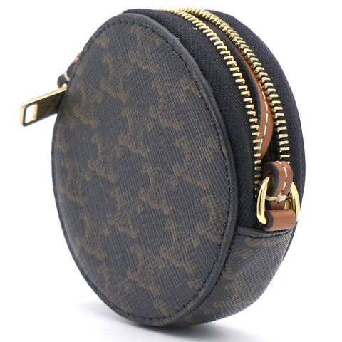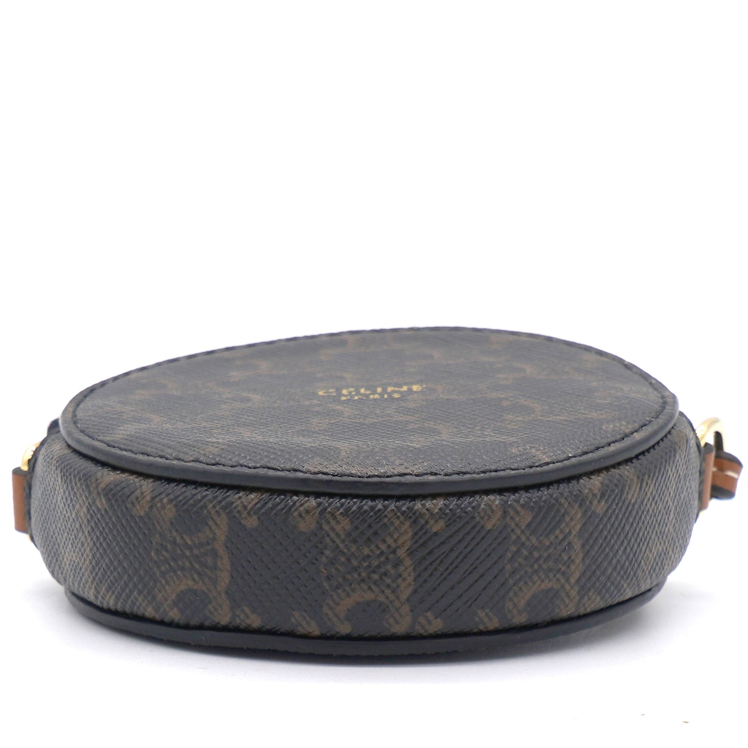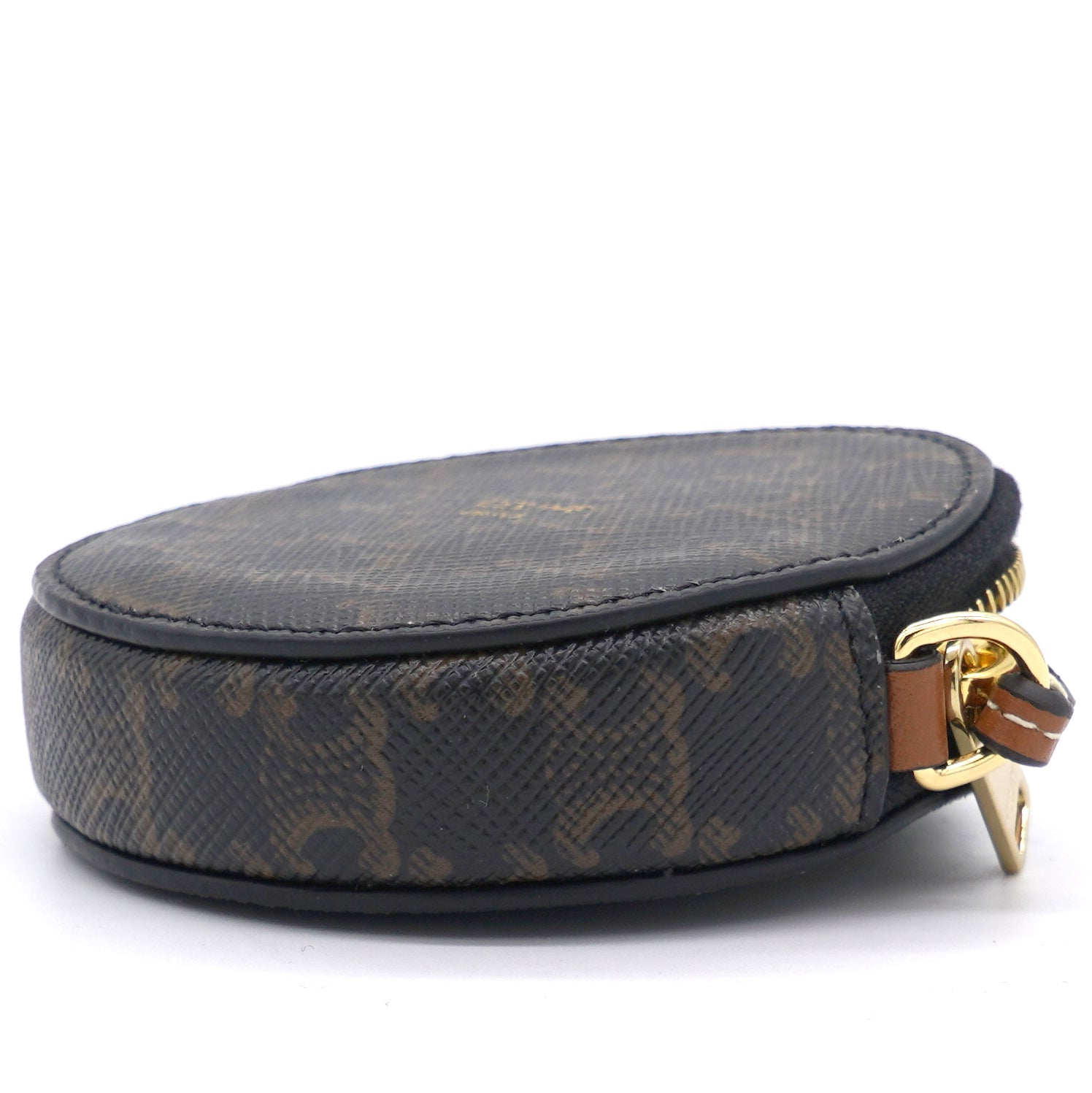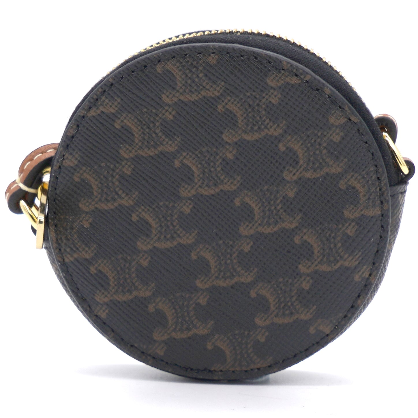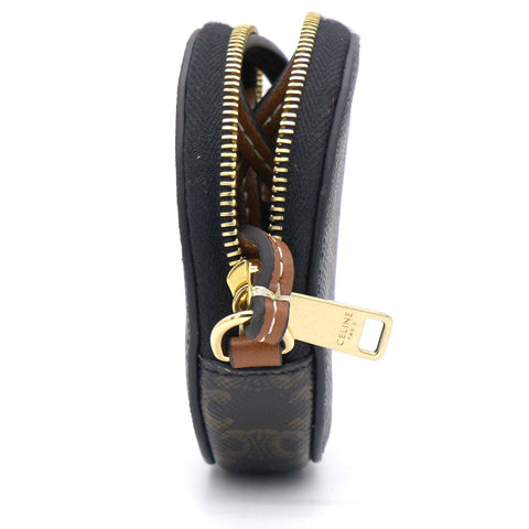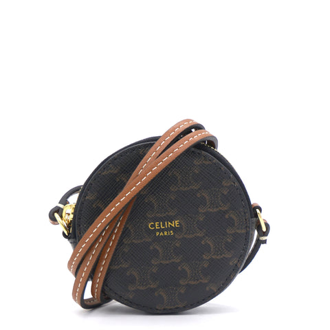 | This micro coin purse is crafted of triophme canvas and lining with textile. The hardware is made if gold finish metal. This bag is attached with a leather strap which can be crossbody and cannot be removed. |