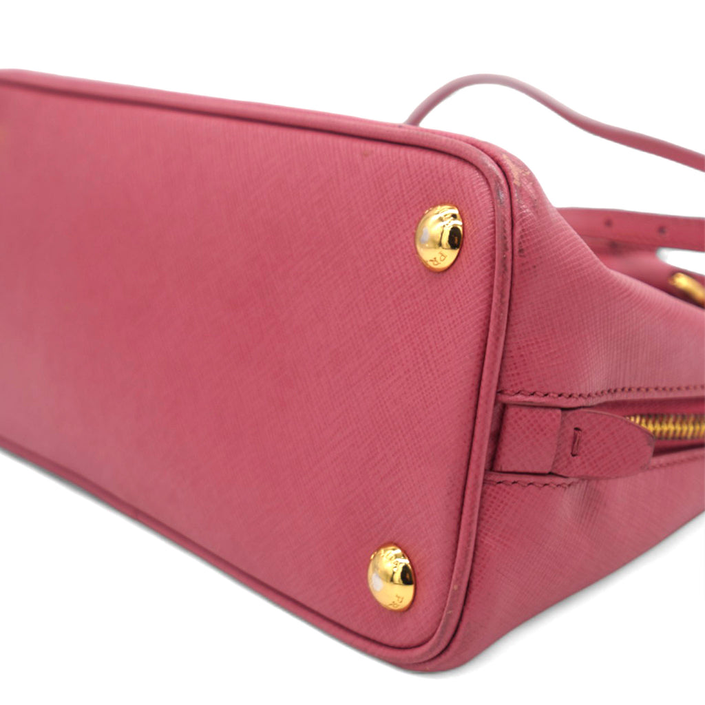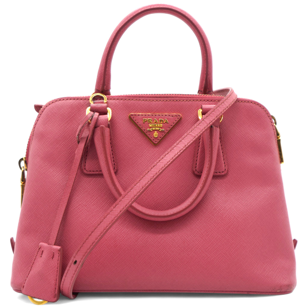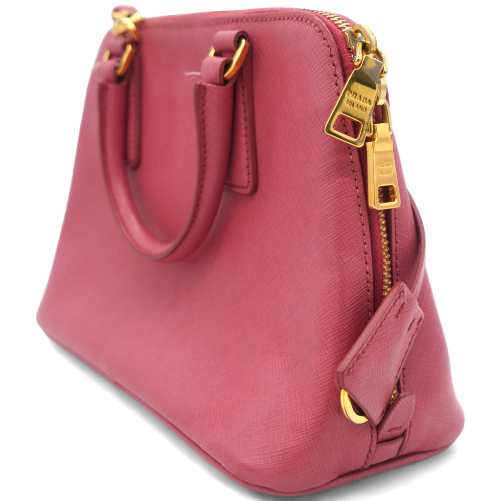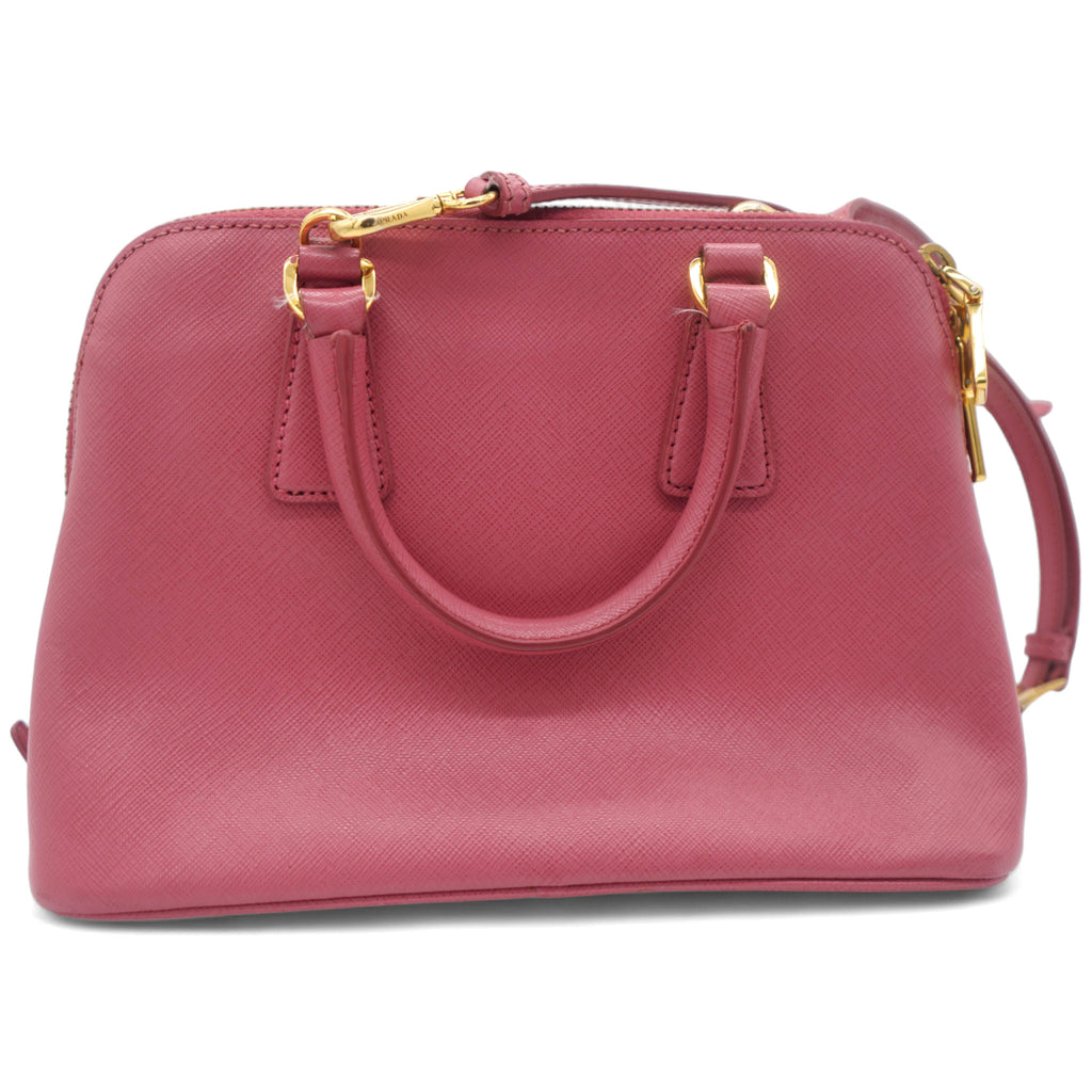 | This chic tote is crafted of signature saffiano leather in pink. The bag features rolled leather top handles with brass links, and a hanging clochette with a key ring. The zippers open to a matching monogram fabric interior with zippers, an excellent tote for everyday essentials, from Prada! |