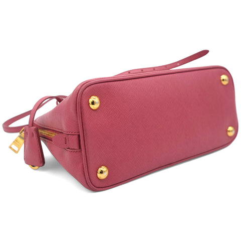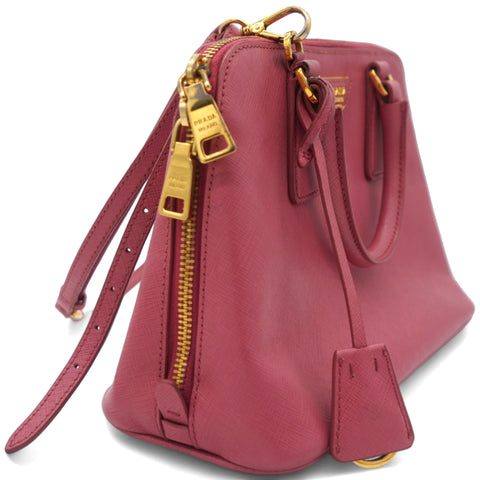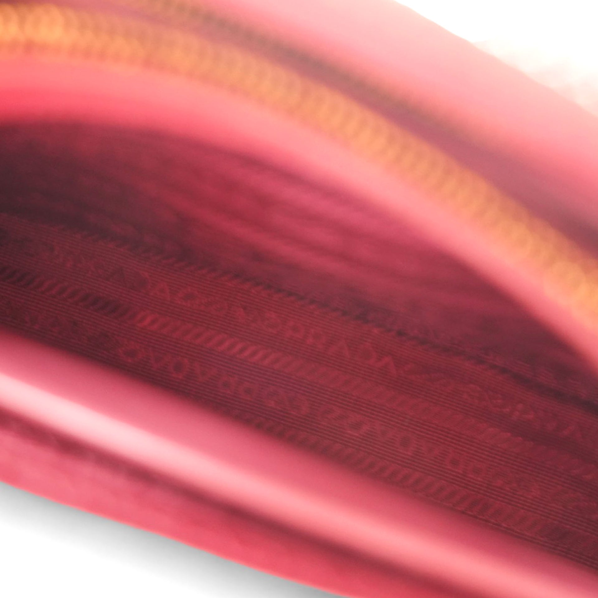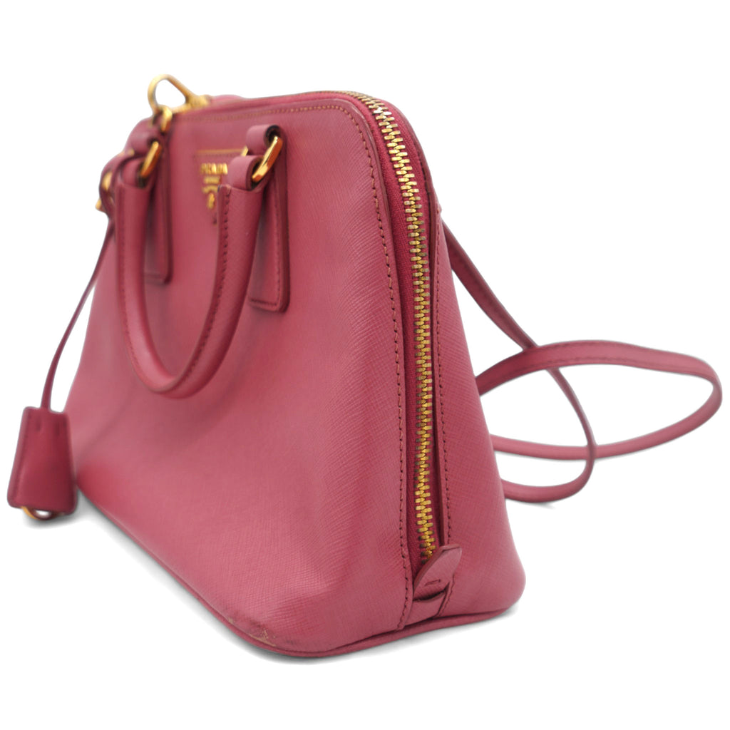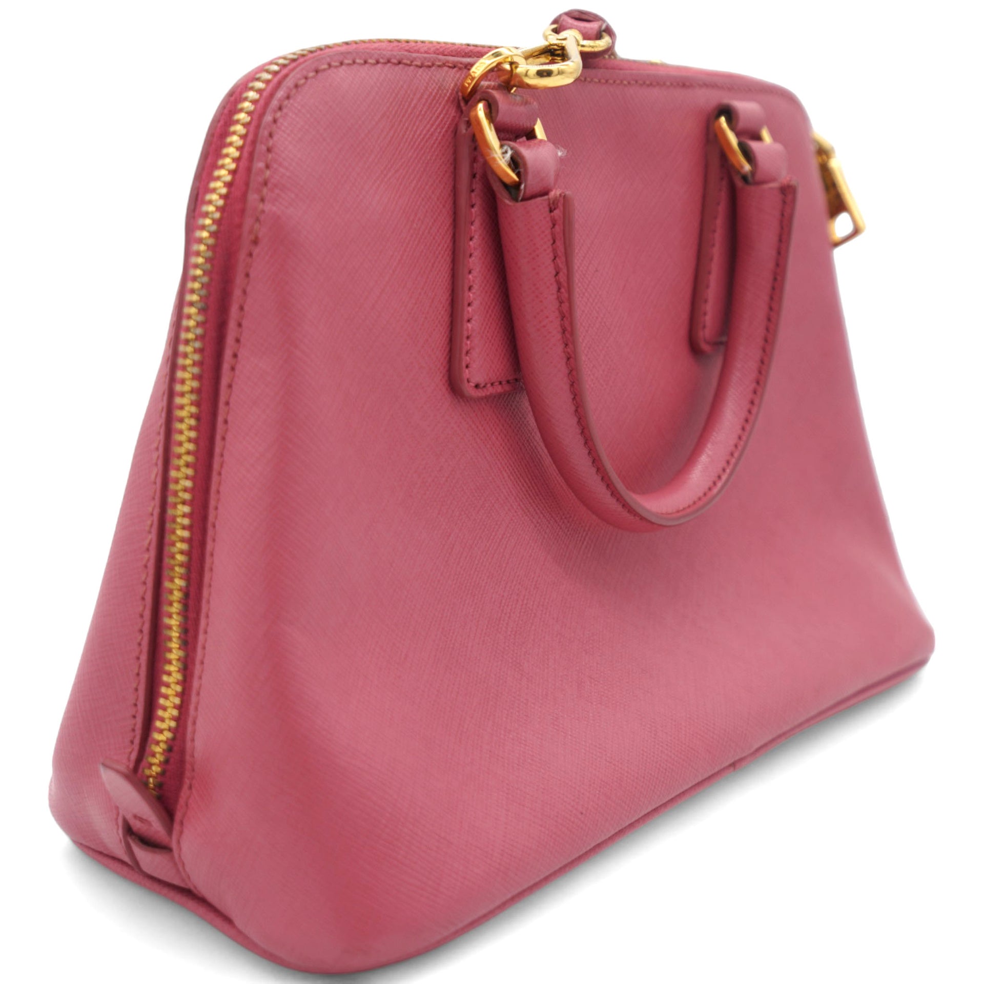| This chic tote is crafted of signature saffiano leather in pink. The bag features rolled leather top handles with brass links, and a hanging clochette with a key ring. The zippers open to a matching monogram fabric interior with zippers, an excellent tote for everyday essentials, from Prada! |
