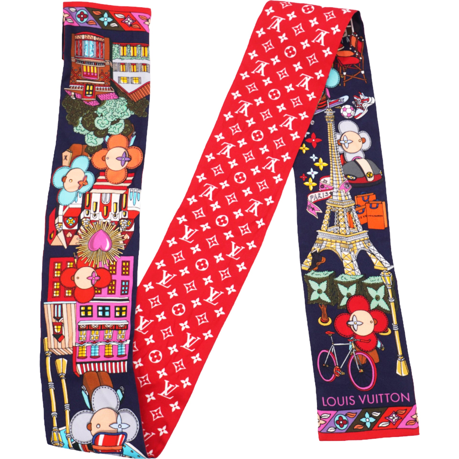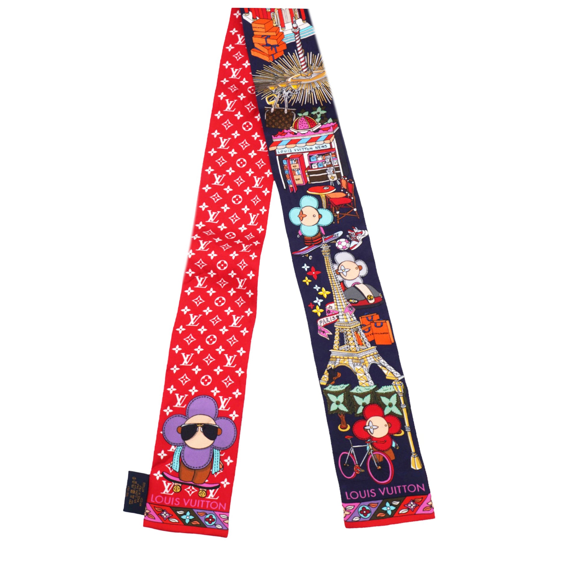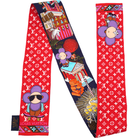 | This very chic 100% silk scarf features motifs such as Vivienne as a twin, with the Louis Vuitton mini monogram background in red on the opposite side. |
