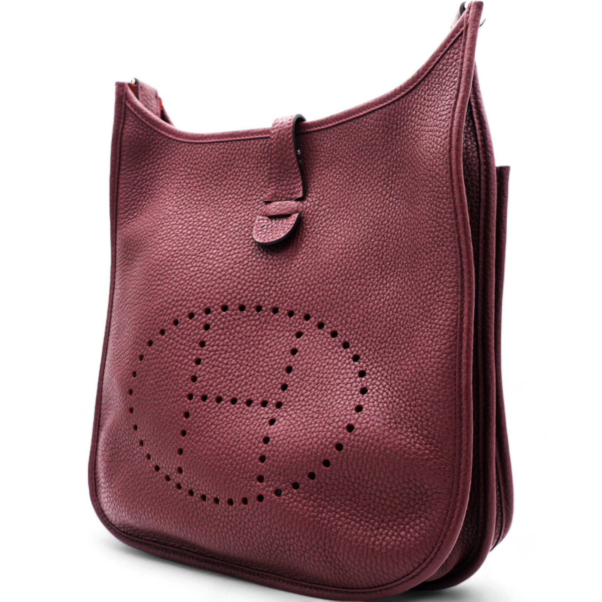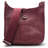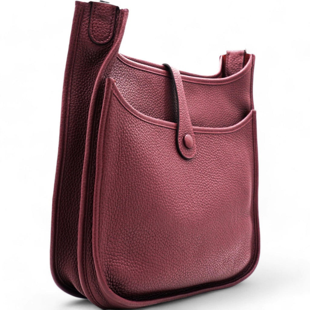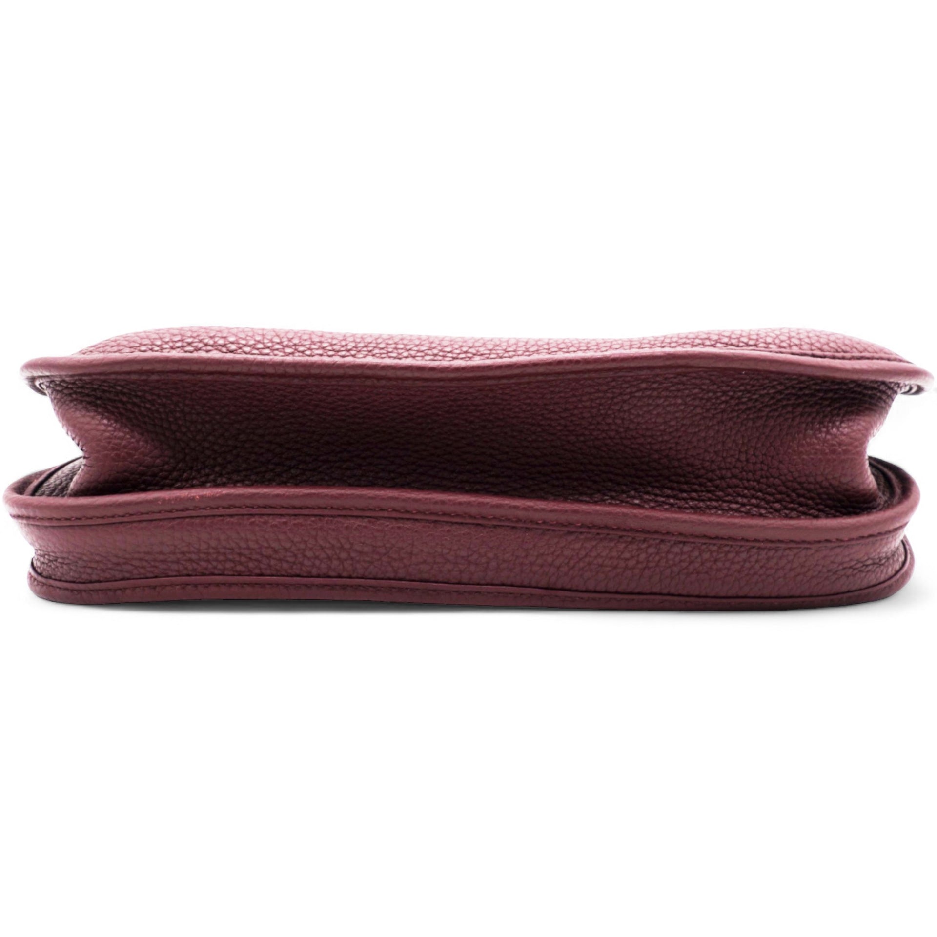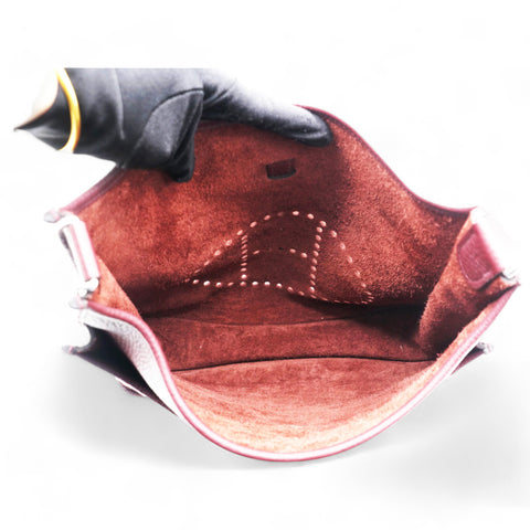| This stylish messenger bag is crafted of a beautiful shade of pinkish red Taurillon Clemence calfskin leather and features an adjustable matching nylon shoulder strap. This bag is detailed with palladium silver hardware, a rear pocket, and a perforated Hermes H oval on the face of the bag. The top of the bag opens with a cross over strap to a suede interior. |