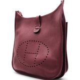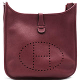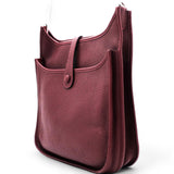 This stylish messenger bag is crafted of a beautiful shade of pinkish red Taurillon Clemence calfskin leather and features an adjustable matching nylon shoulder strap. This bag is detailed with palladium silver hardware, a rear pocket, and a perforated Hermes H oval on the face of the bag. The top of the bag opens with a cross over strap to a suede interior.