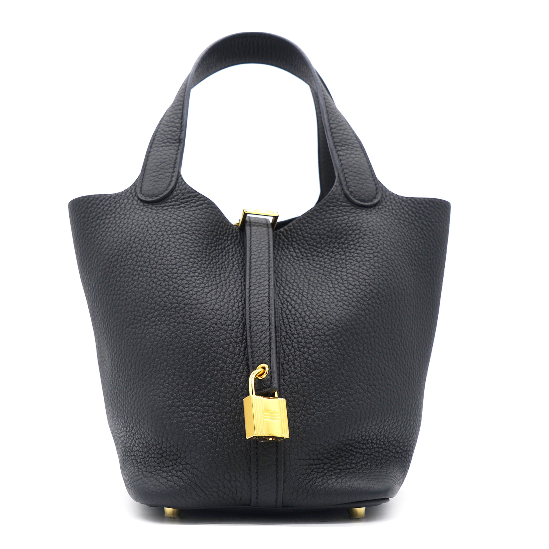 | This chic tote is crafted of textured clemence calfskin leather in black. This bucket-style bag features a unique one-piece reinforced design with leather top handles and a closure strap that can be secured by a polished gold padlock. This opens to a spacious grey suede interior. |