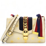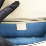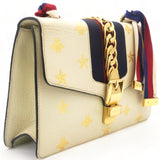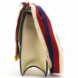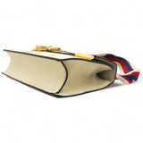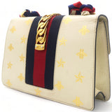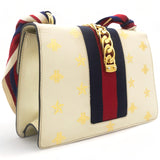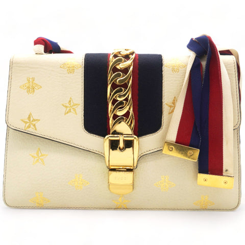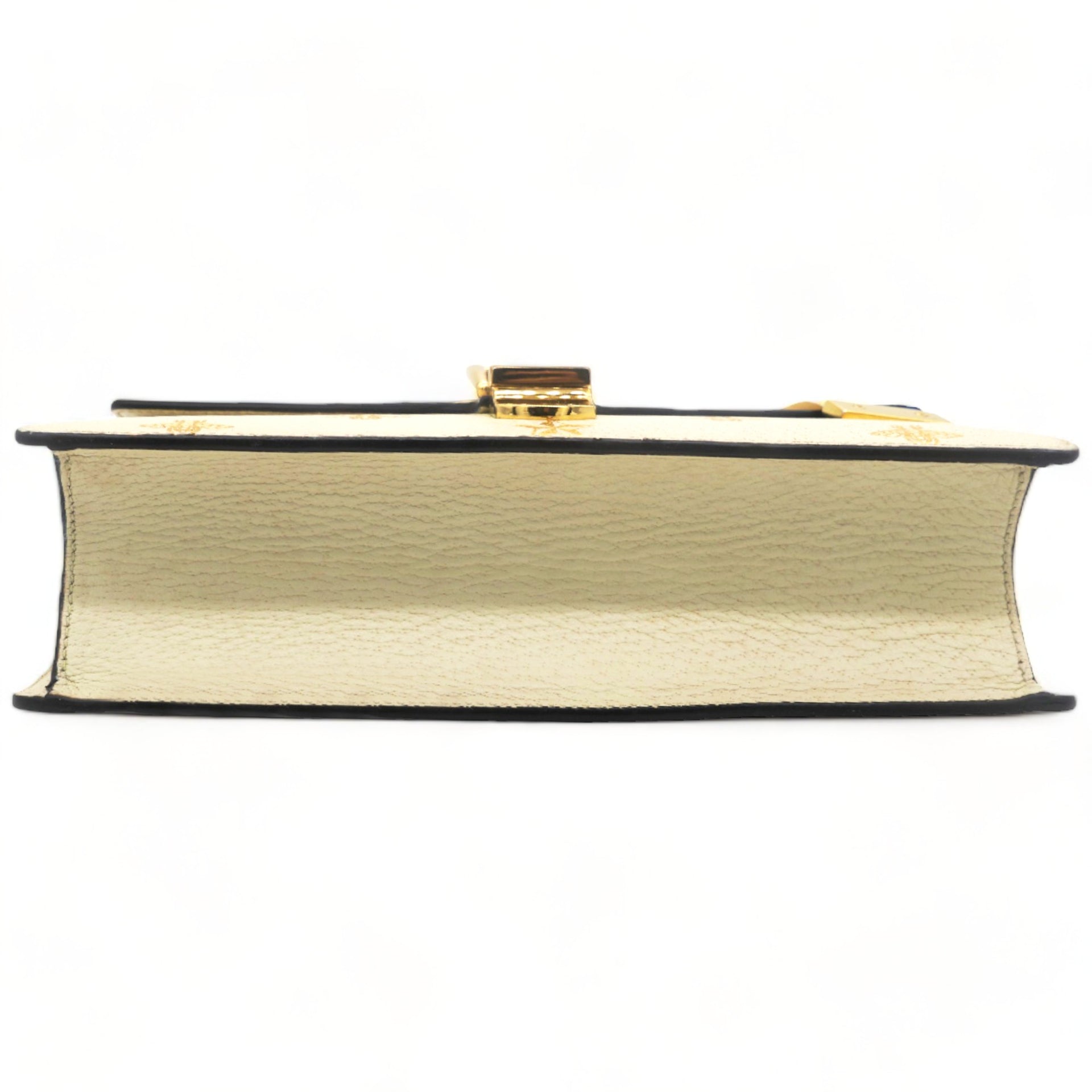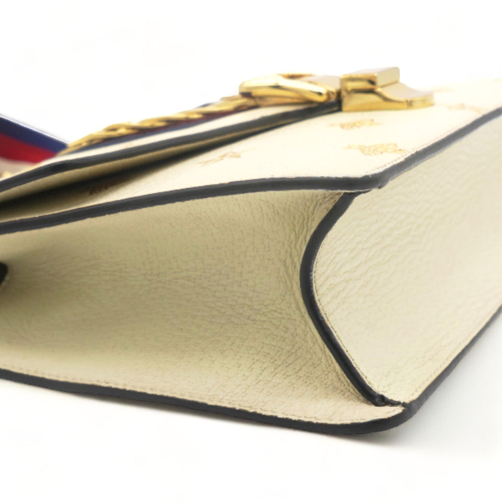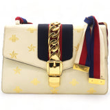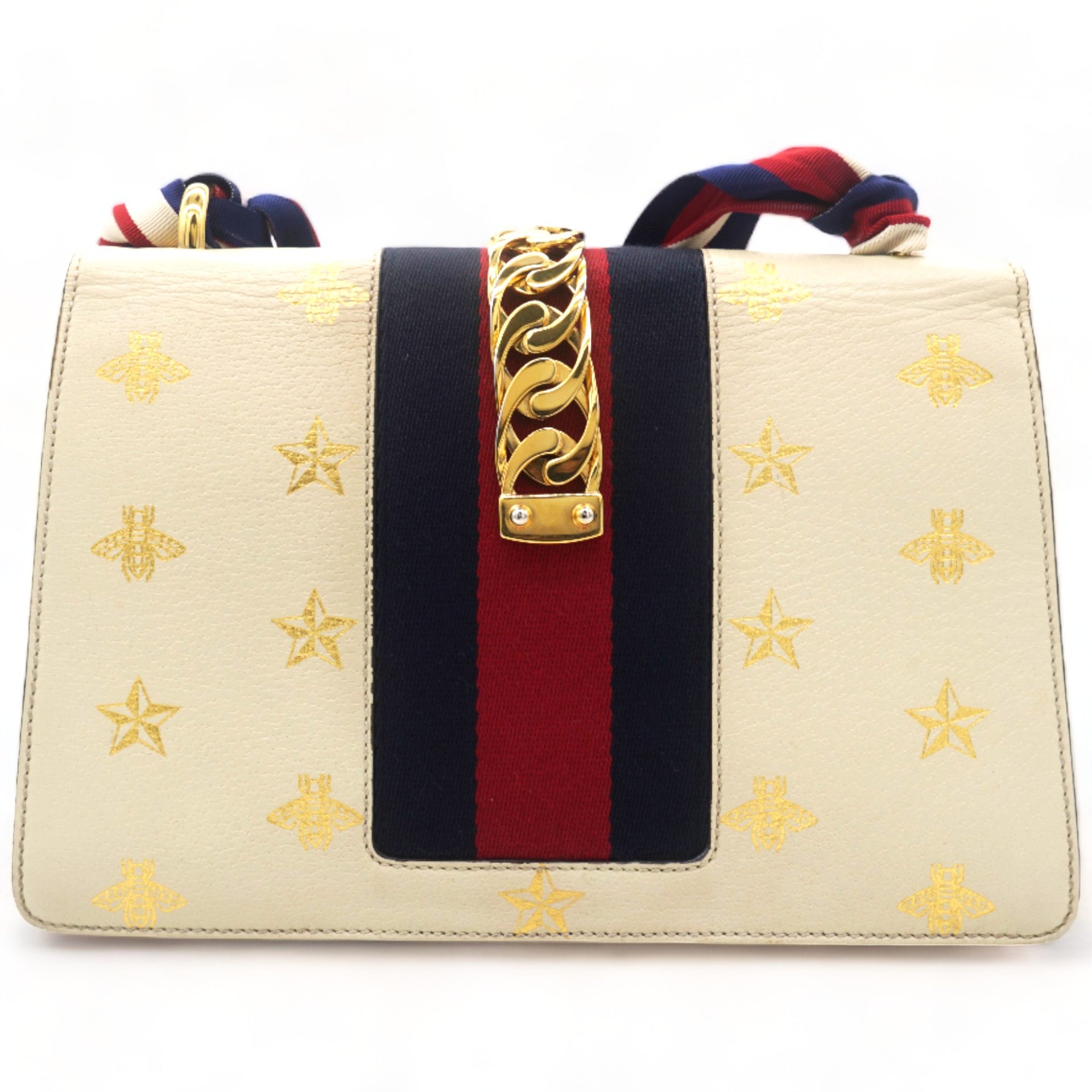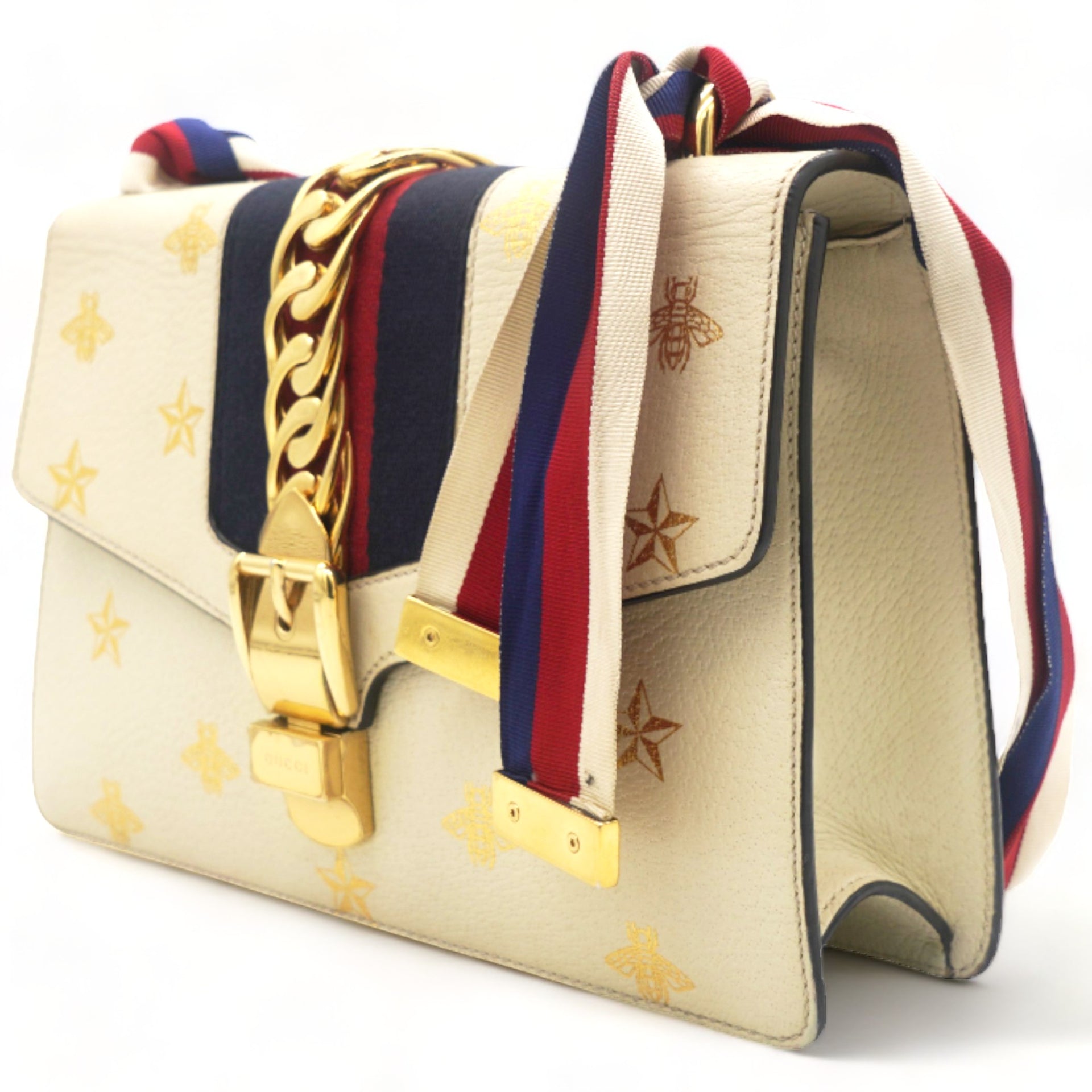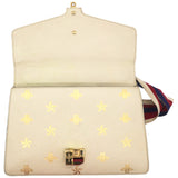 | This chic shoulder bag is crafted of grained beige calfskin leather, with bees and stars printed in gold foil. The crossover flap is detailed with a central red and blue canvas web stripe, and a gold chain-link detail. There is an adjustable beige leather shoulder strap, and an optional red, white, and blue canvas web stripe strap. The bag opens to a light blue fabric interior with zipper and patch pockets. |