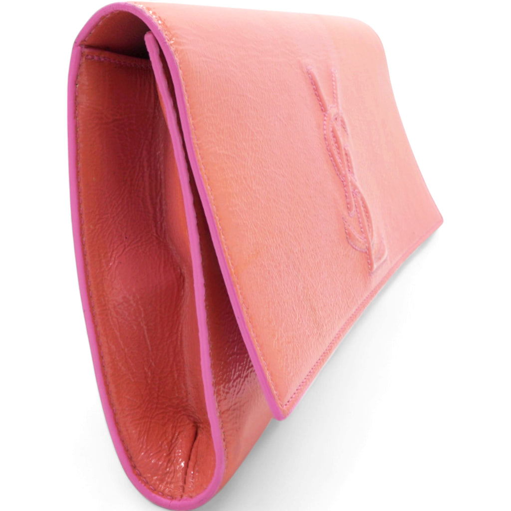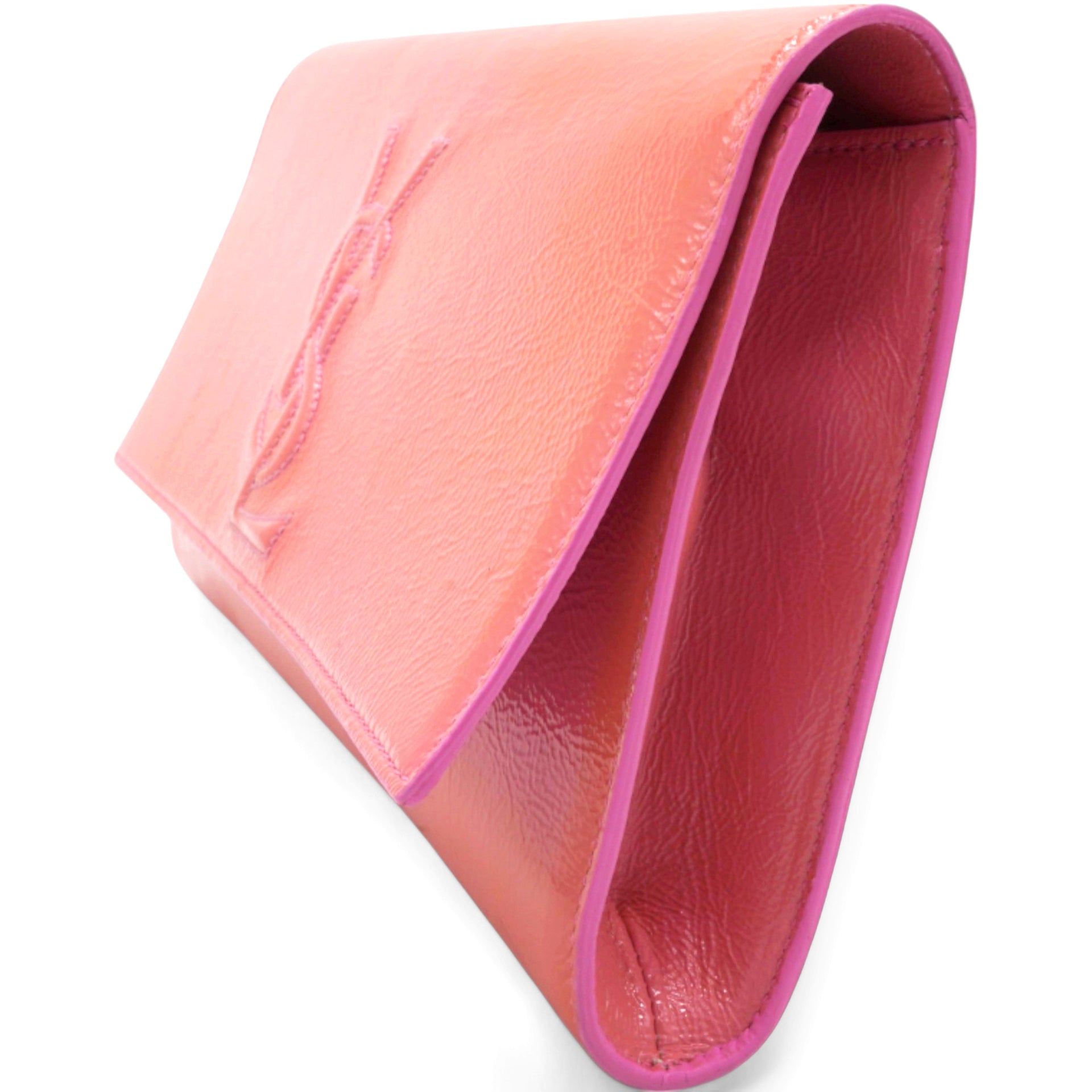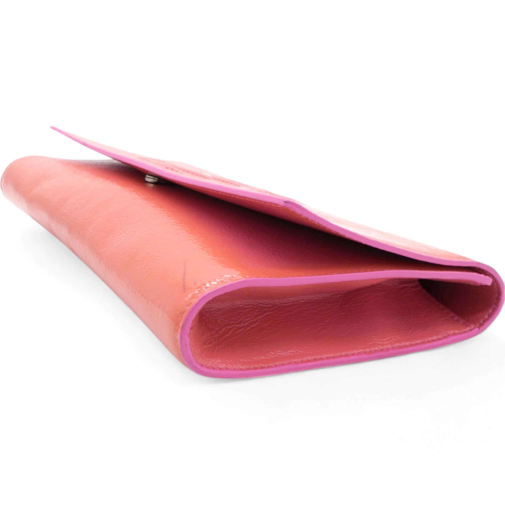 | This chic clutch is crafted of rich patent leather in pink with a classic quilted YSL logo at the flap. This opens to a black satin fabric lining with a patch pocket. |