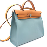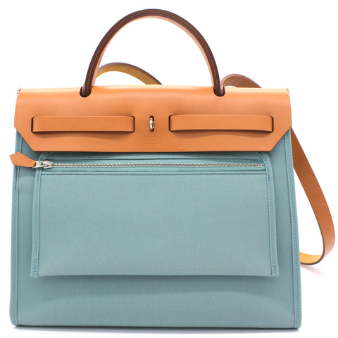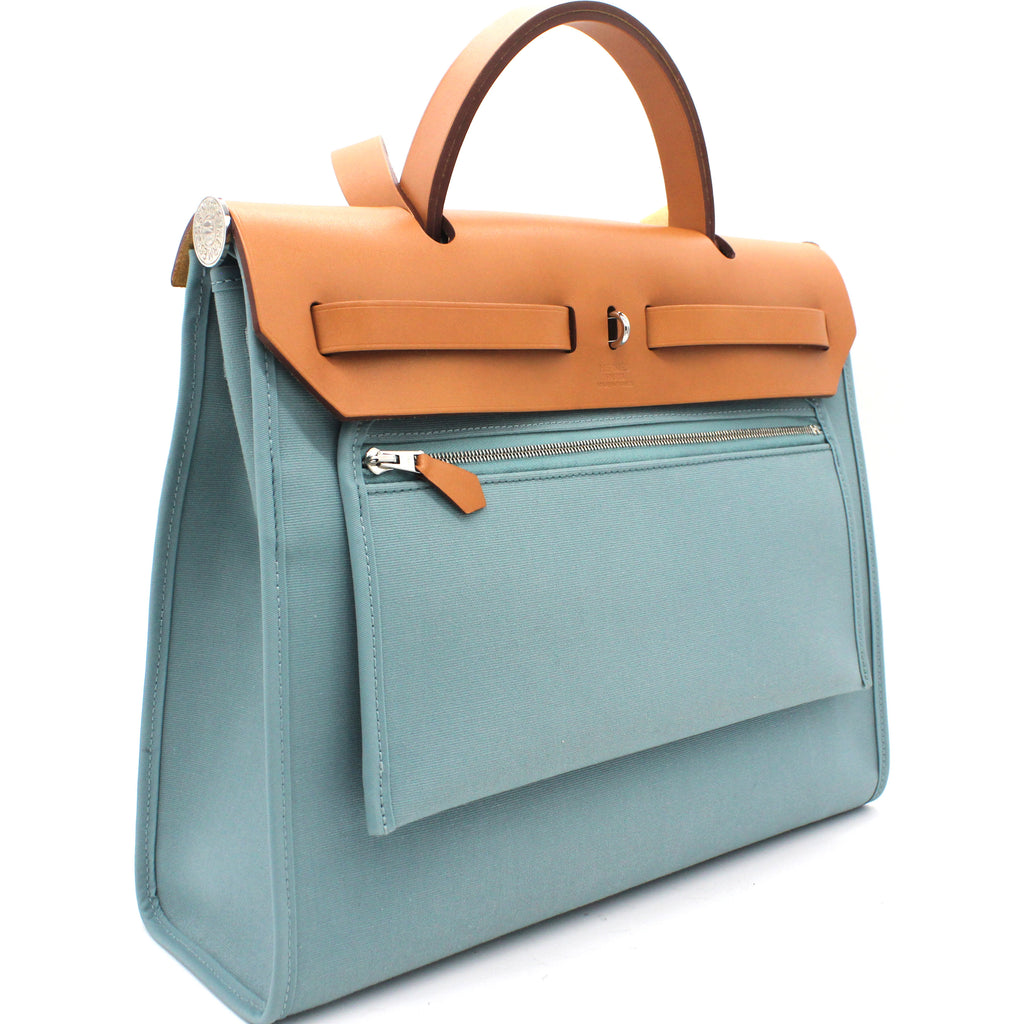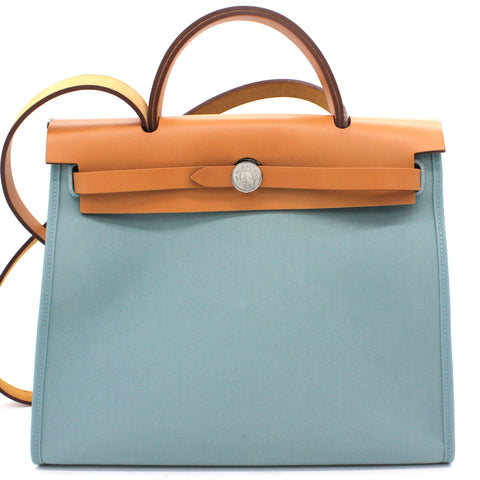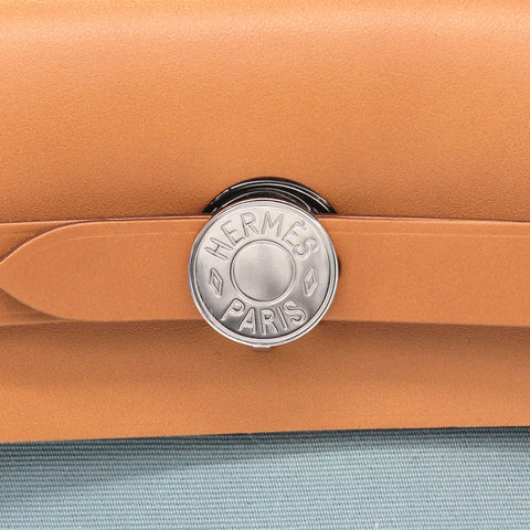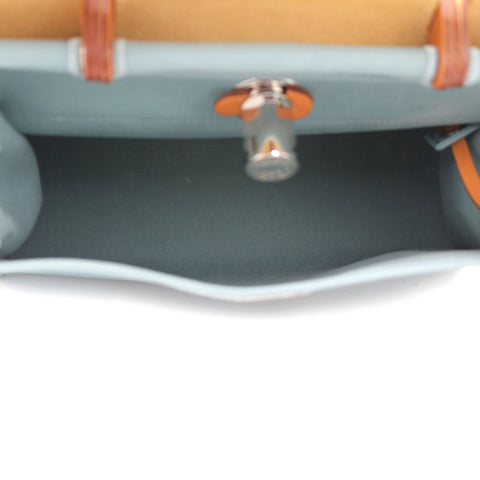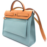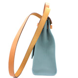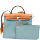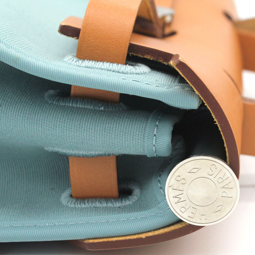 Constructed with blue fabric and light brown leather, this functional shoulder bag showcases vache hunter leather handle and flap as well as a longer strap for hands-free accessibility and palladium hardware accents. Its frontal lock opens to a blue fabric-lined interior perfect for daily essentials.