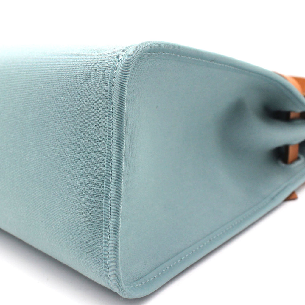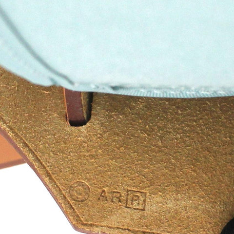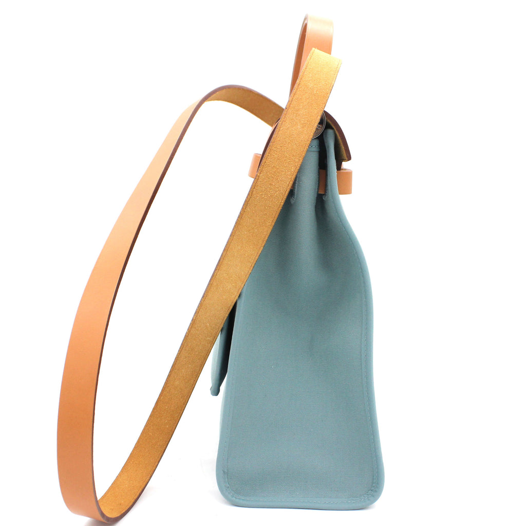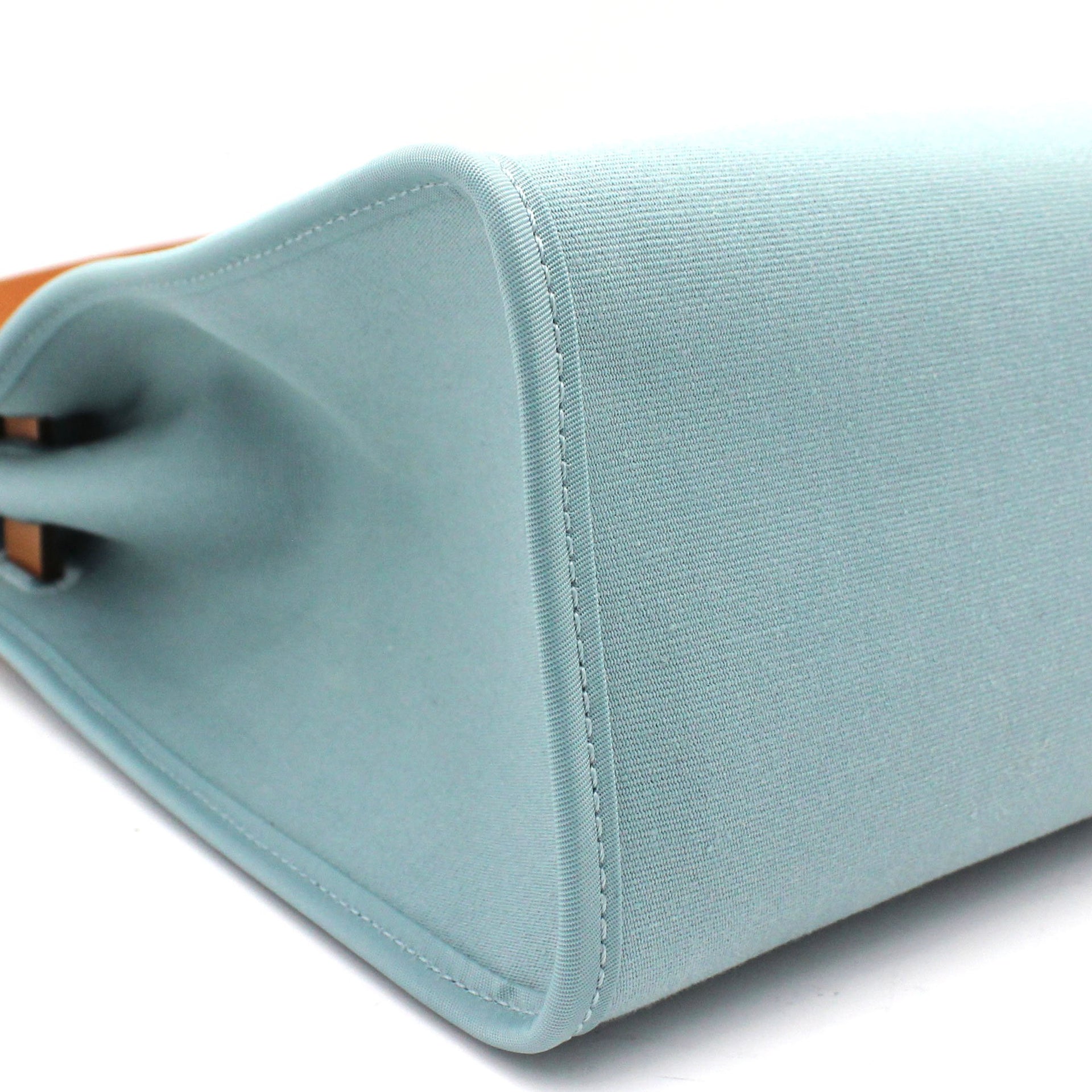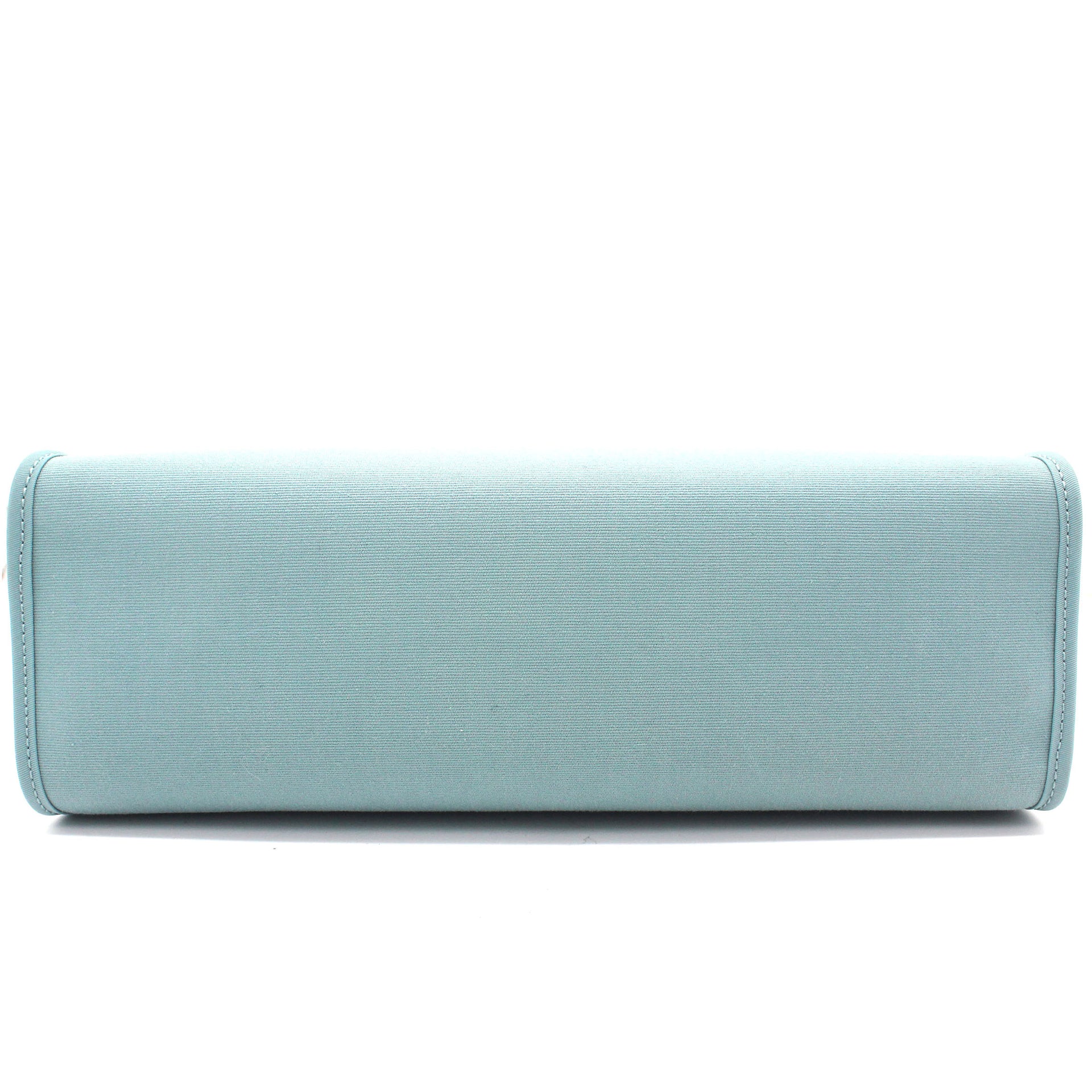 Exterior Material: Blue fabric and light brown leather with leather handle and a long strap