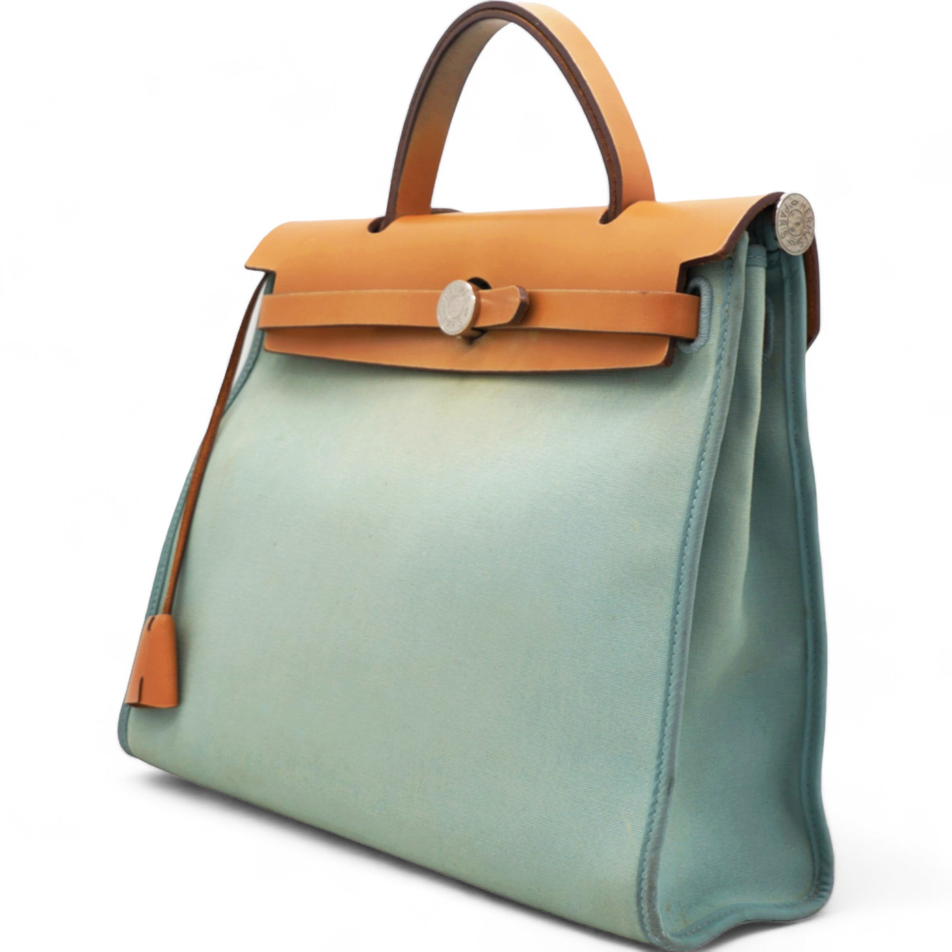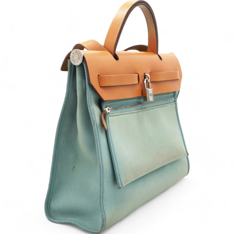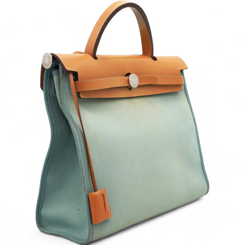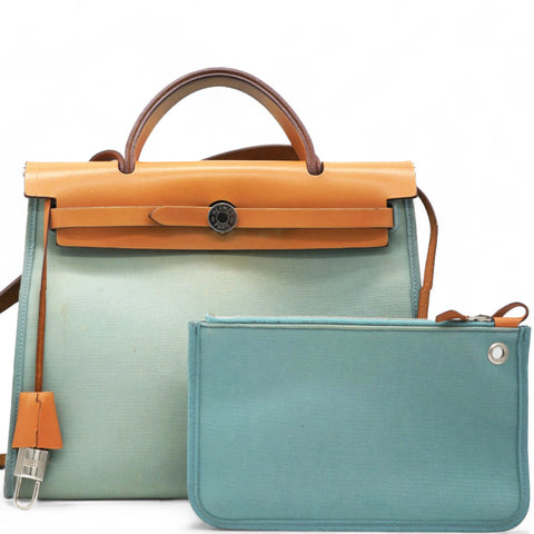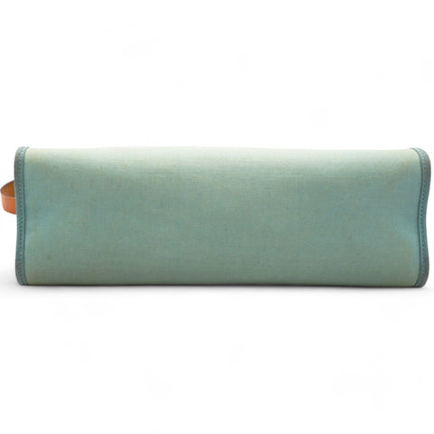 | This stylish tote is crafted of sturdy toile canvas in light blue. The shoulder bag features a a rear exterior zip pocket, a natural leather top crest with a leather top handle, shoulder strap and strap closure with polished palladium silver hardware with a padlock. This opens to a toile canvas interior with a matching pochette. This is a fantastic tote for everyday use, from Hermes! |