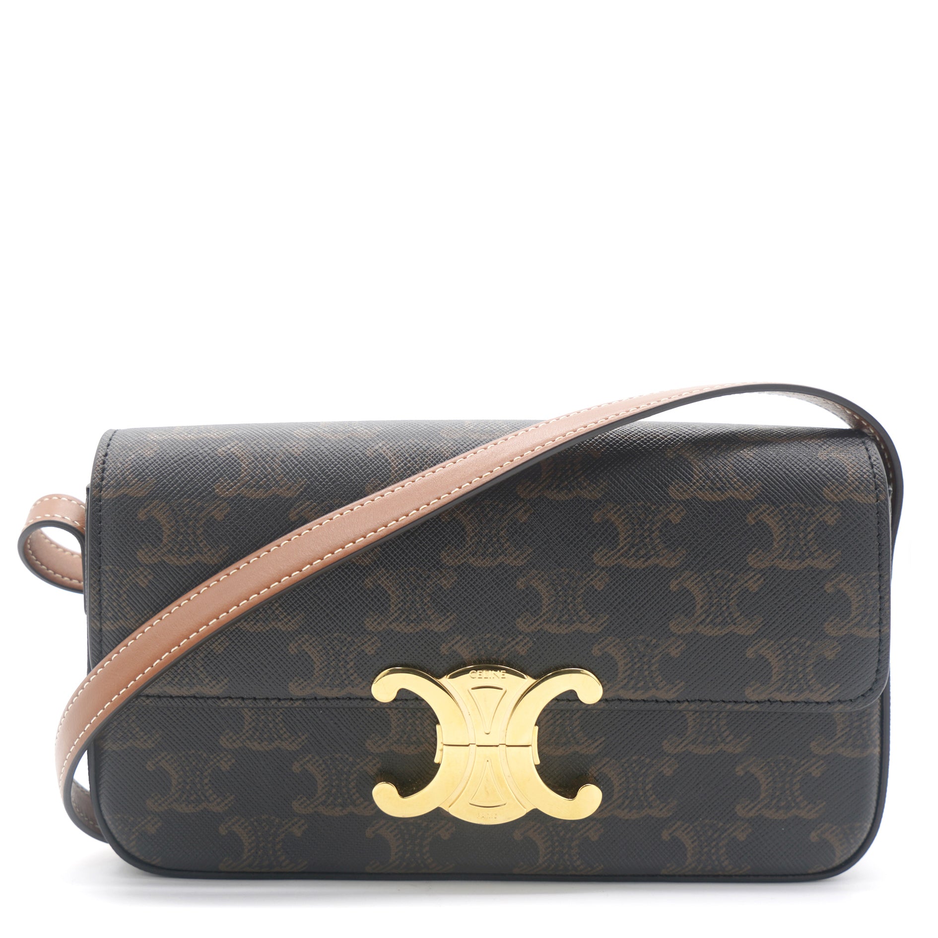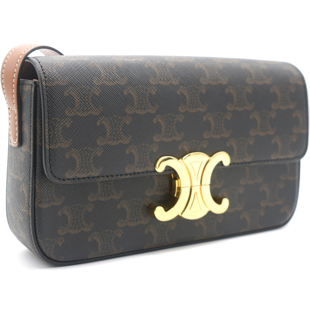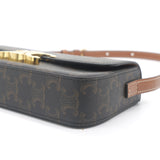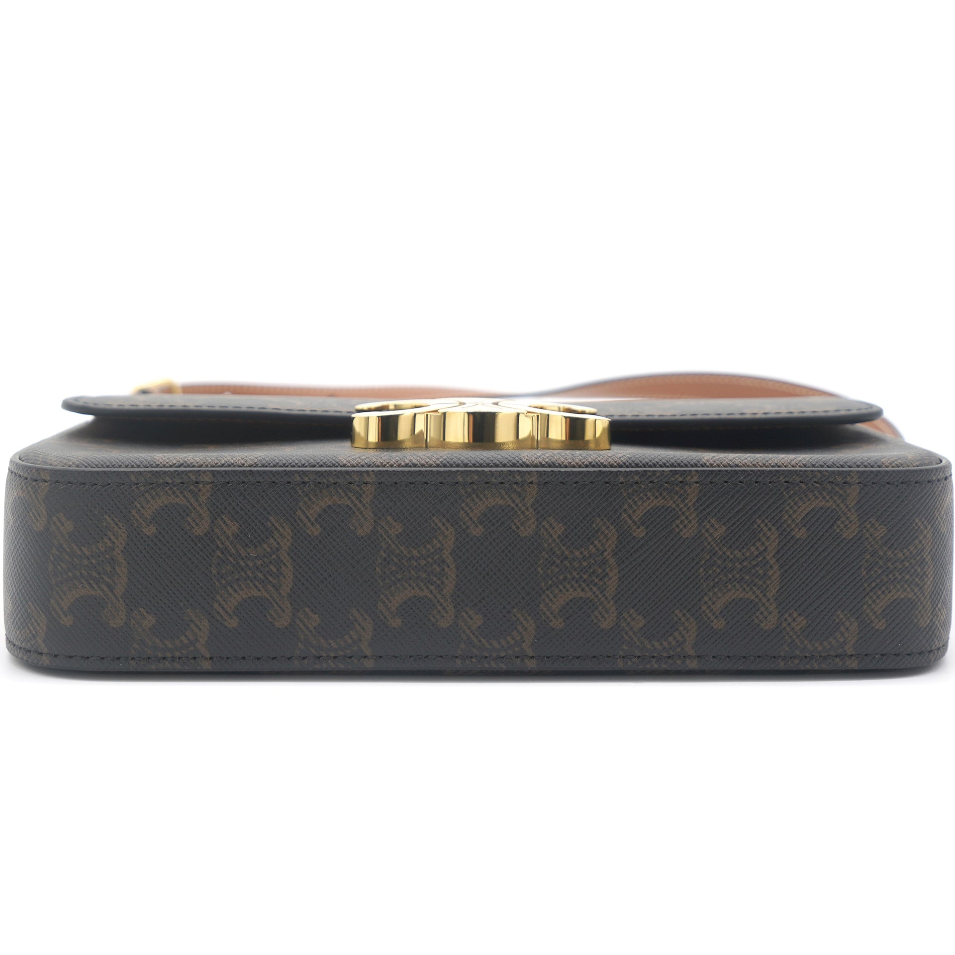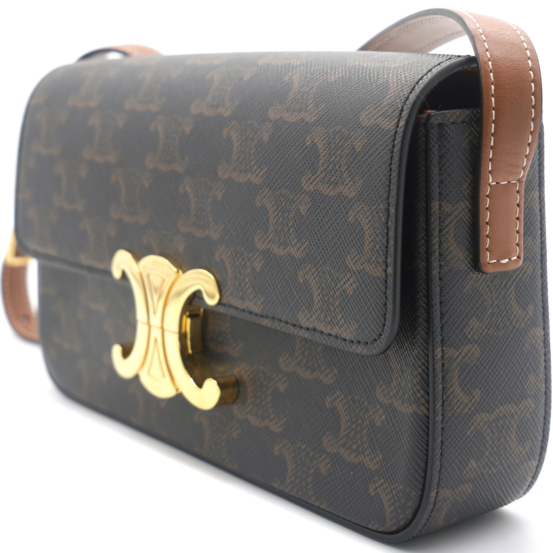 | This statement bag is crafted from signature triomphe canvas and with calfskin tan trimming, finished with gold-toned triomphe logo closure and complete with removeable and adjustable leather strap. |