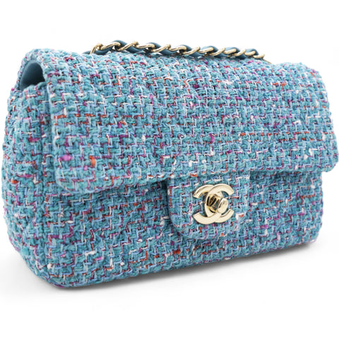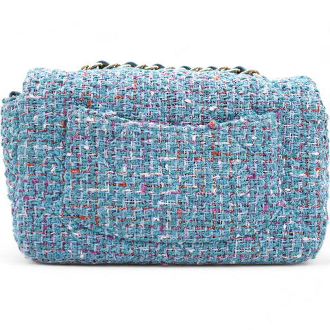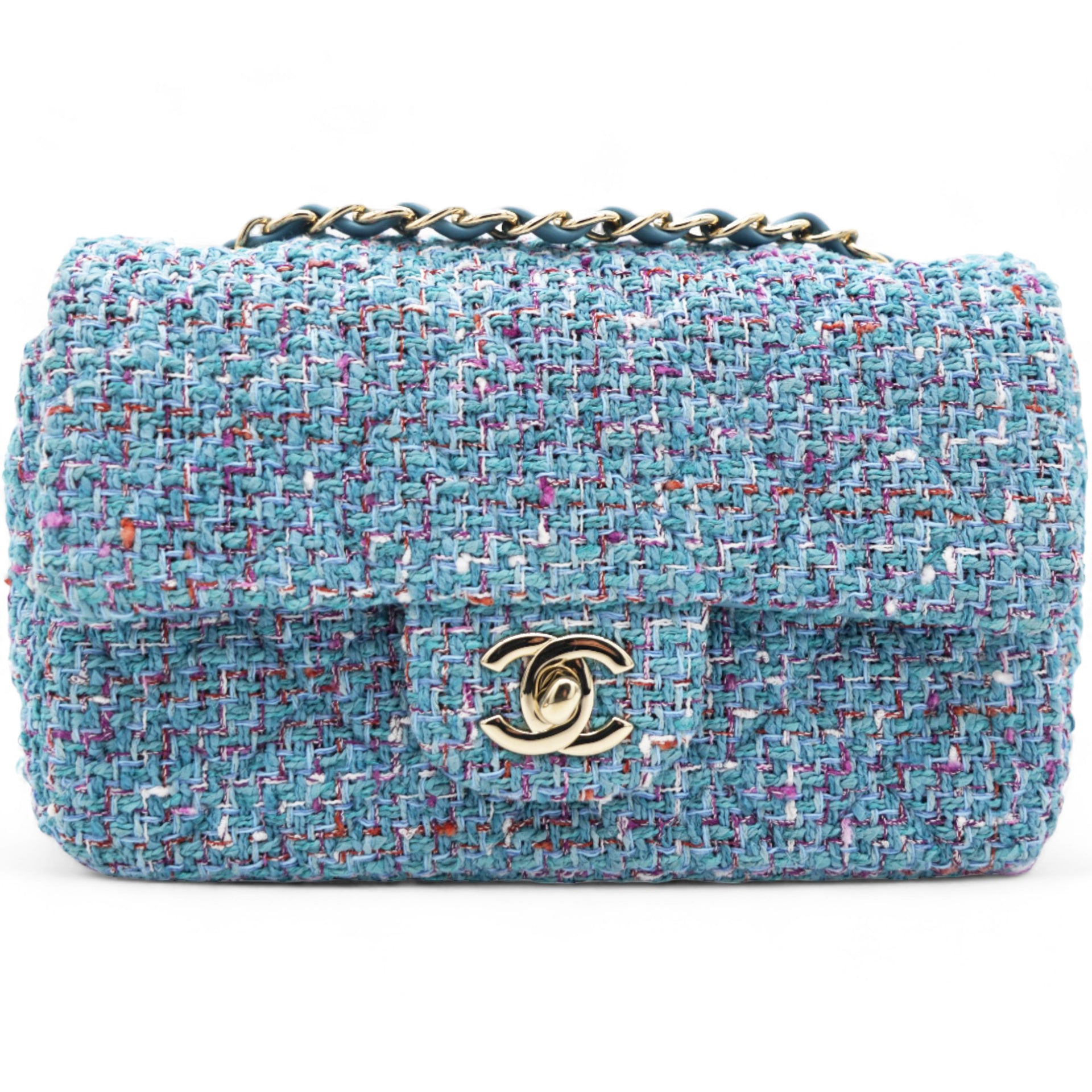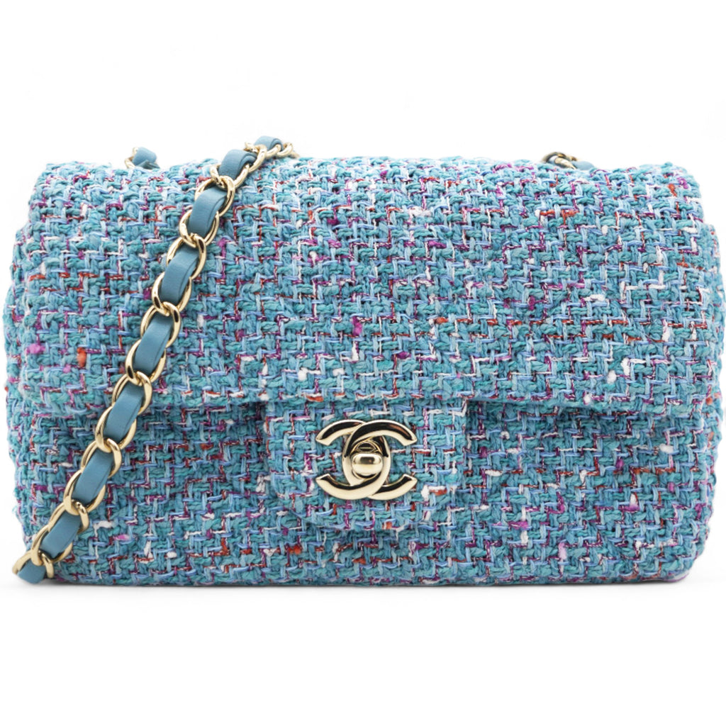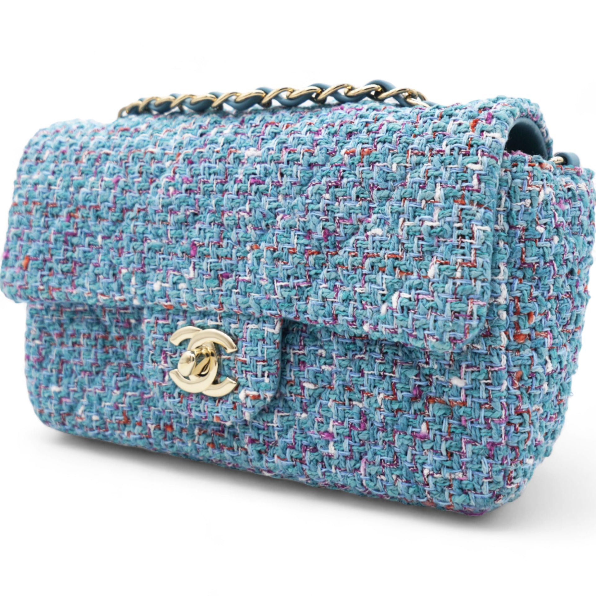| This stunning small crossbody shoulder bag is crafted of blue and multicolor tweed. The bag features a polished gold chain link shoulder strap threaded with blue leather and a frontal flap with a polished gold Chanel CC turn lock. This opens to a compact blue leather interior with zipper and patch pockets. |