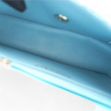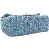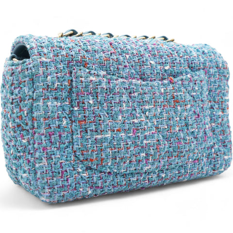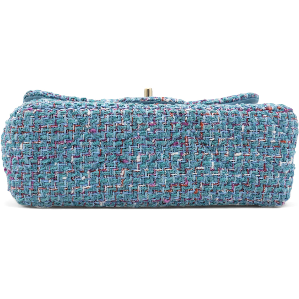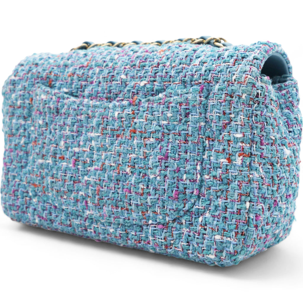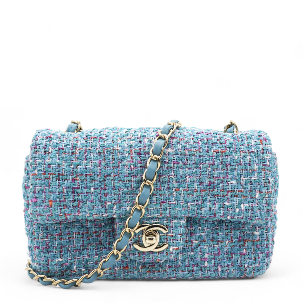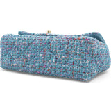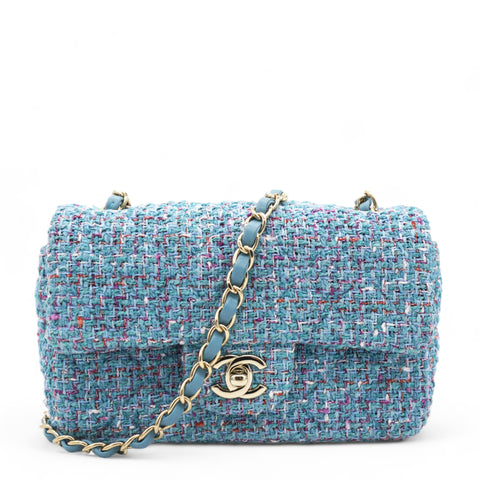 | This stunning small crossbody shoulder bag is crafted of blue and multicolor tweed. The bag features a polished gold chain link shoulder strap threaded with blue leather and a frontal flap with a polished gold Chanel CC turn lock. This opens to a compact blue leather interior with zipper and patch pockets. |