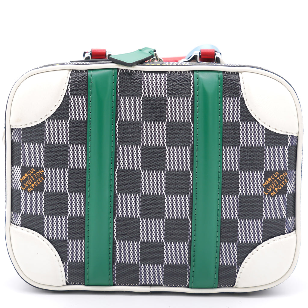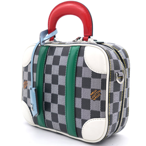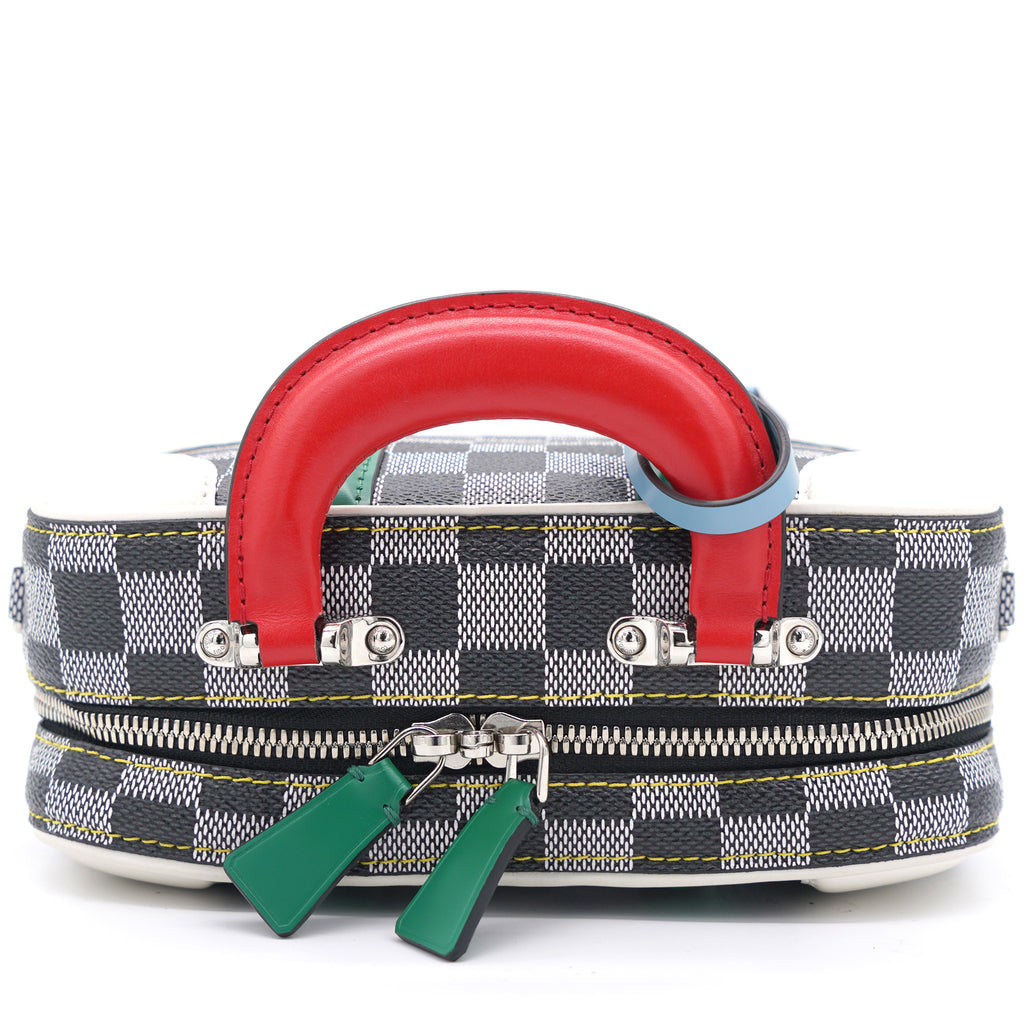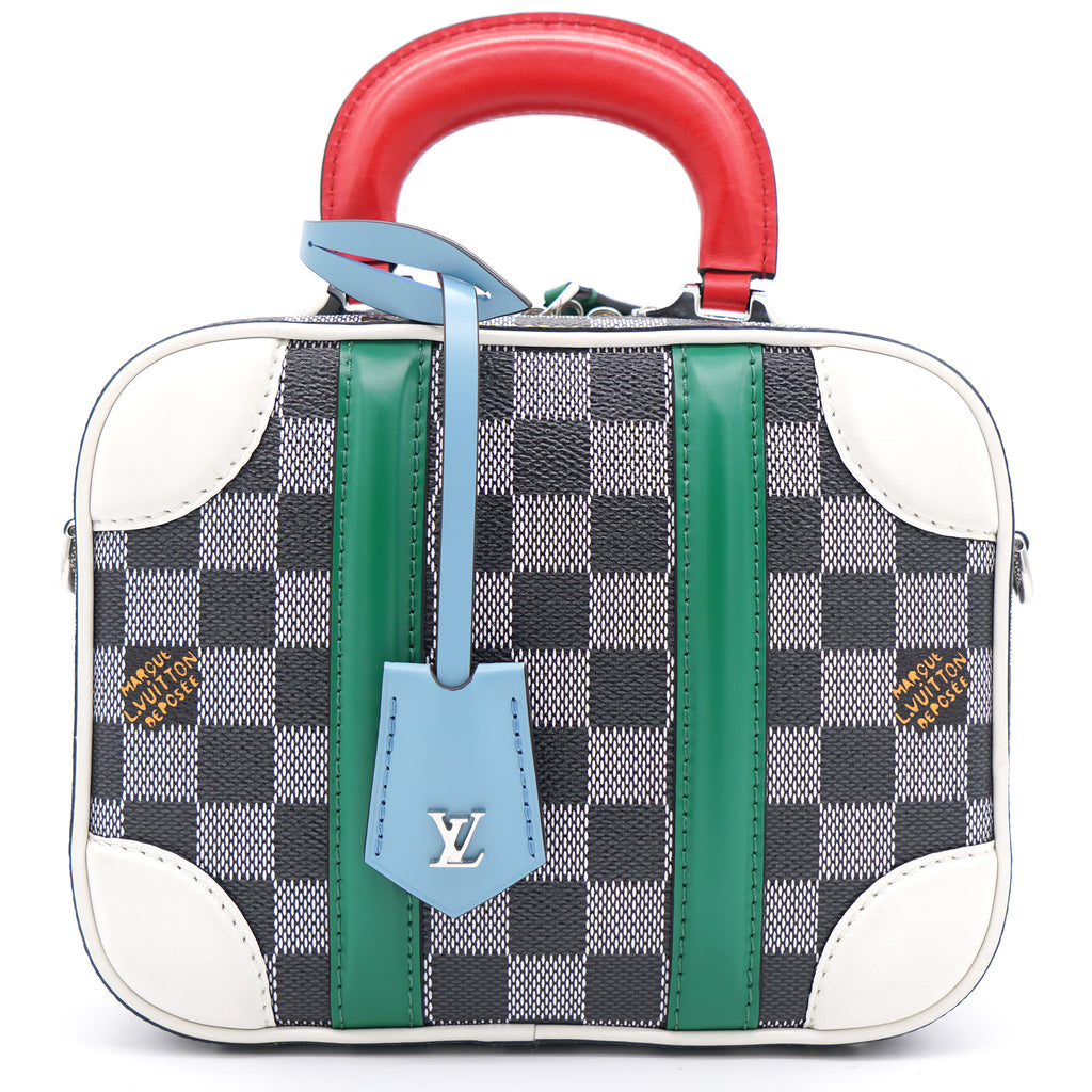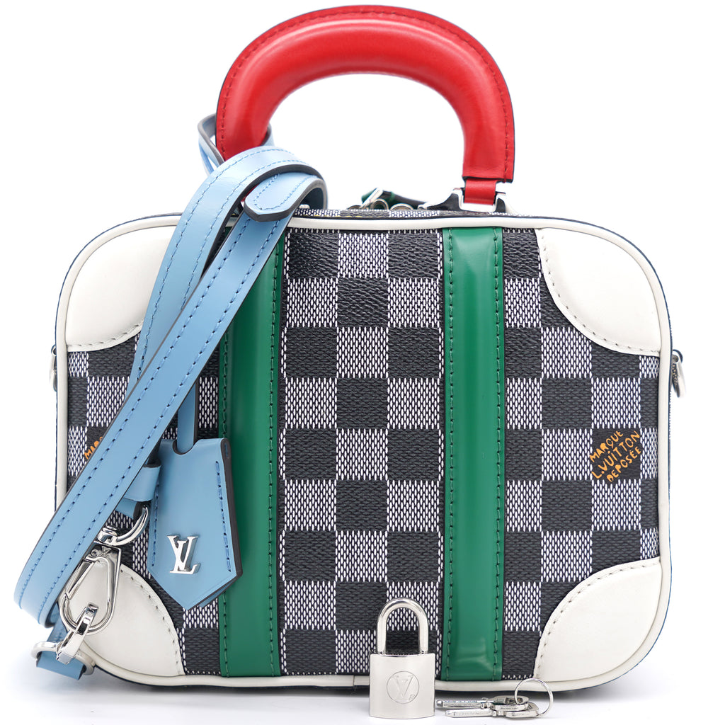 | Nicolas Ghesquière’s new black-and-white reinterpretation of classic Damier canvas is complemented by colorful calf-leather details on this Valisette BB handbag. Inspired by the House’s travel heritage, this structured bag evokes the suitcases created by the House in the middle of the last century. The top handle and removeable strap offer multiple carry options. |